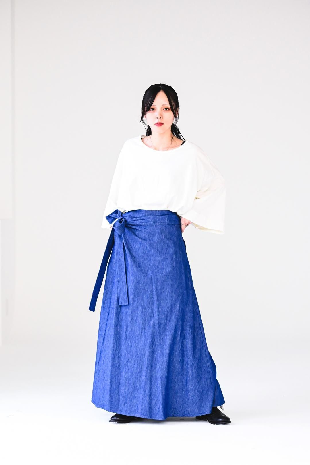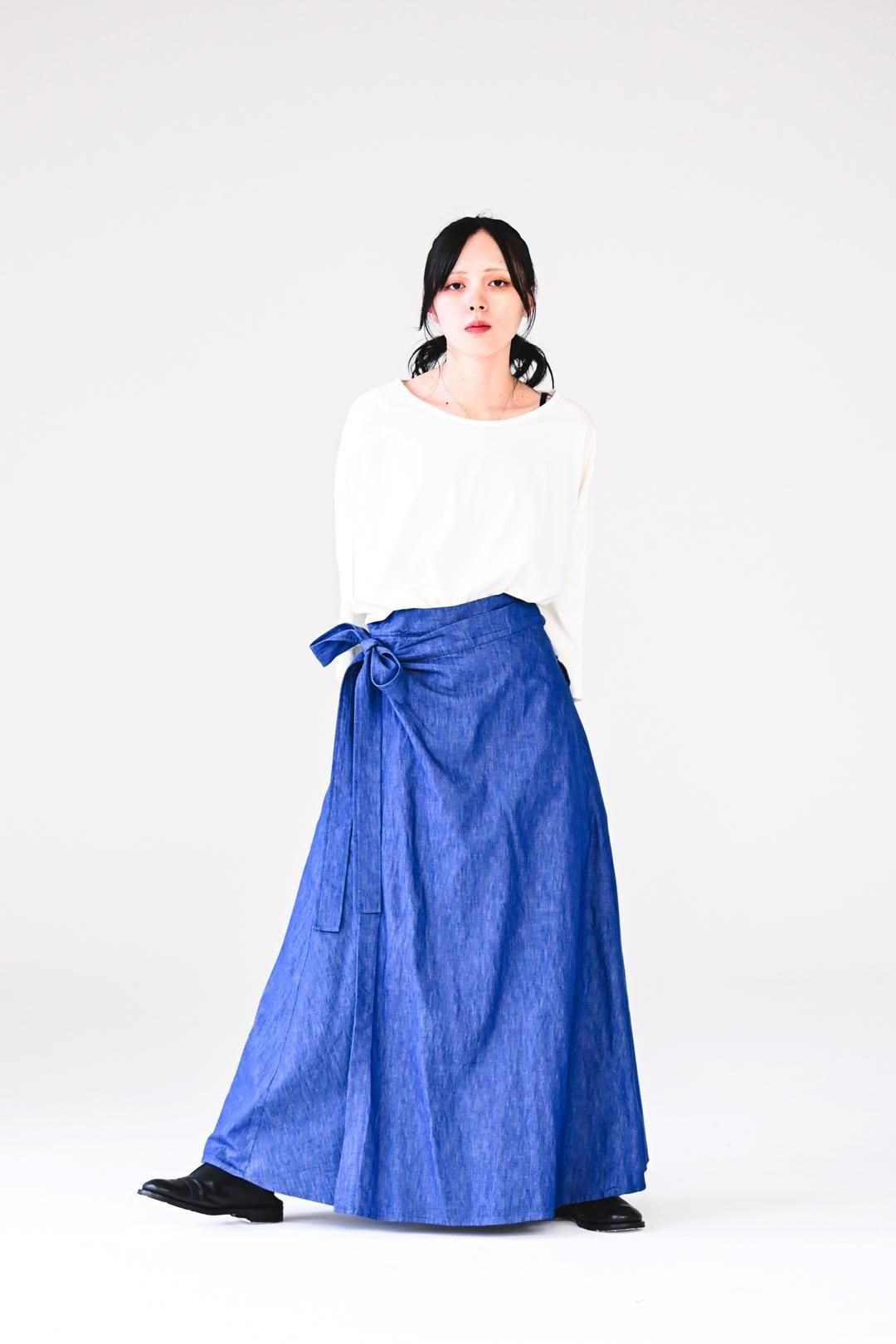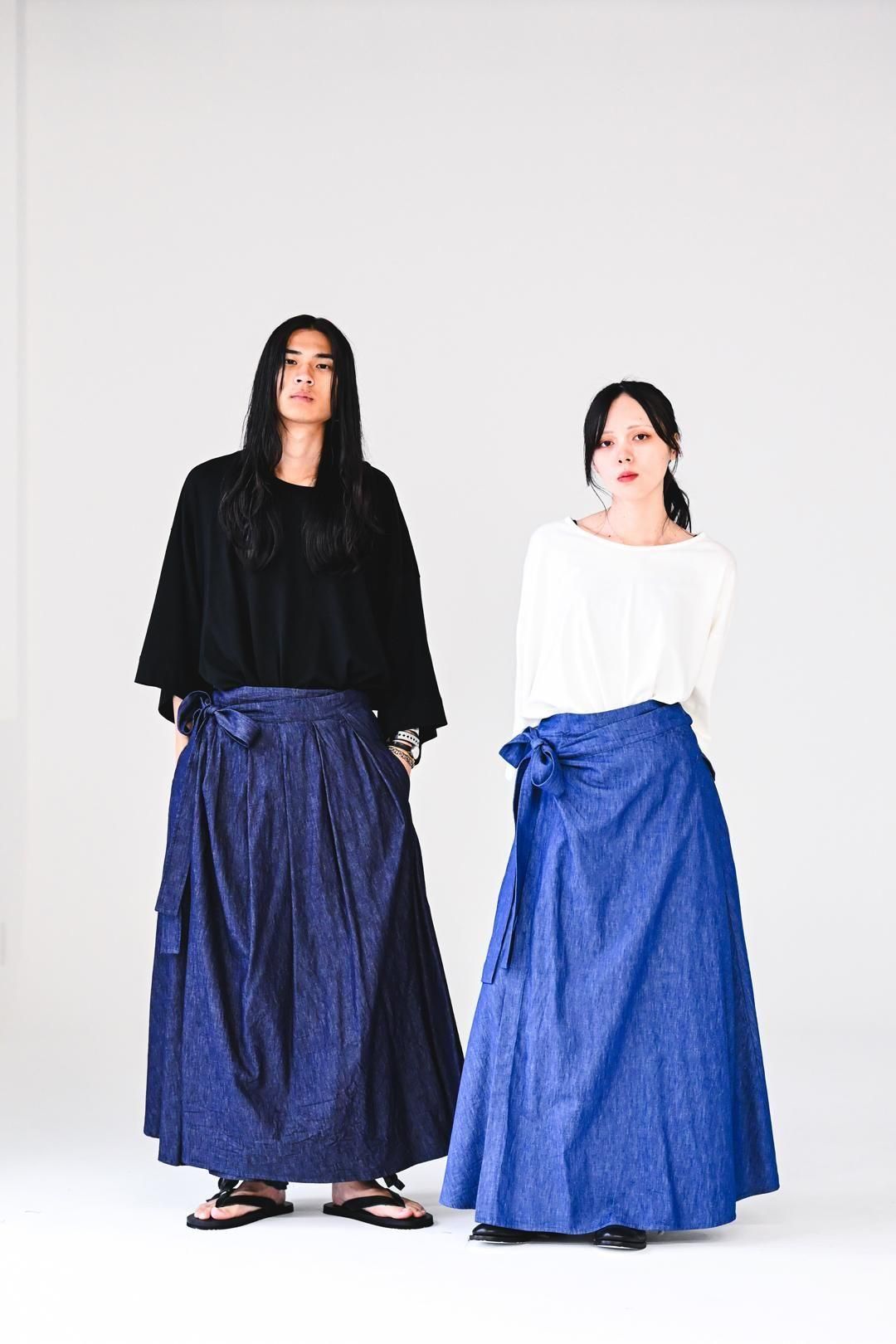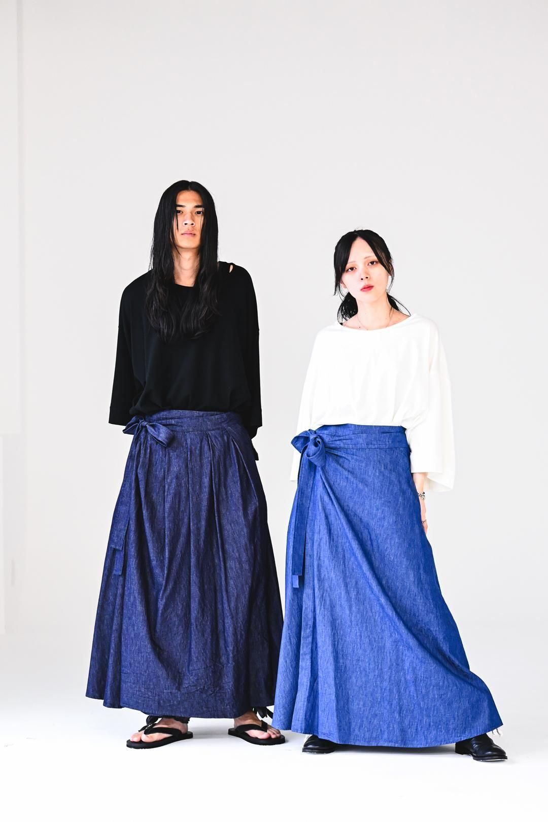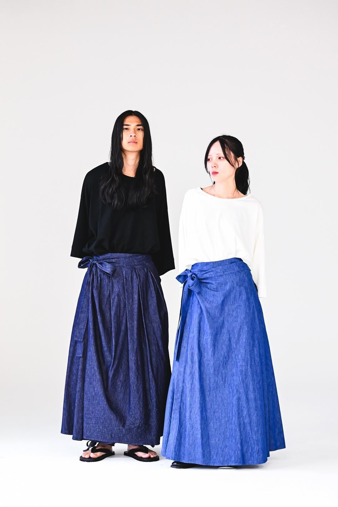 デニムの産地"福山"で織られたライトオンスデニム生地で仕立てたユニセックス巻きスカート。