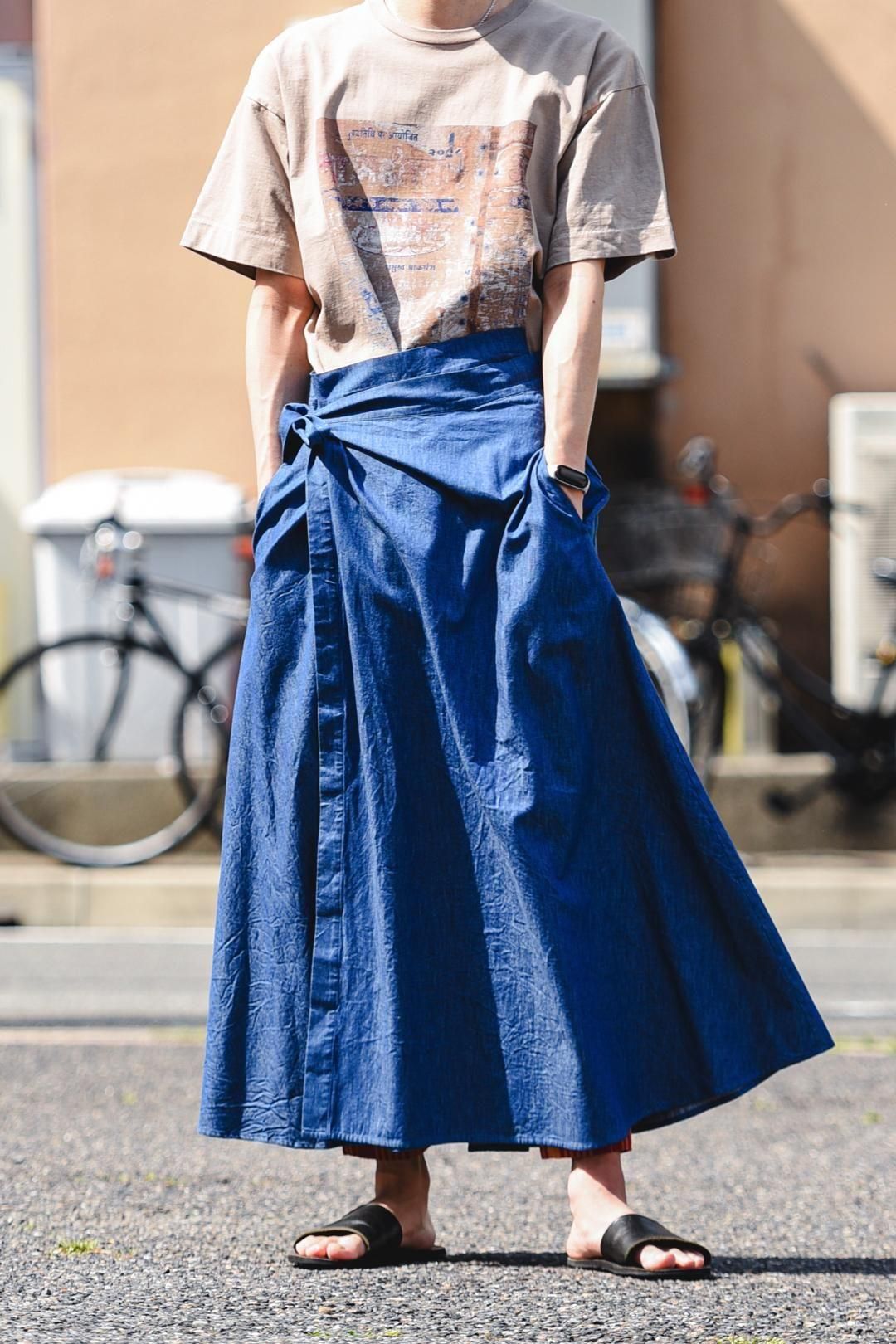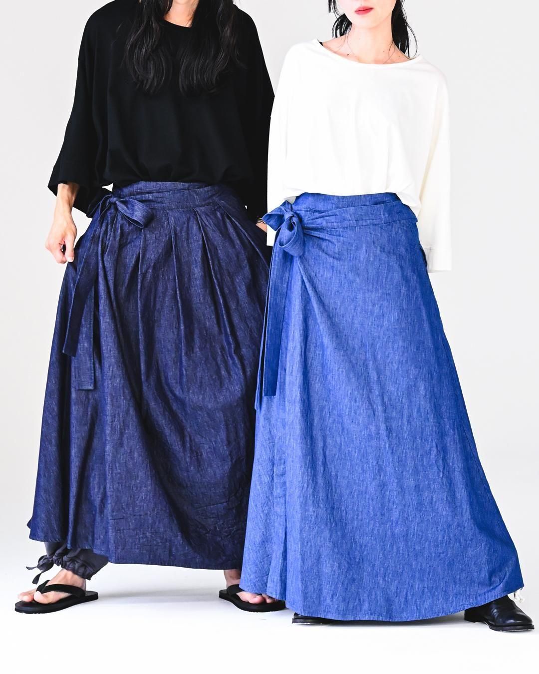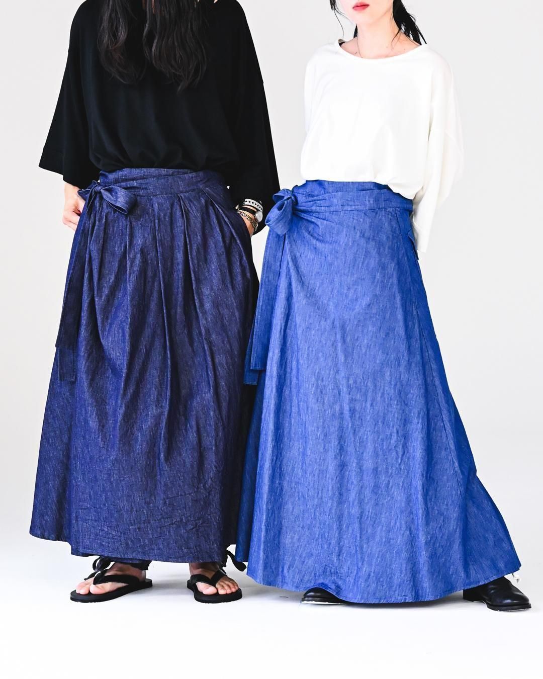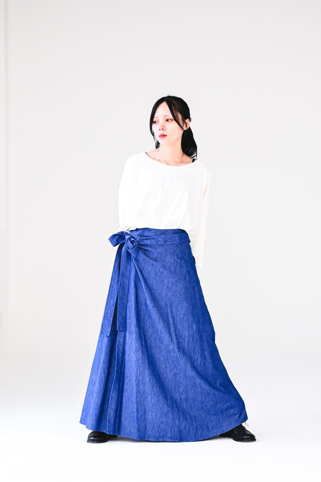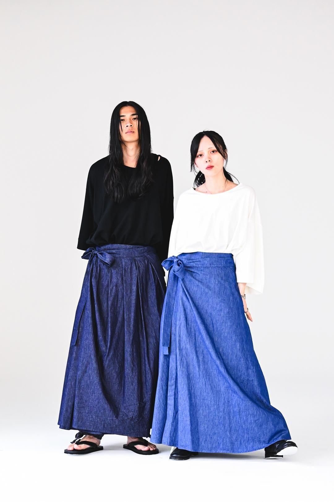 デニムの産地"福山"で織られたライトオンスデニム生地で仕立てたユニセックス巻きスカート。
