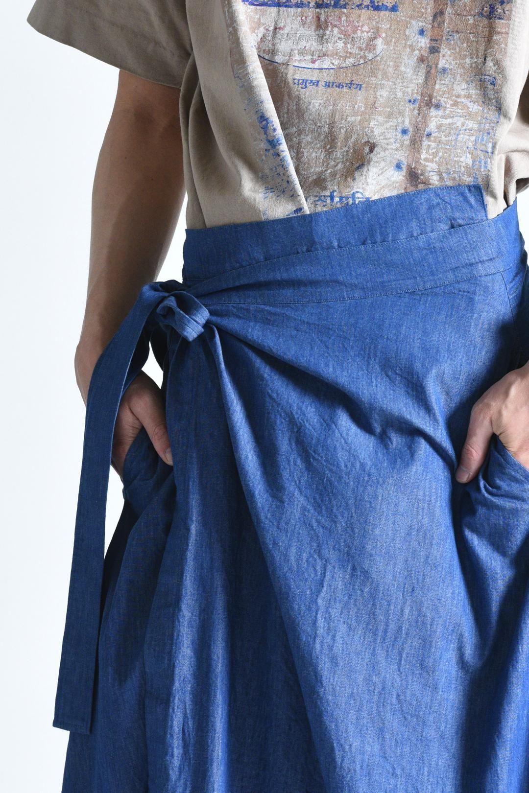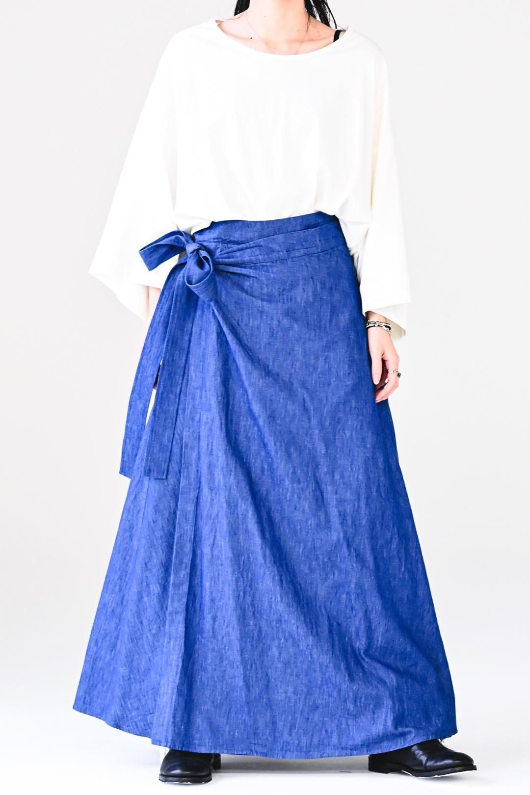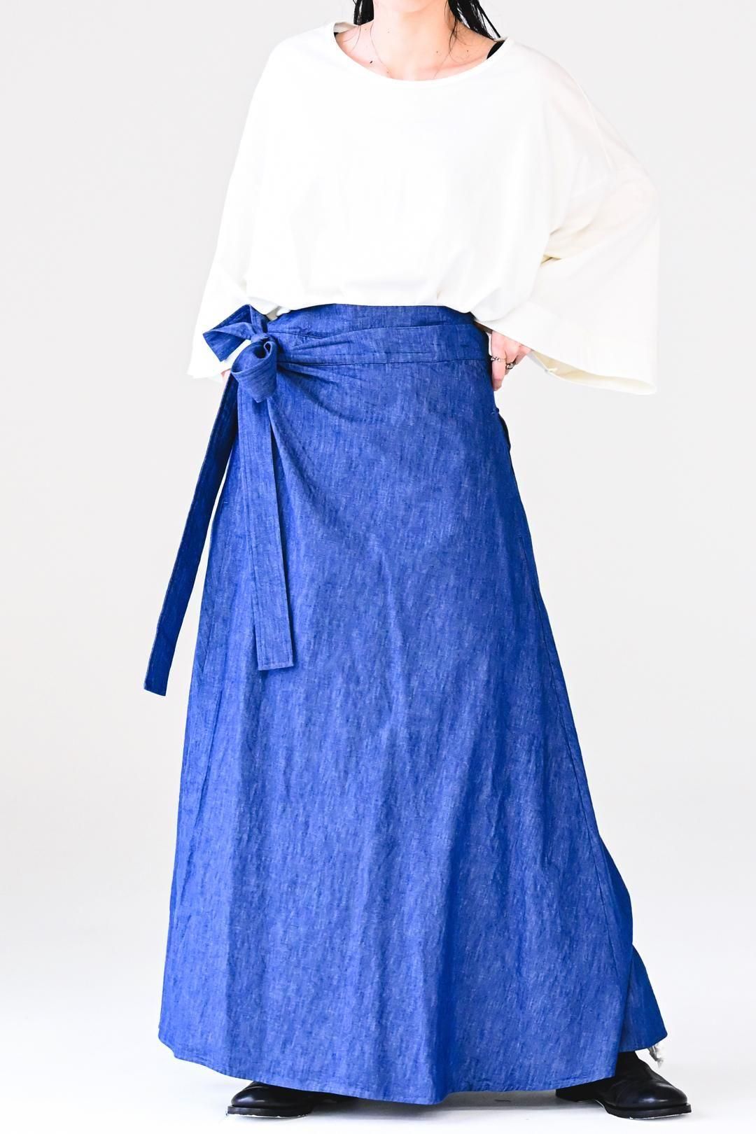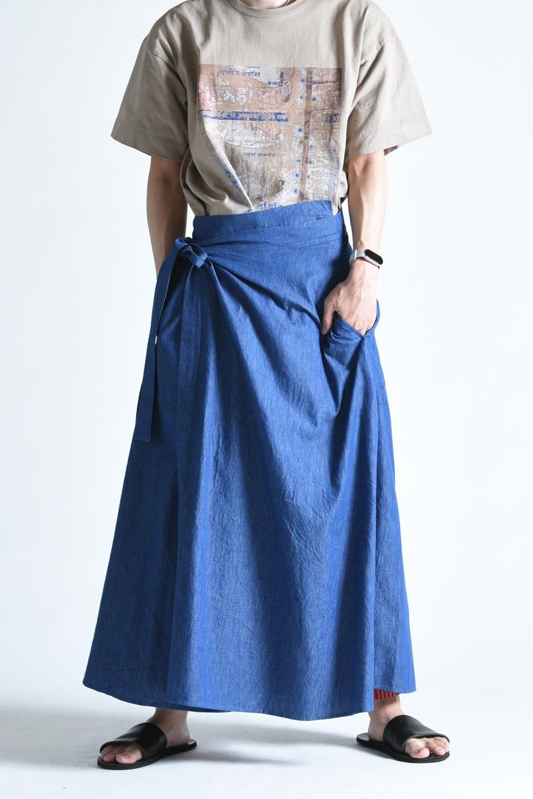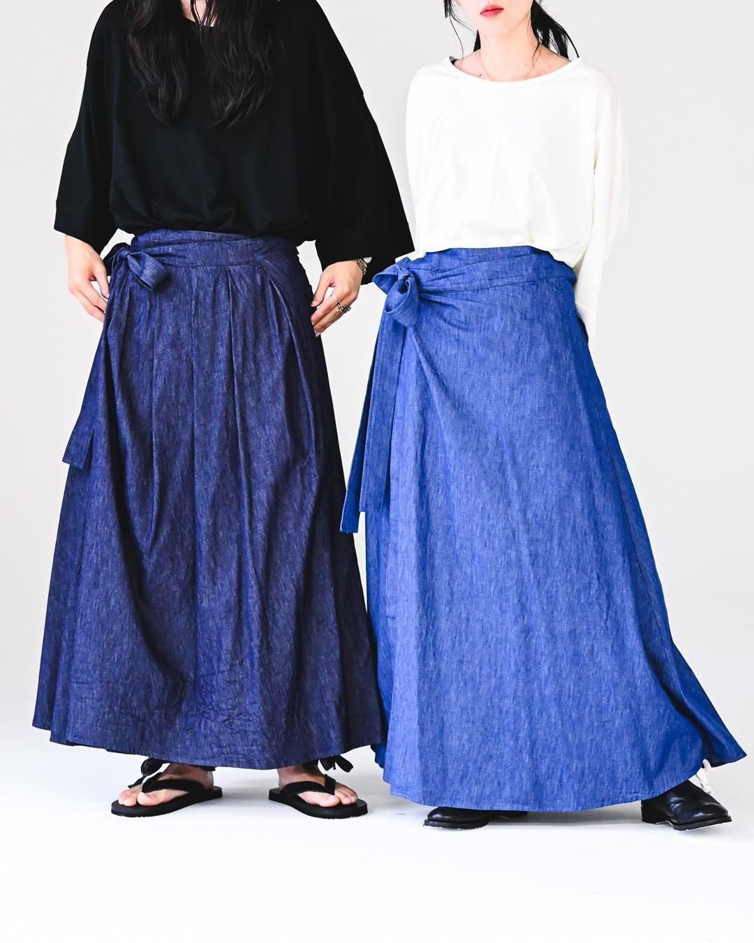 デニムの産地"福山"で織られたライトオンスデニム生地で仕立てたユニセックス巻きスカート。