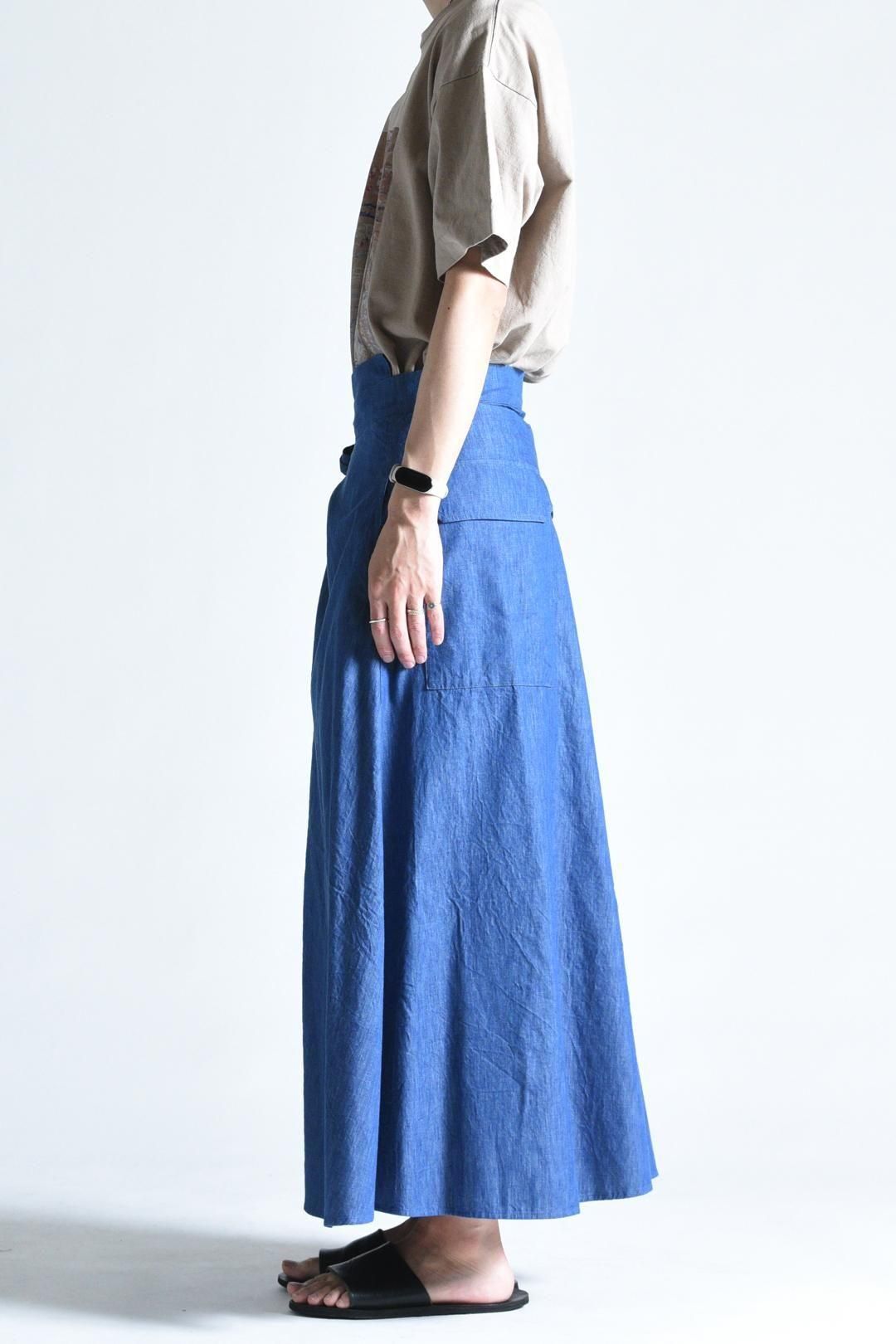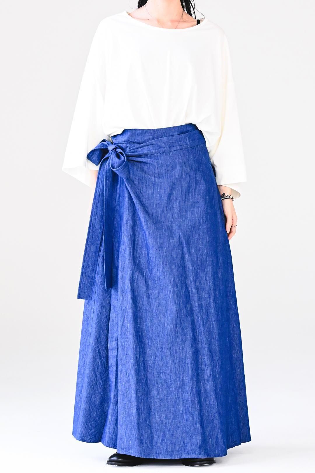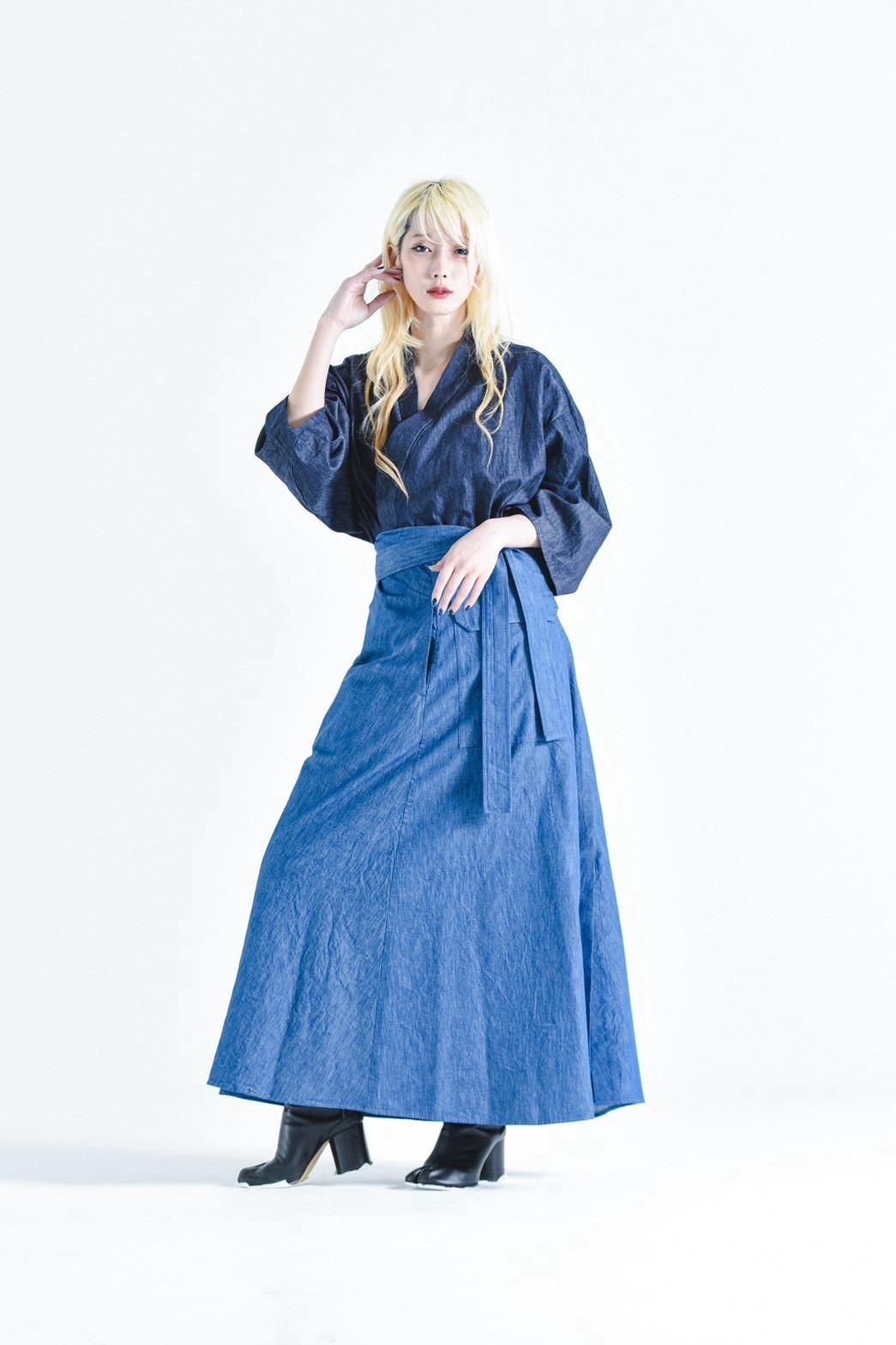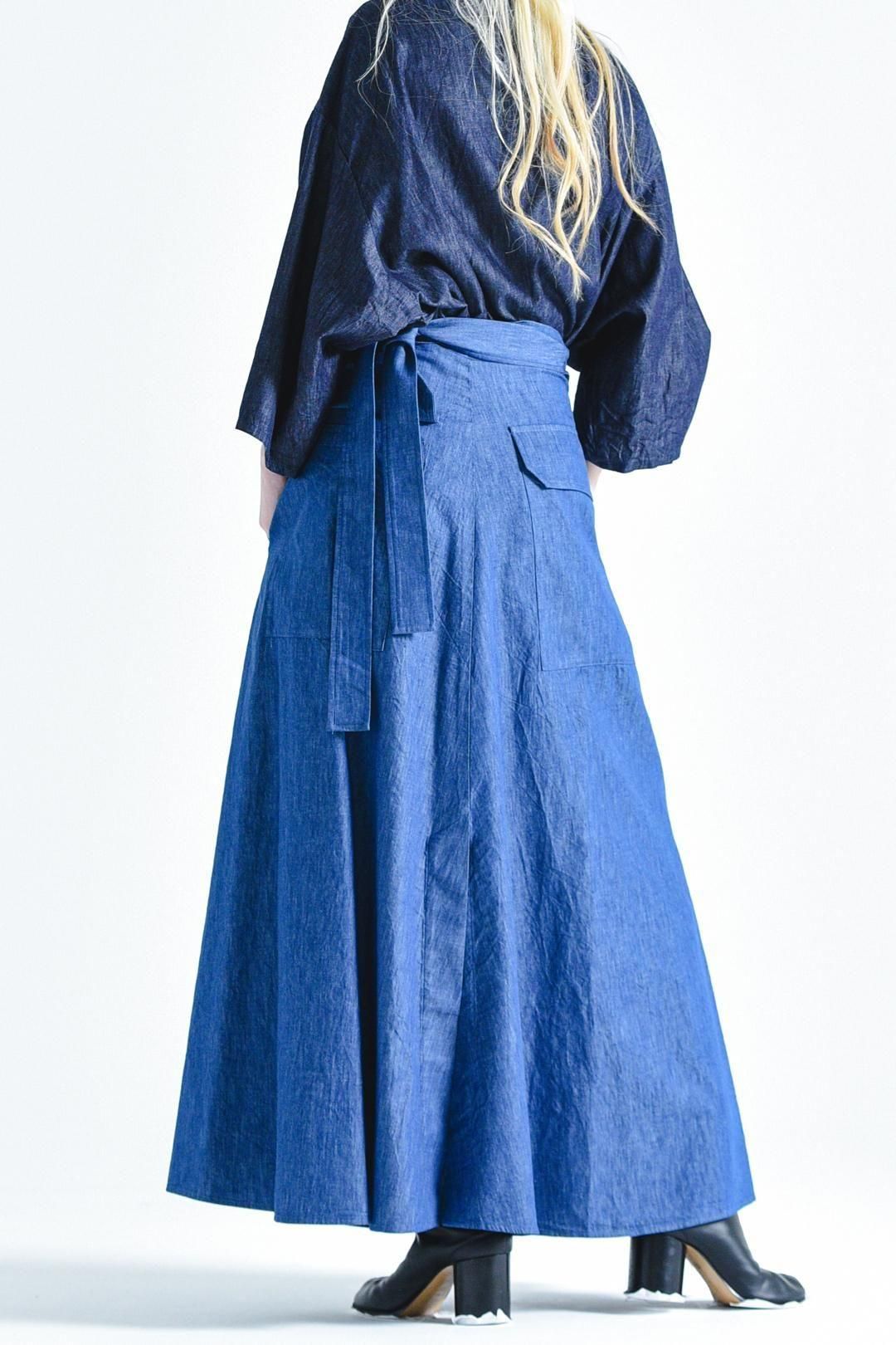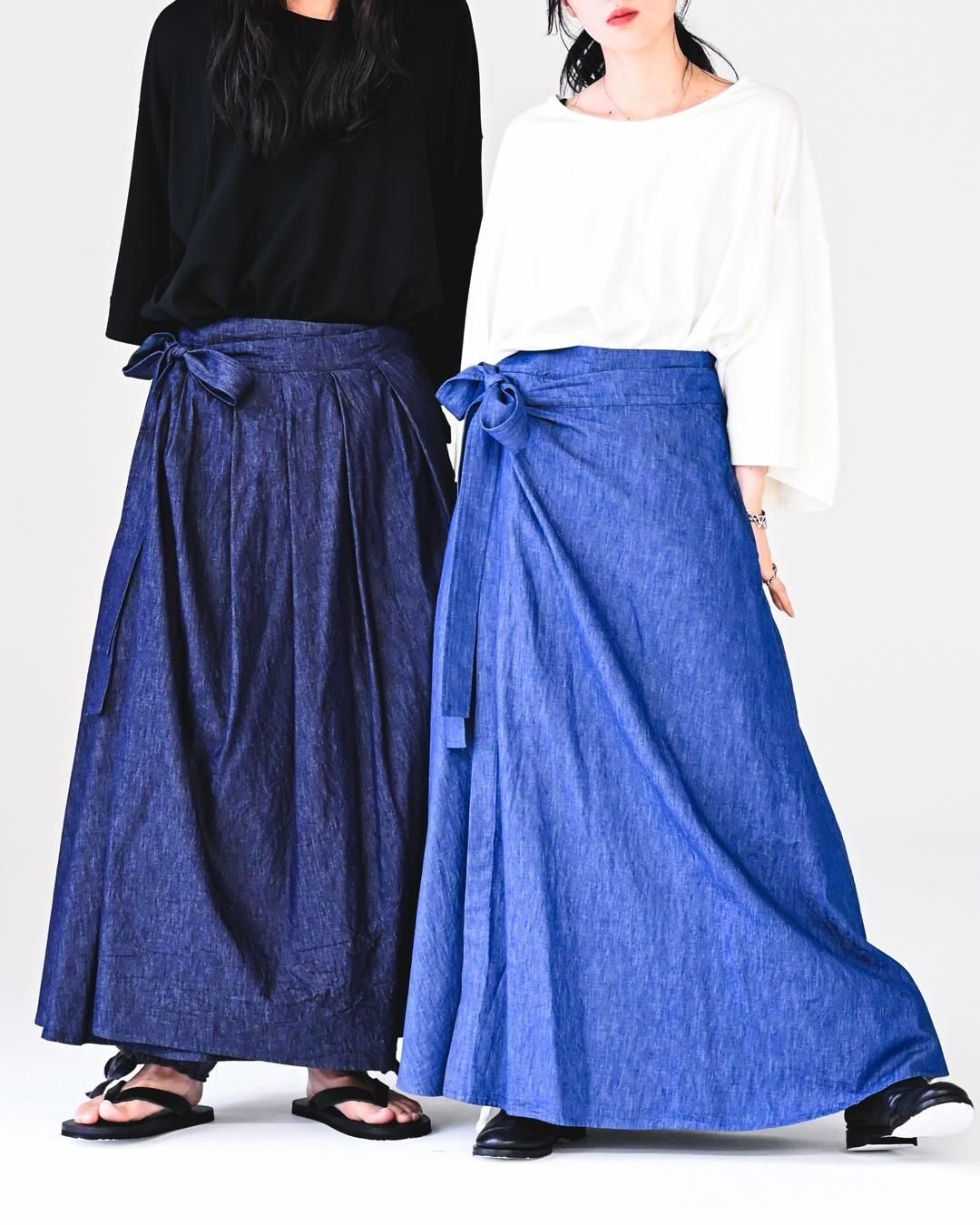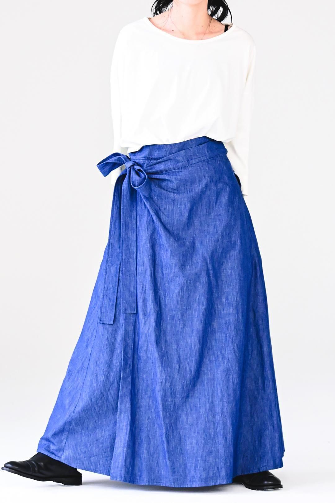デニムの産地"福山"で織られたライトオンスデニム生地で仕立てたユニセックス巻きスカート。