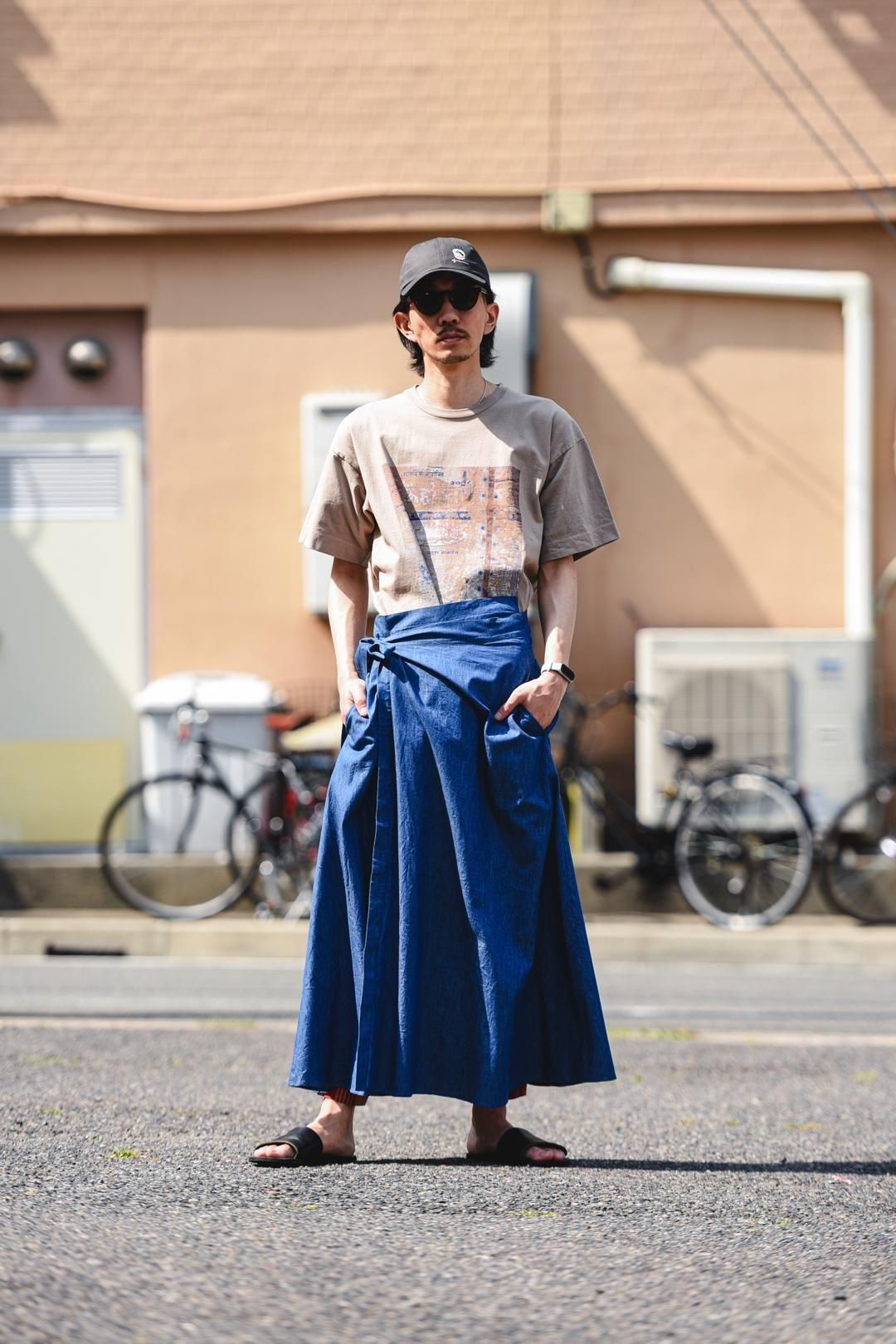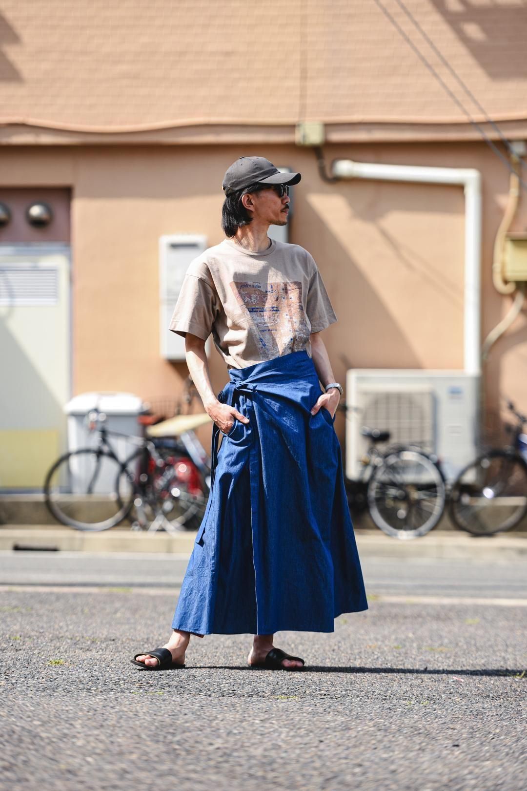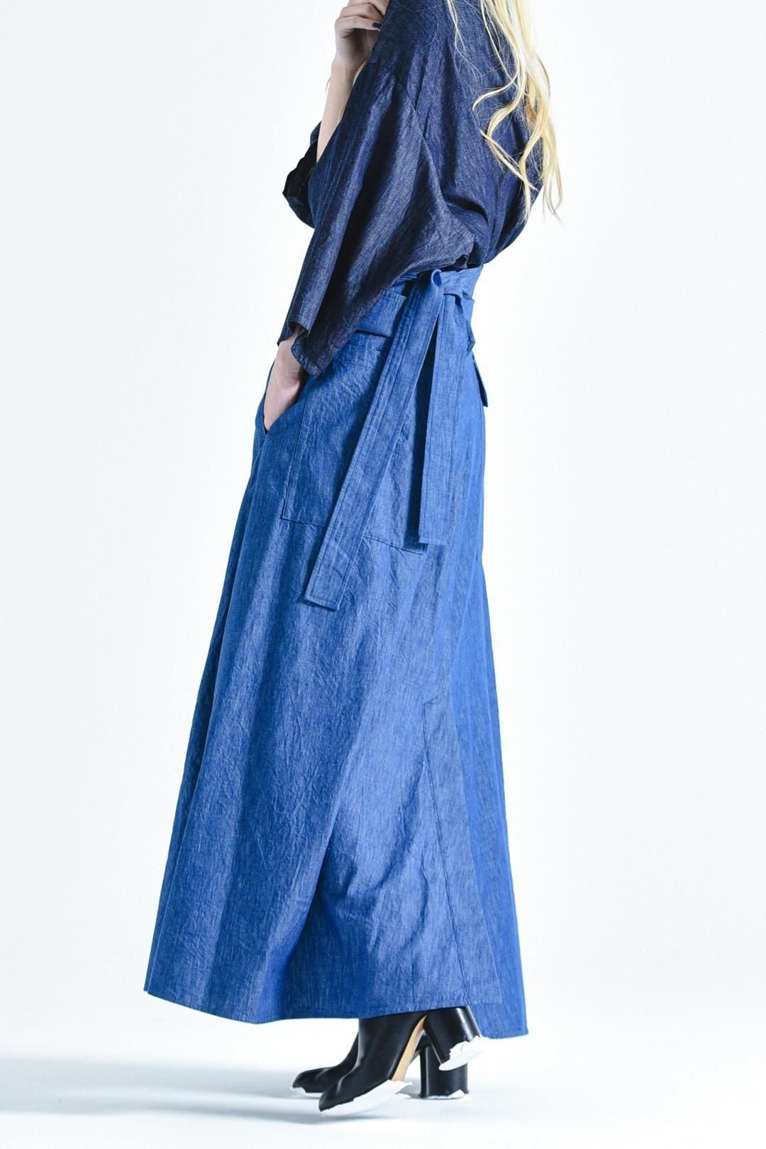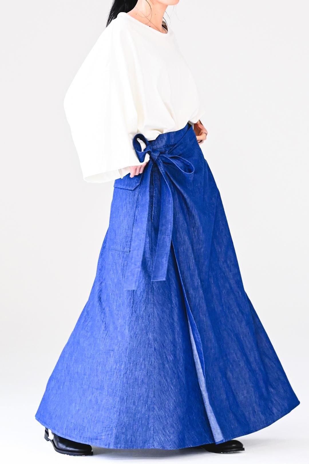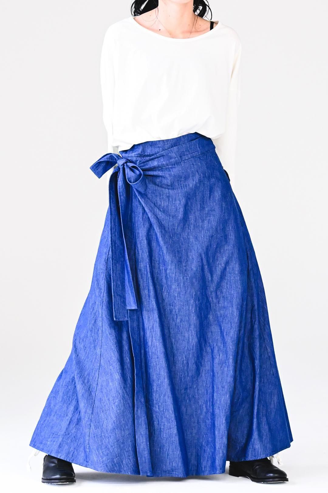 デニムの産地"福山"で織られたライトオンスデニム生地で仕立てたユニセックス巻きスカート。