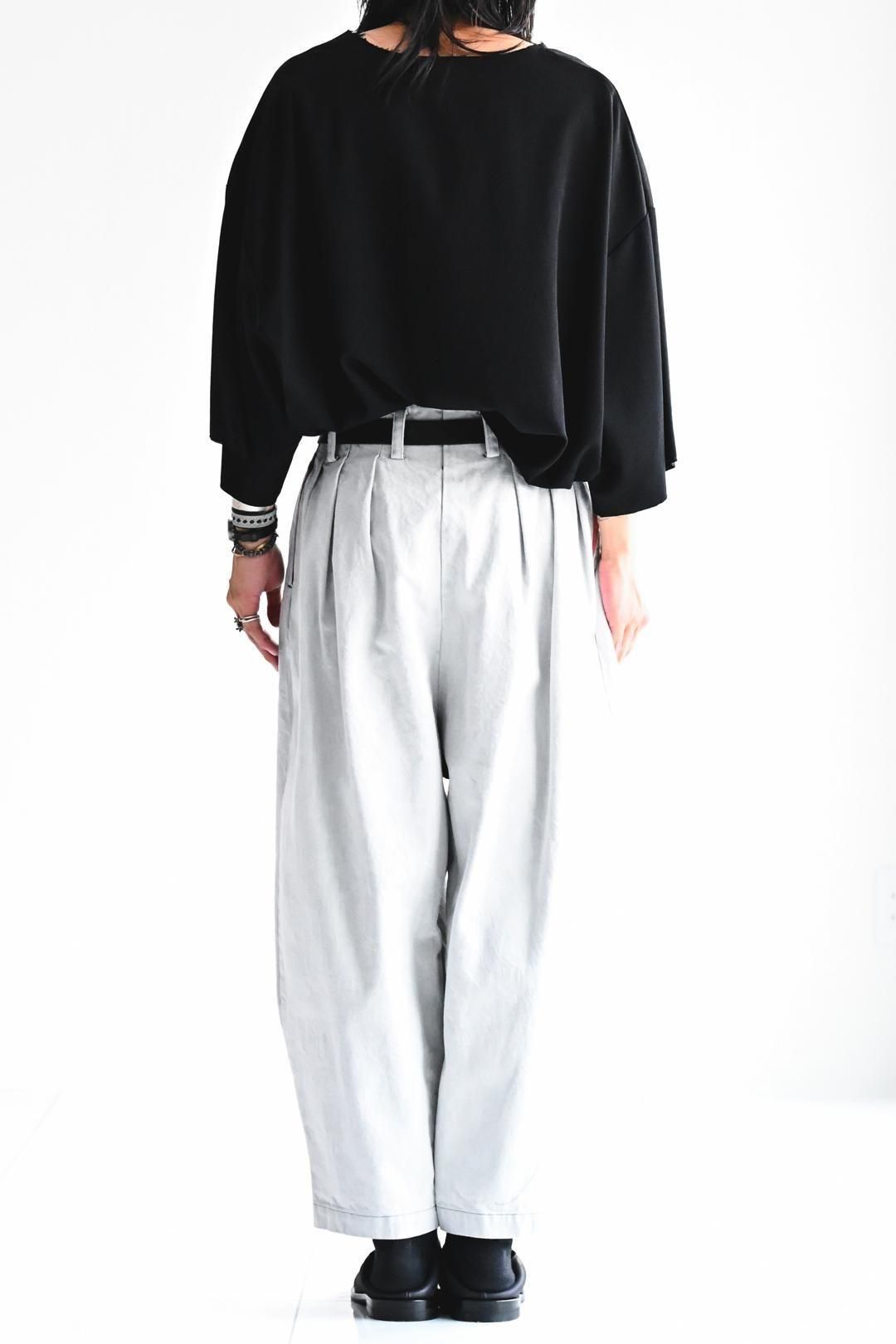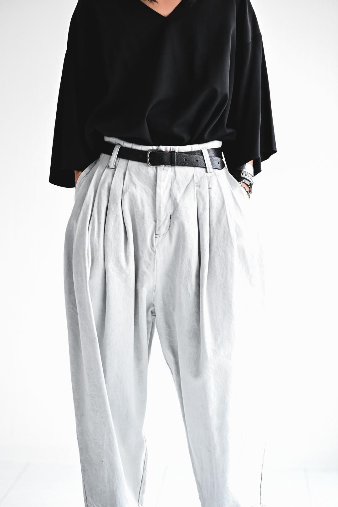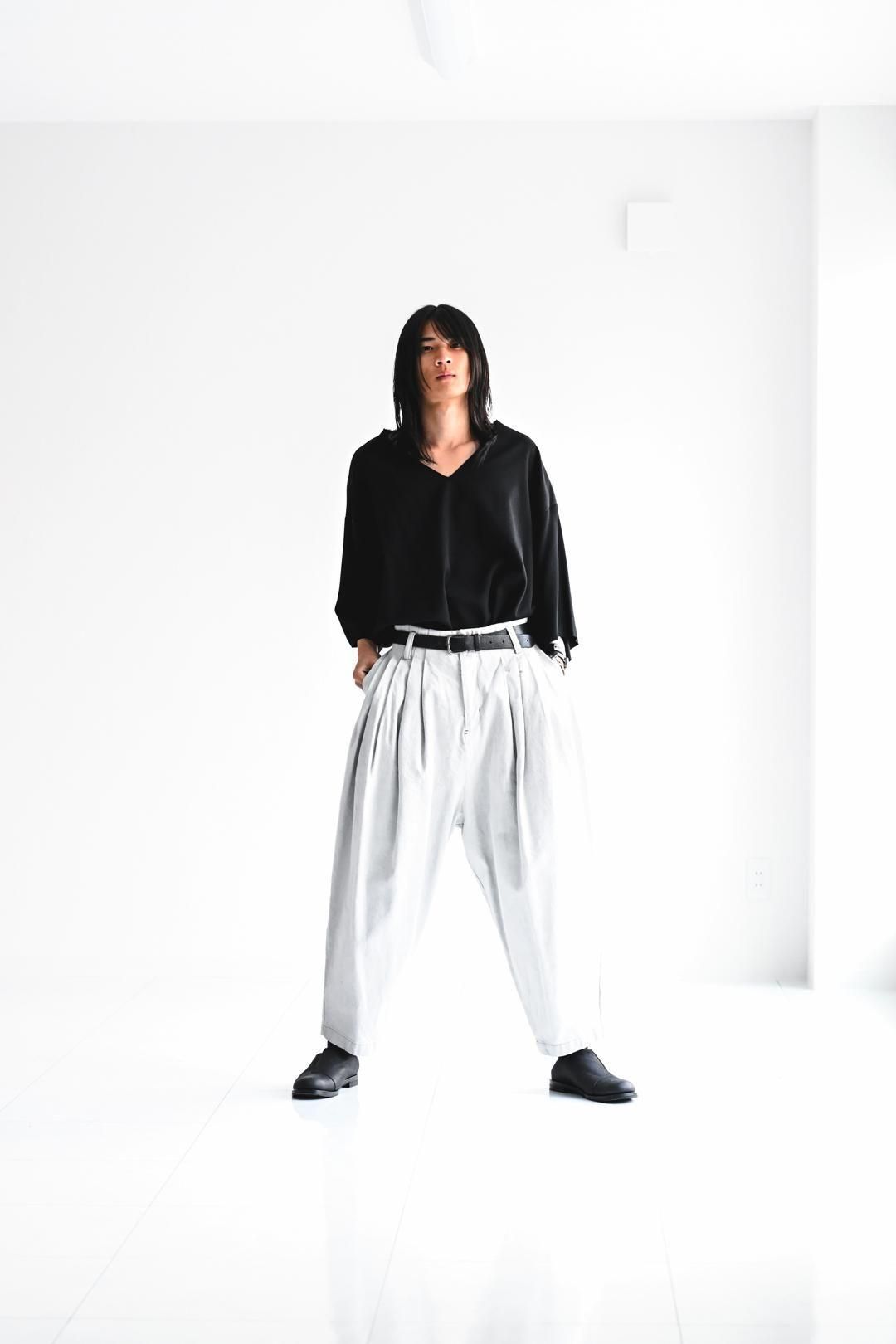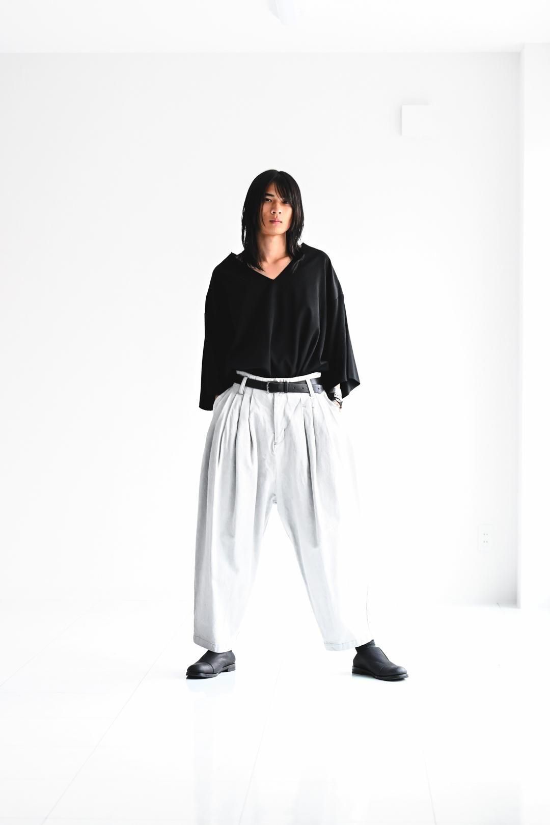 ブリーチ加工を施したブラックデニム生地を用いて表現したワイドパンツ。
