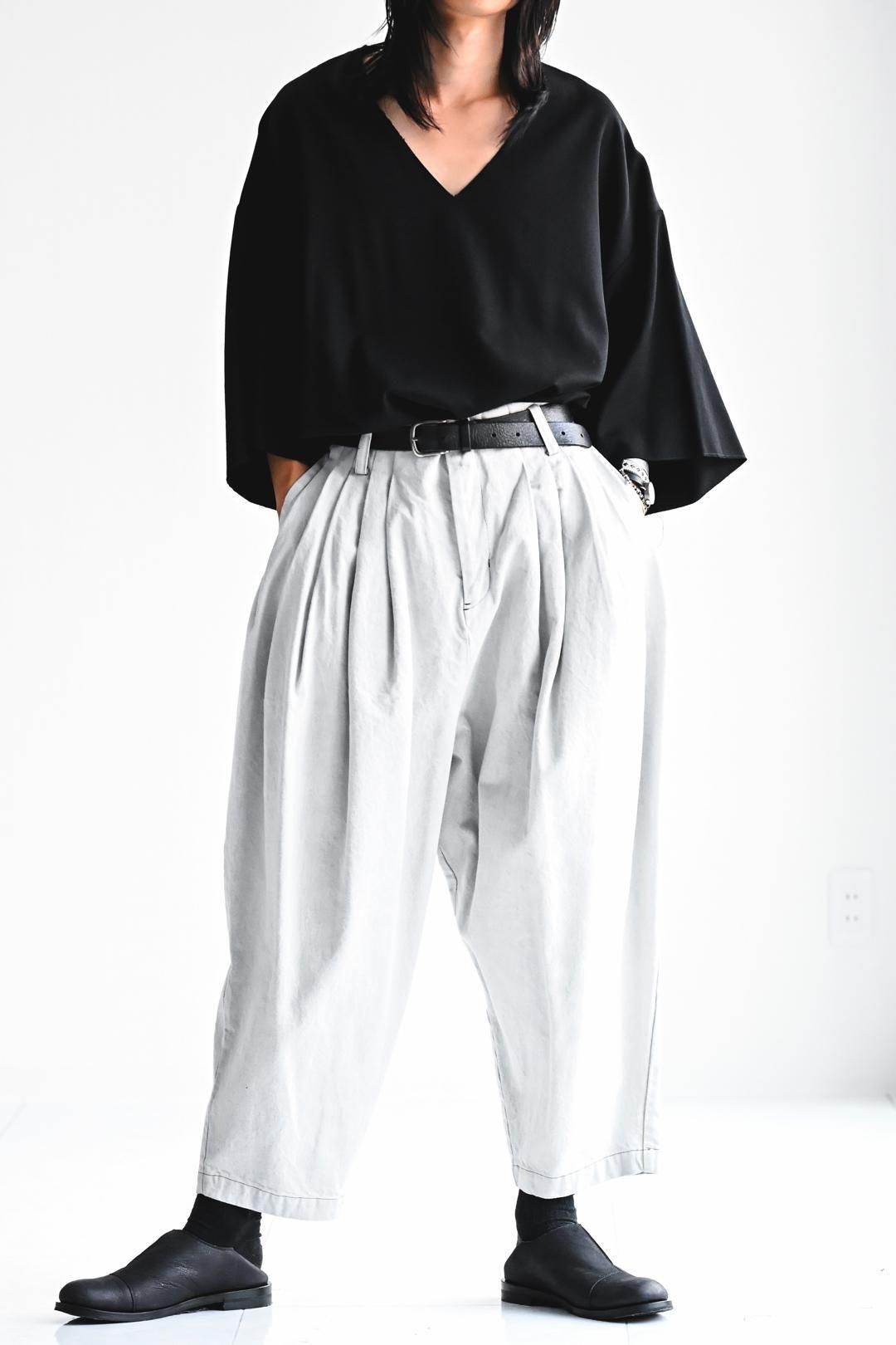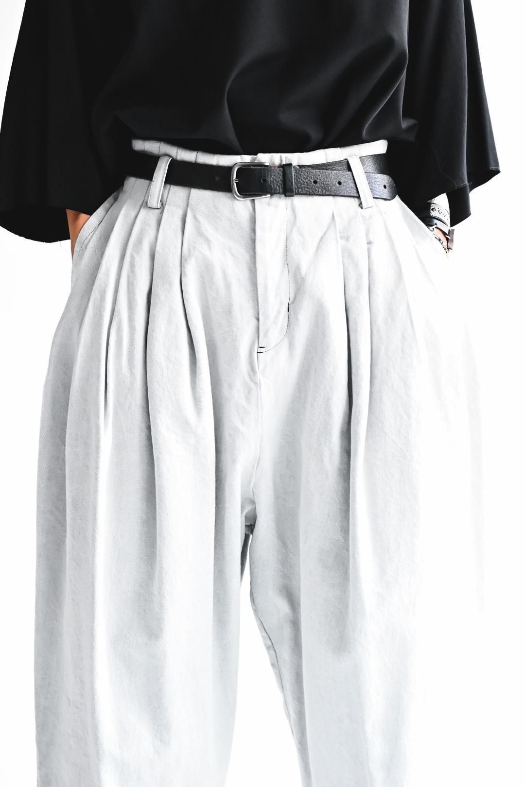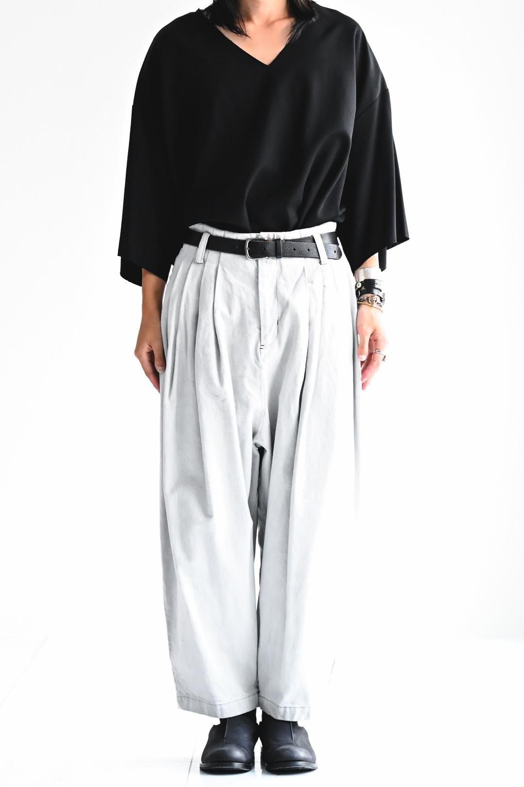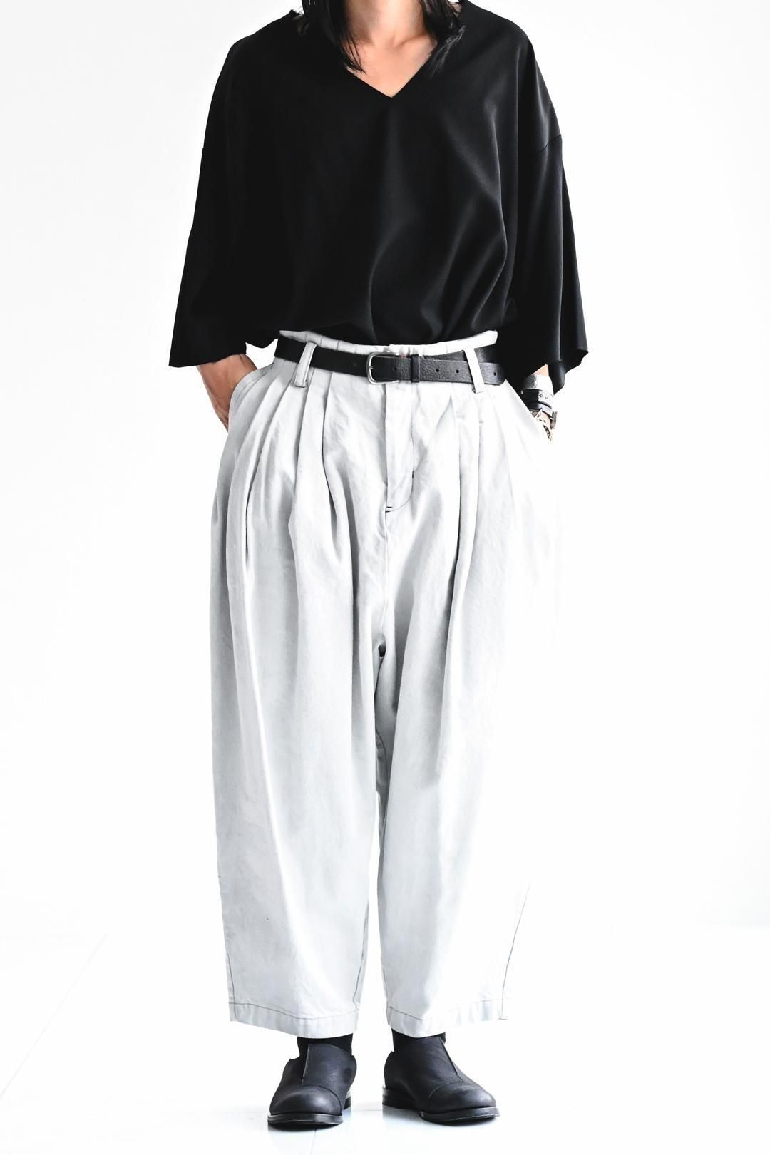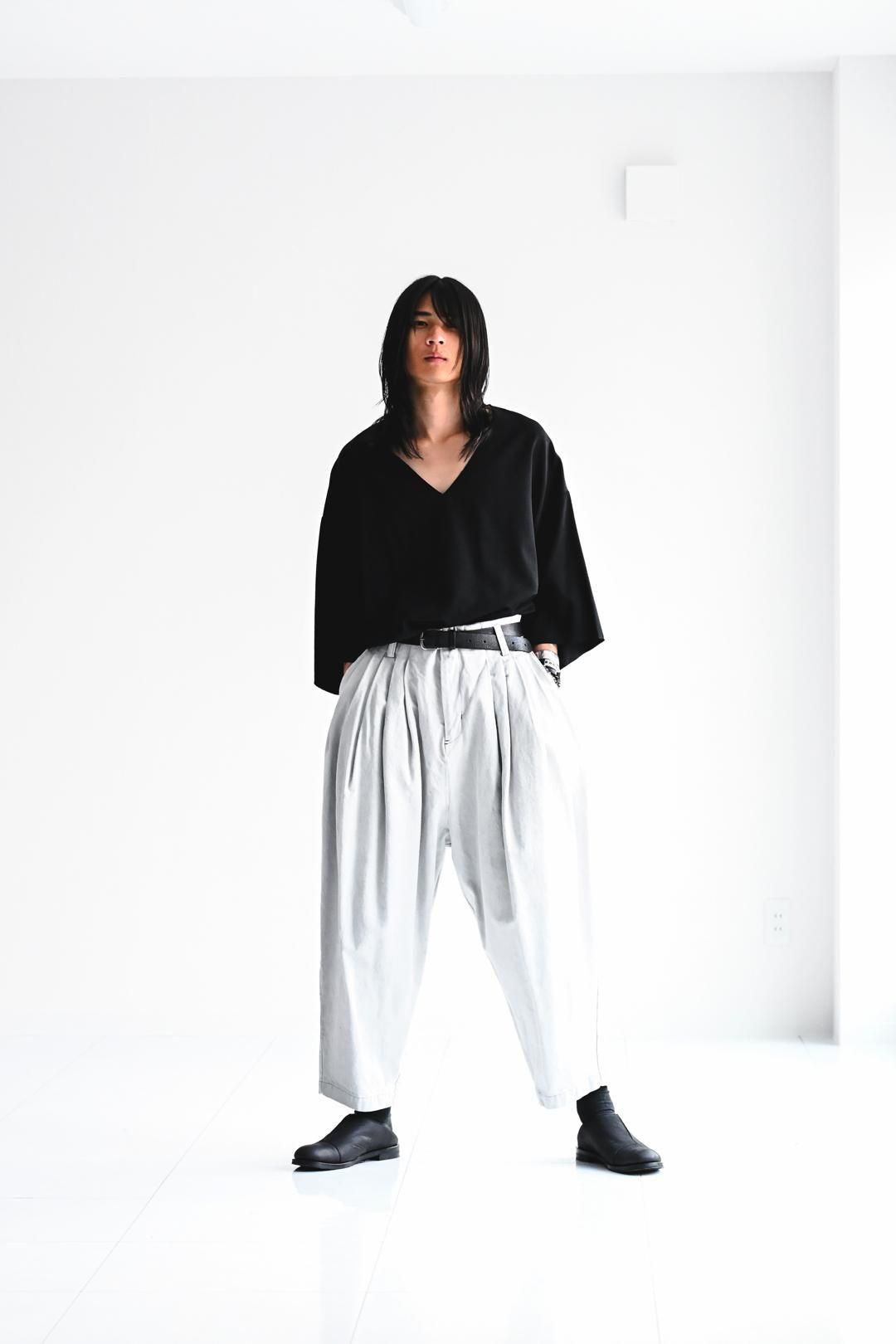 ブリーチ加工を施したブラックデニム生地を用いて表現したワイドパンツ。