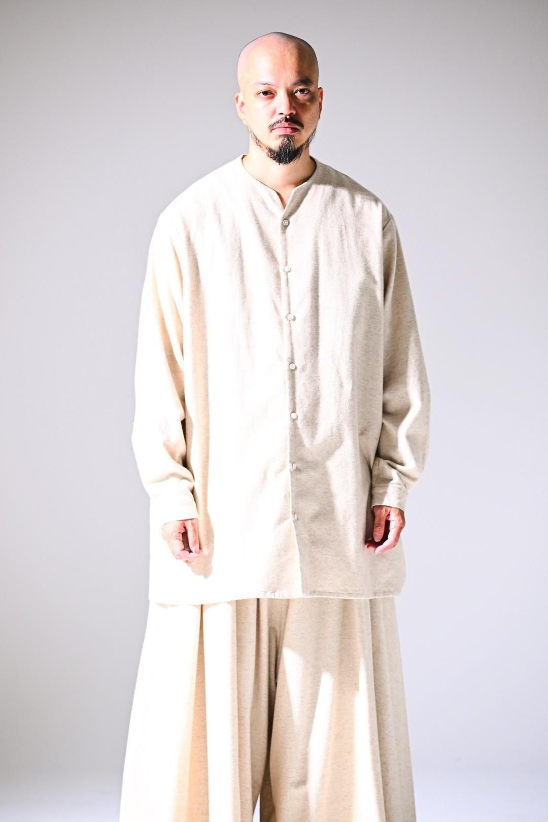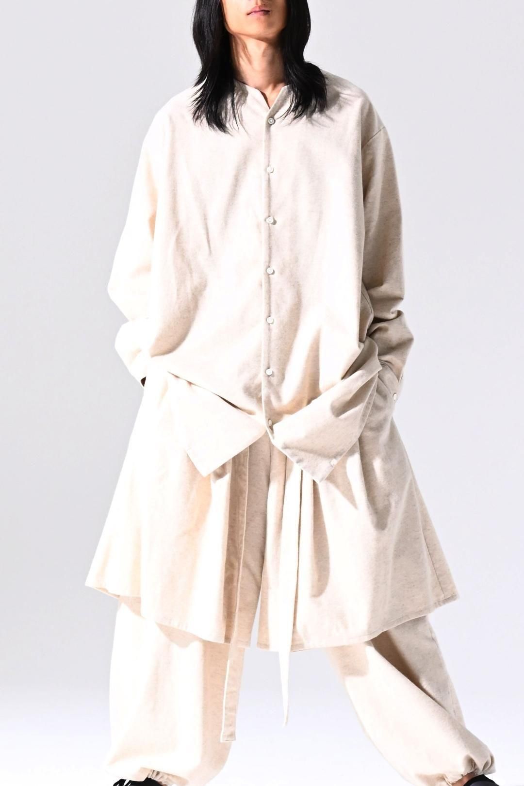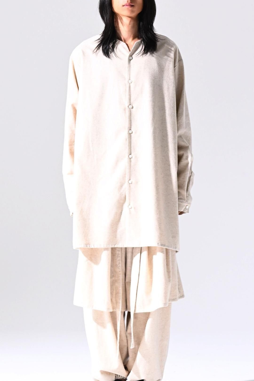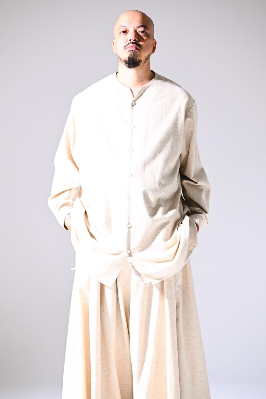 高品質なオーガニックコットンリネンフランネル生地を使用したオーバーサイズのラペルシャツ。