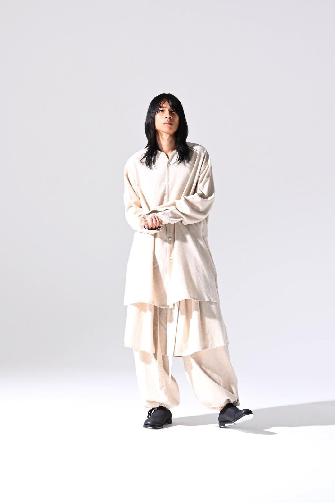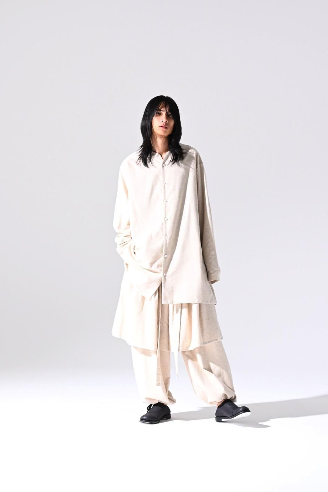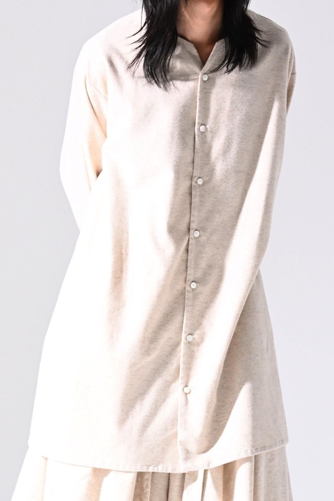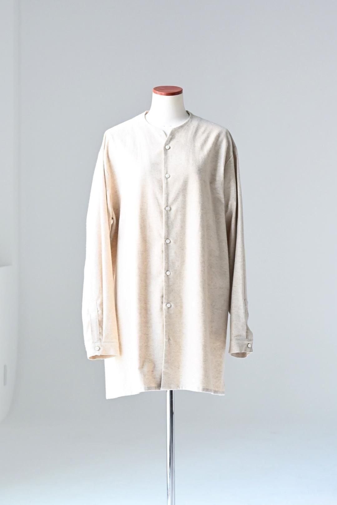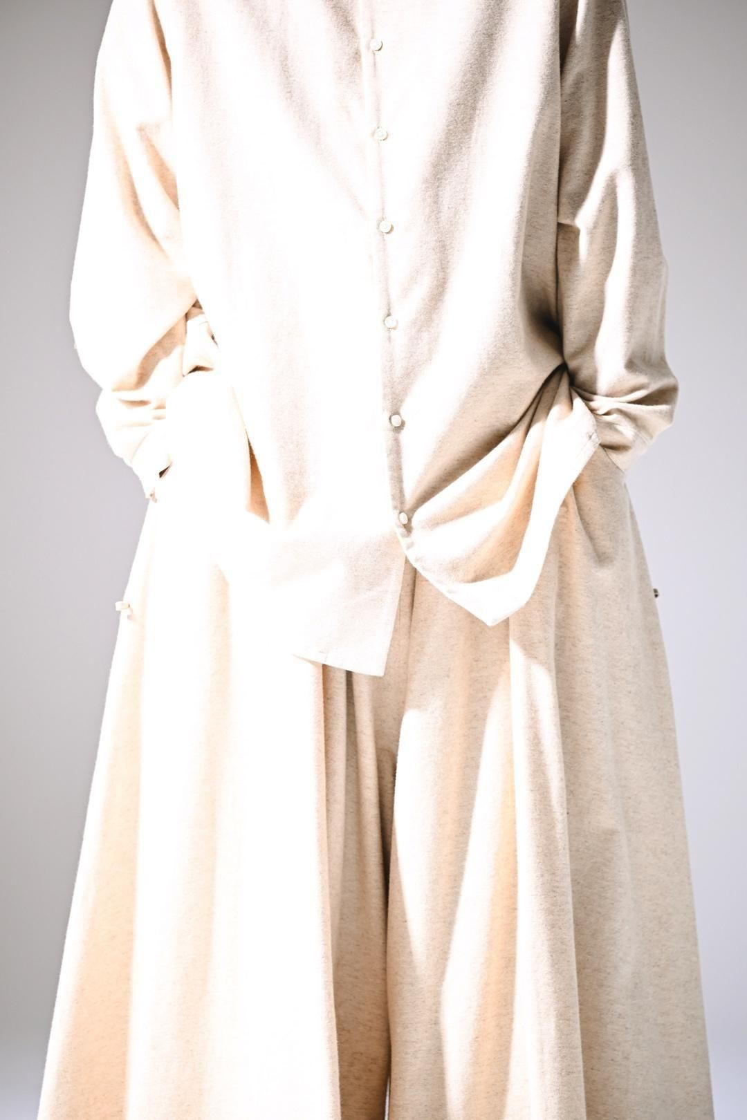 高品質なオーガニックコットンリネンフランネル生地を使用したオーバーサイズのラペルシャツ。