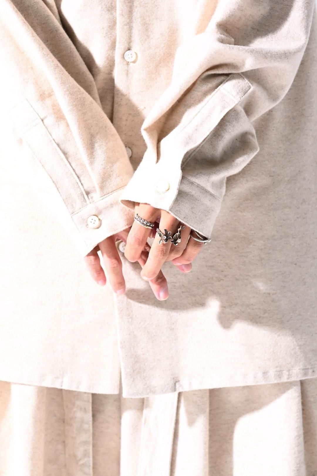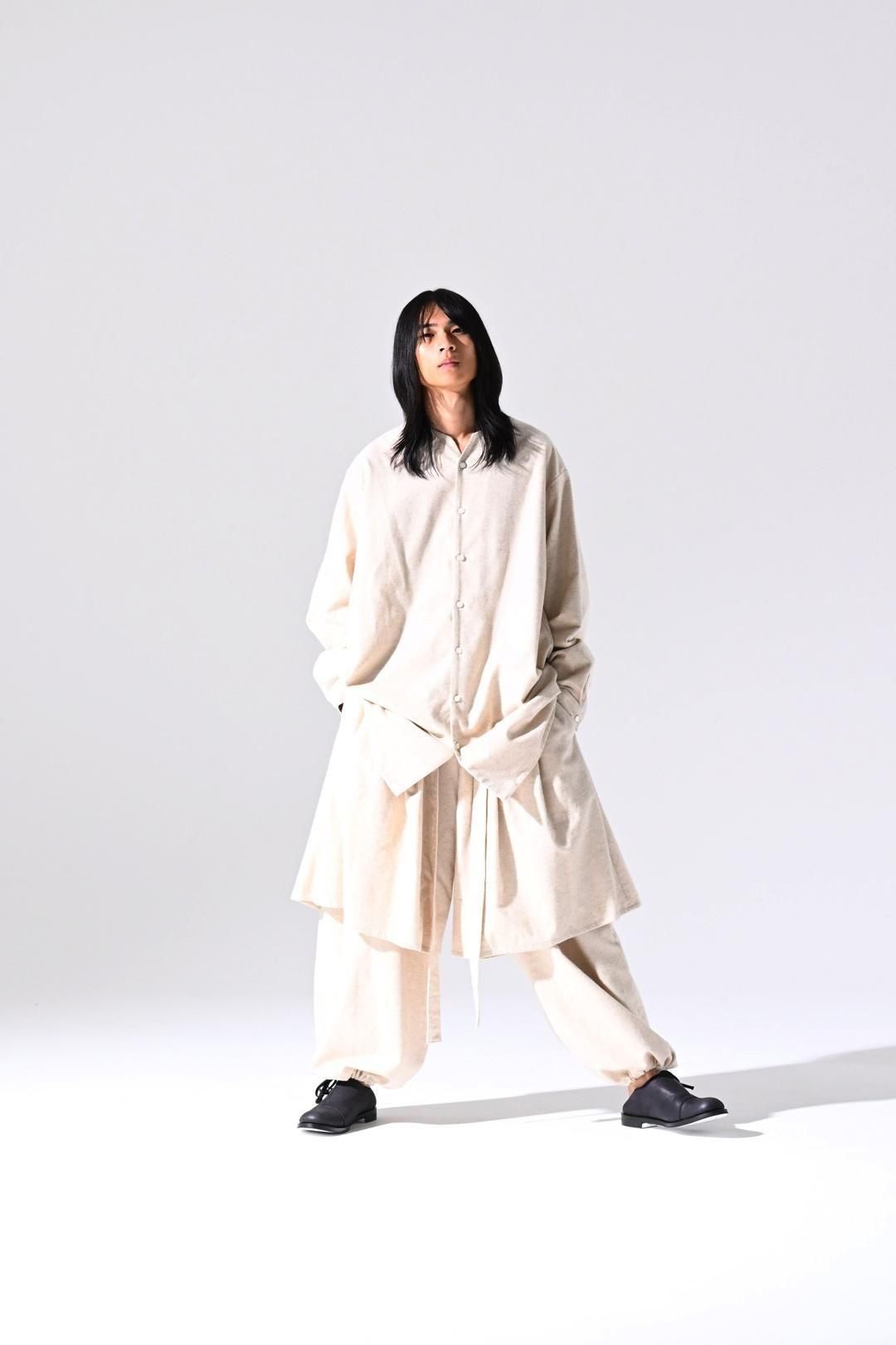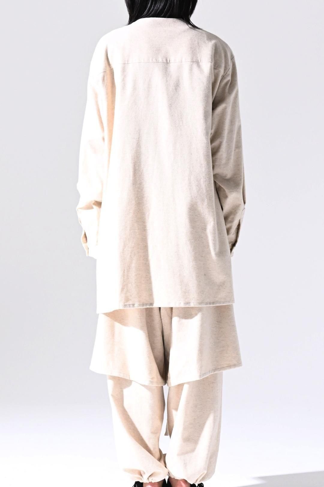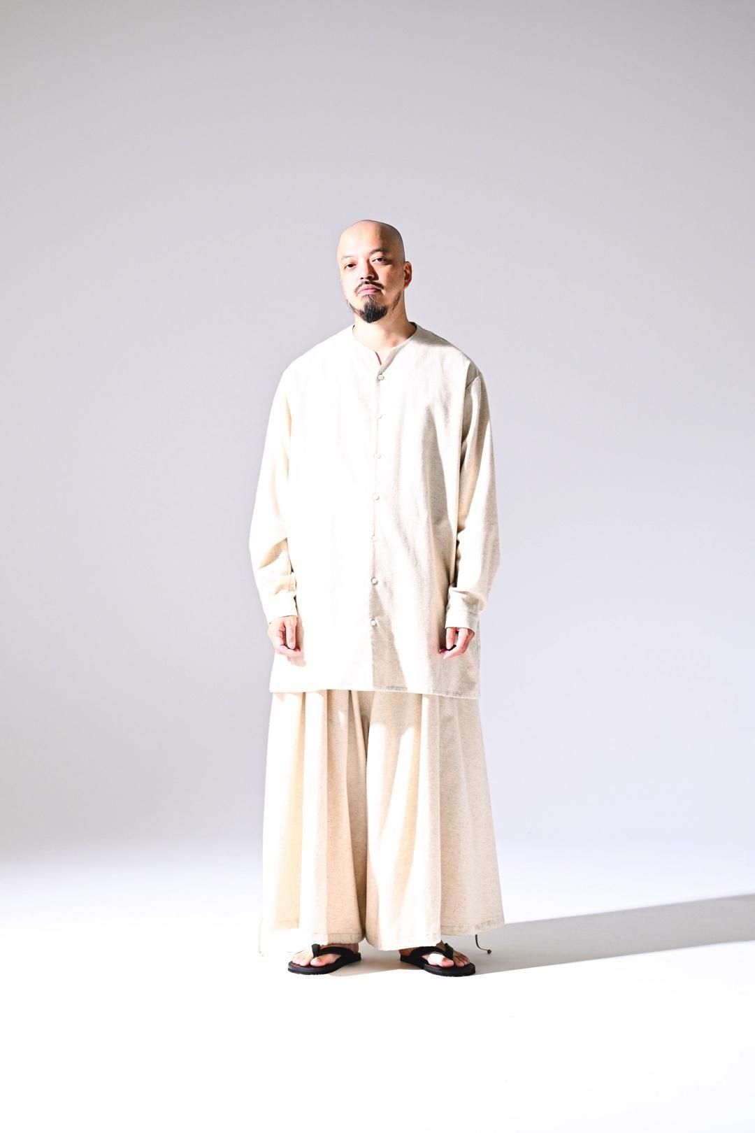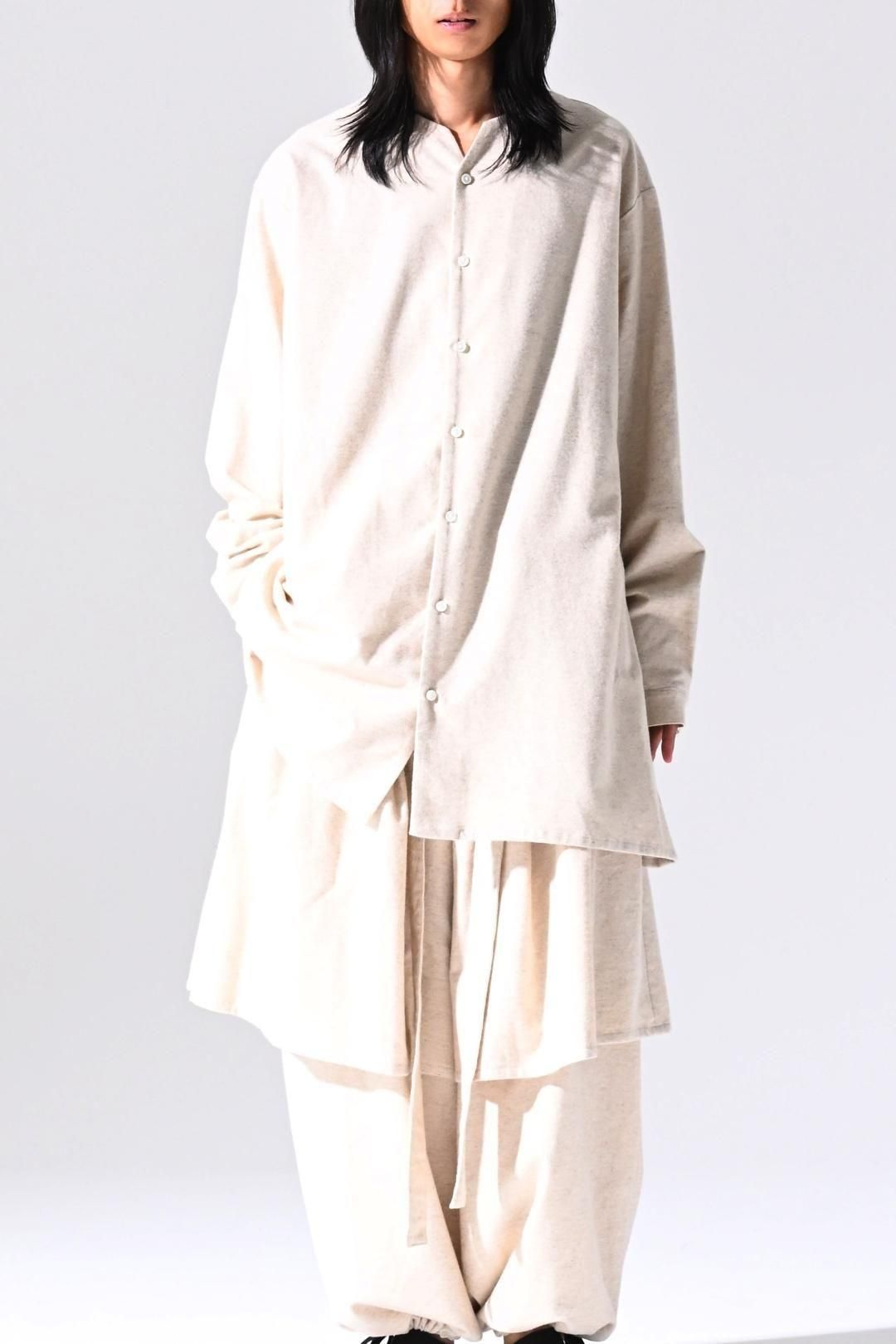 高品質なオーガニックコットンリネンフランネル生地を使用したオーバーサイズのラペルシャツ。