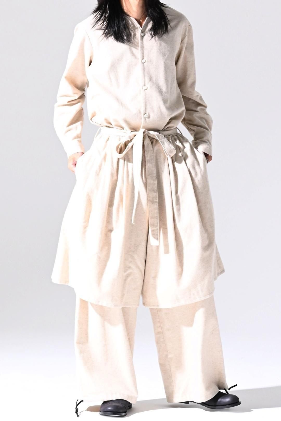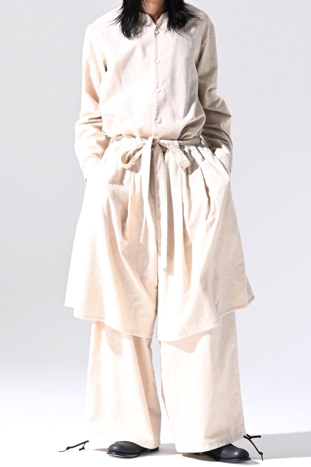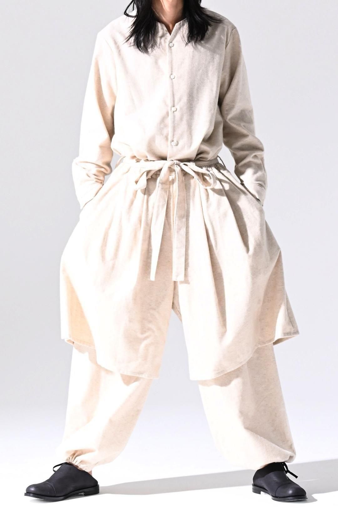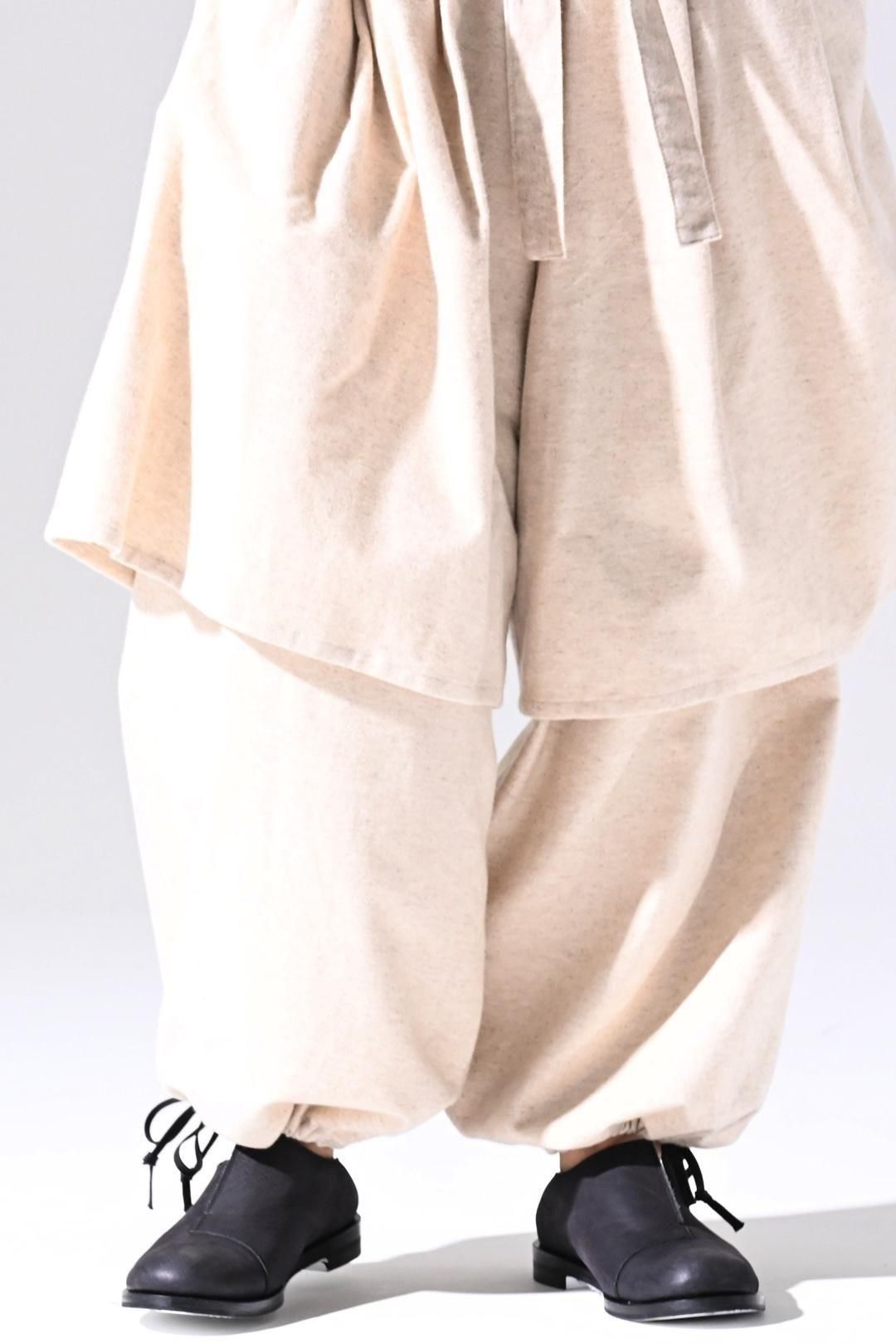 裾には紐を通しており、バルーンパンツとしてのスタイルもお楽しみ頂けます。