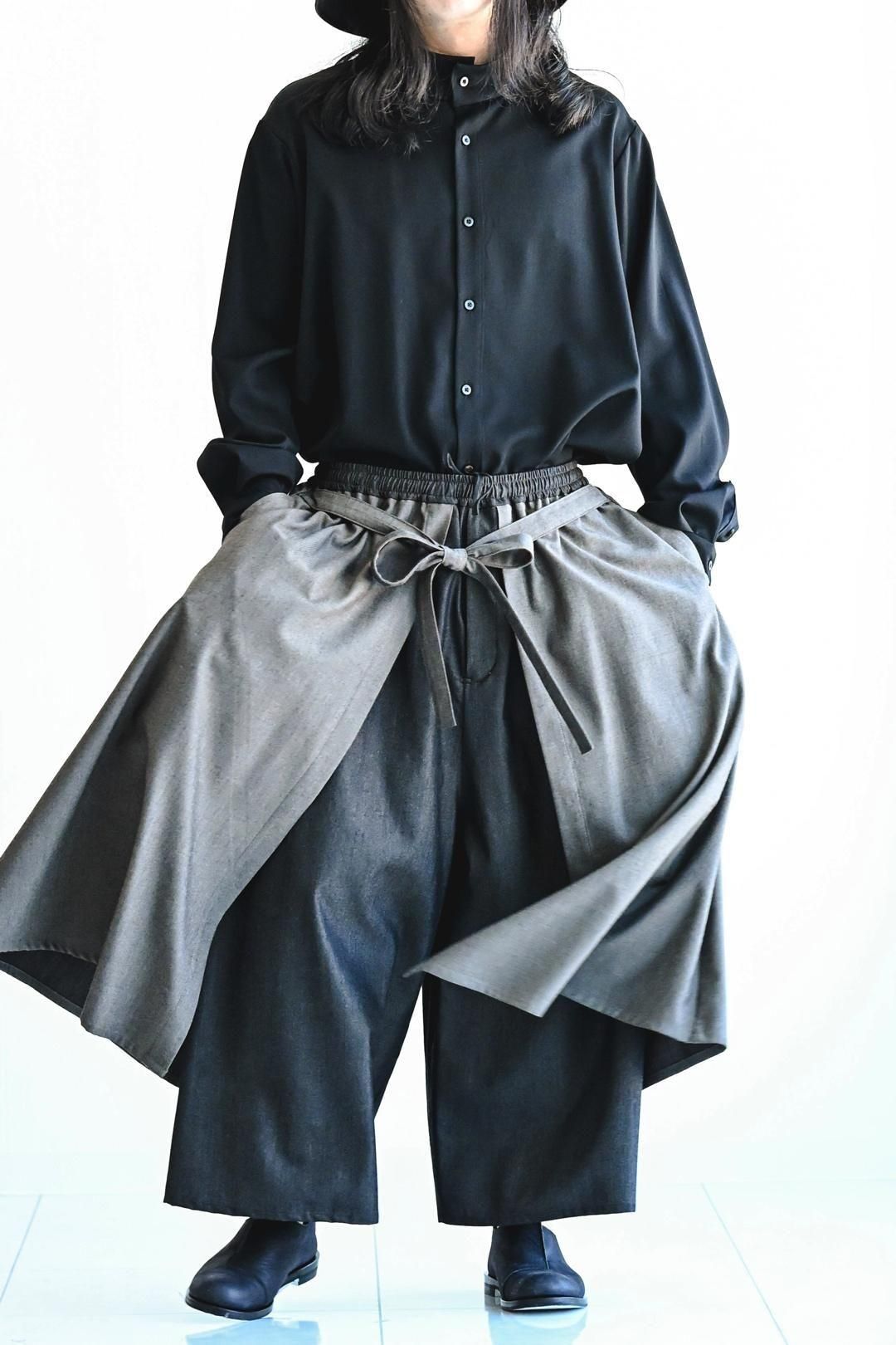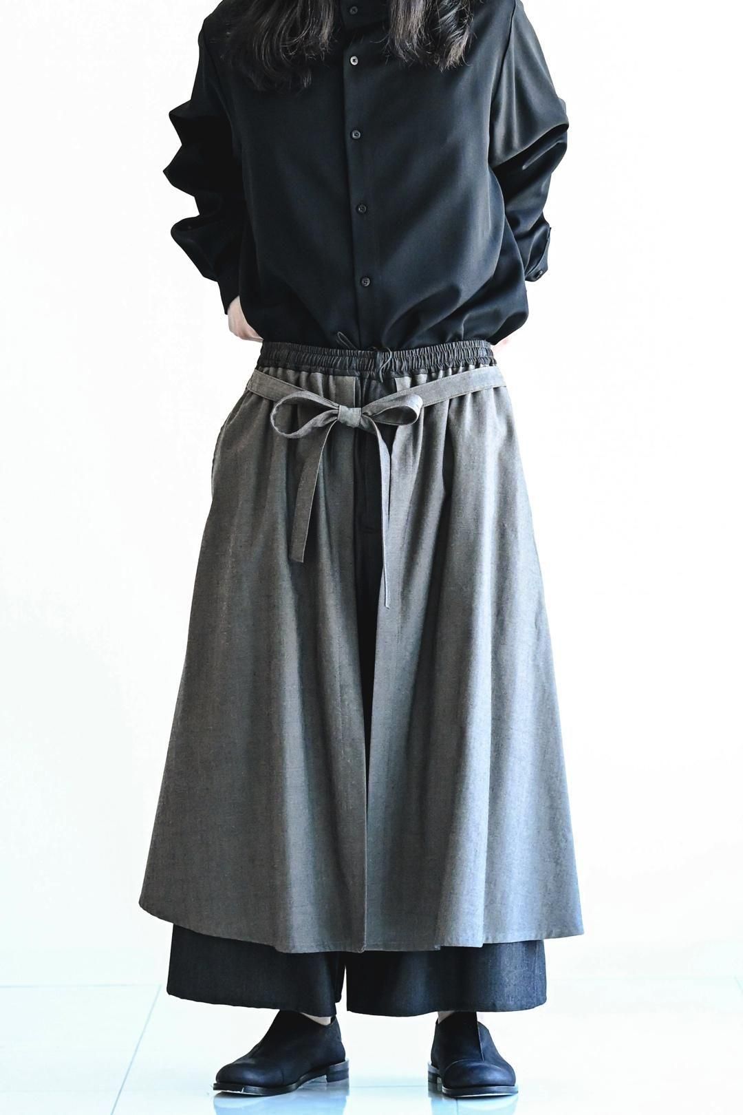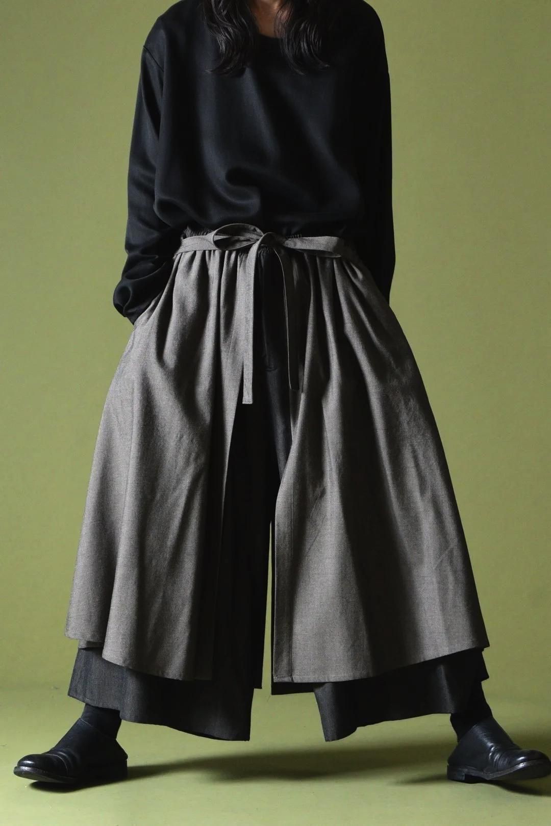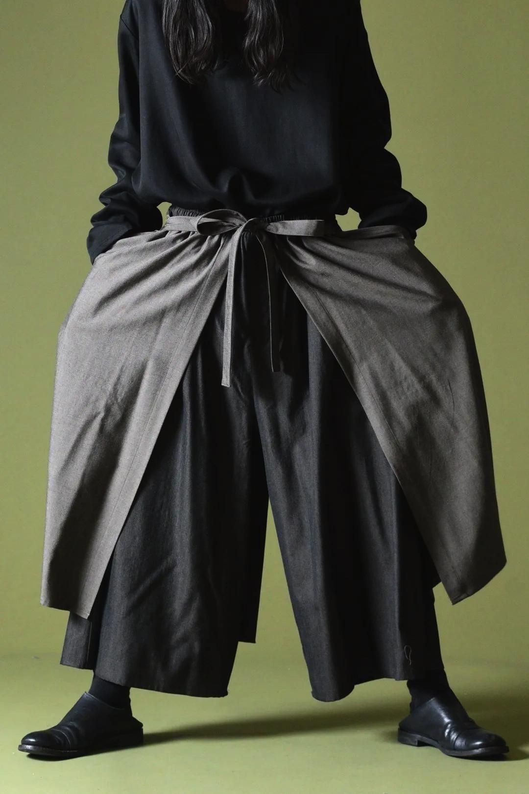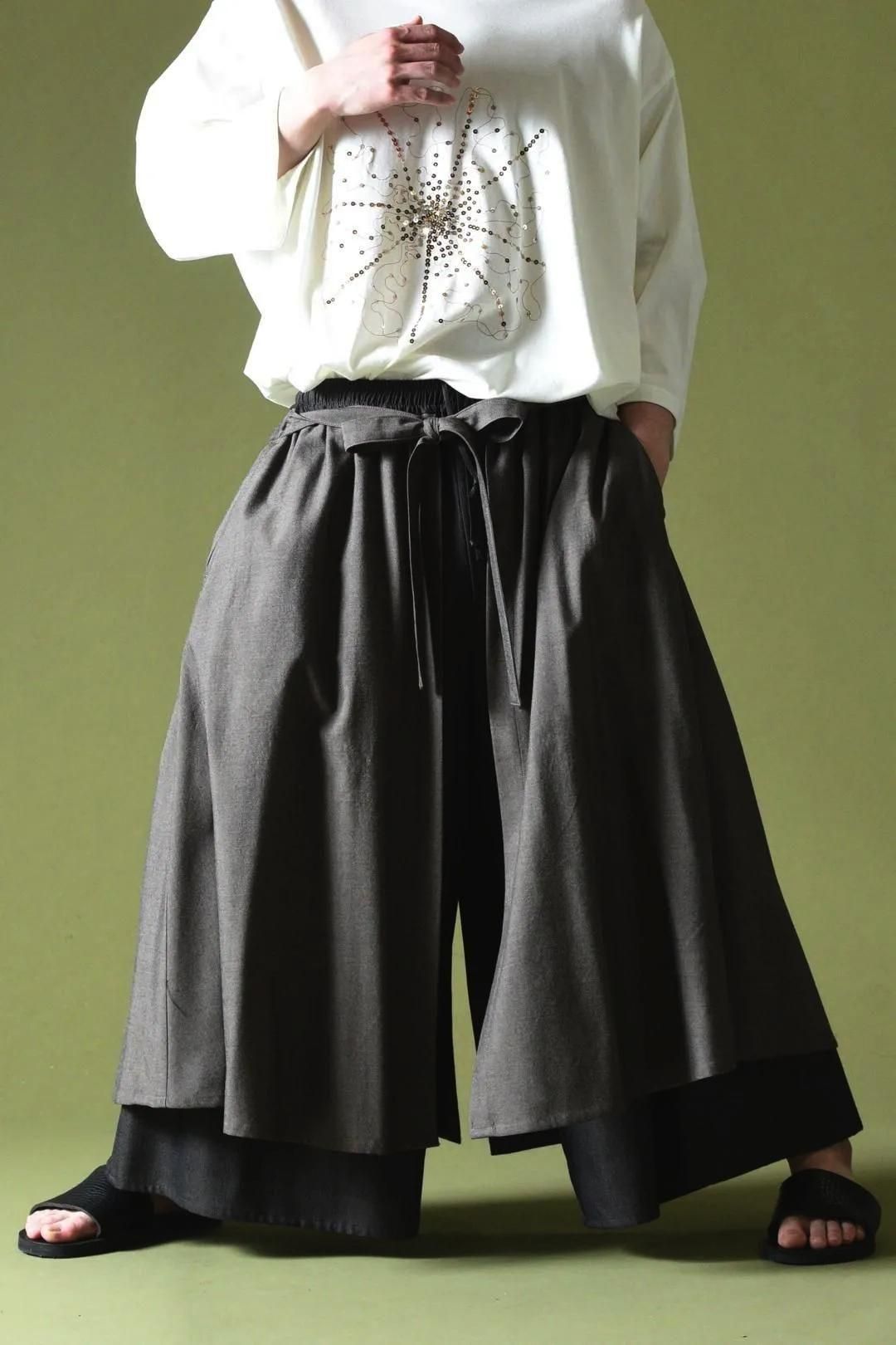 2枚の布を重ねて生地の美しい動きとボリューム感を表現したレイヤード「袴」パンツ。