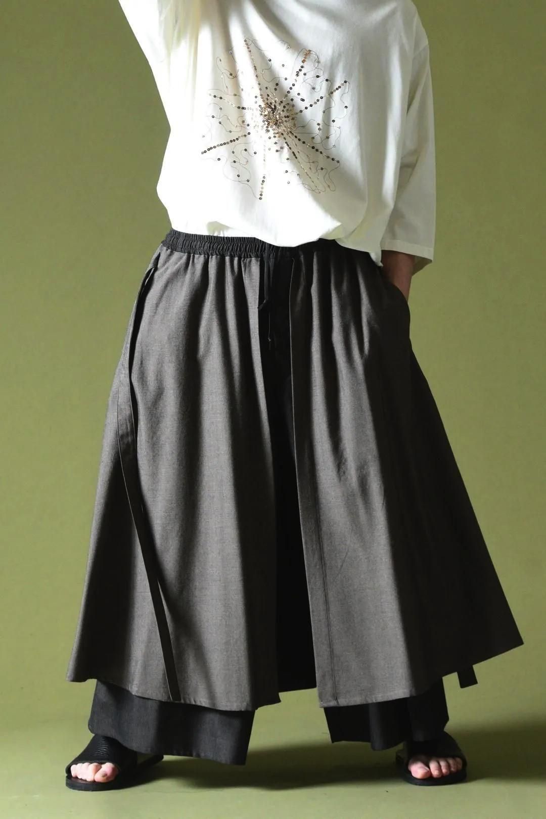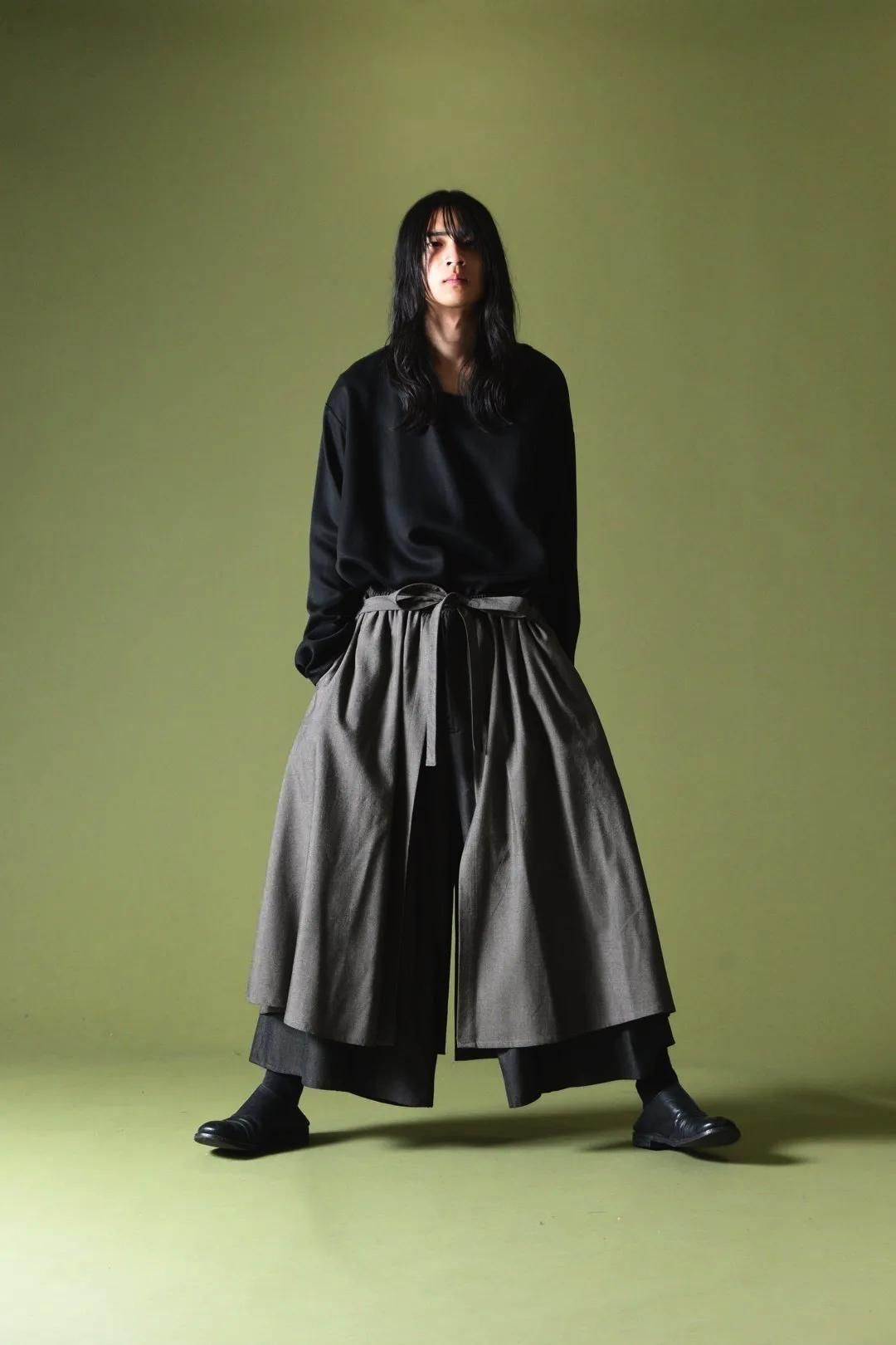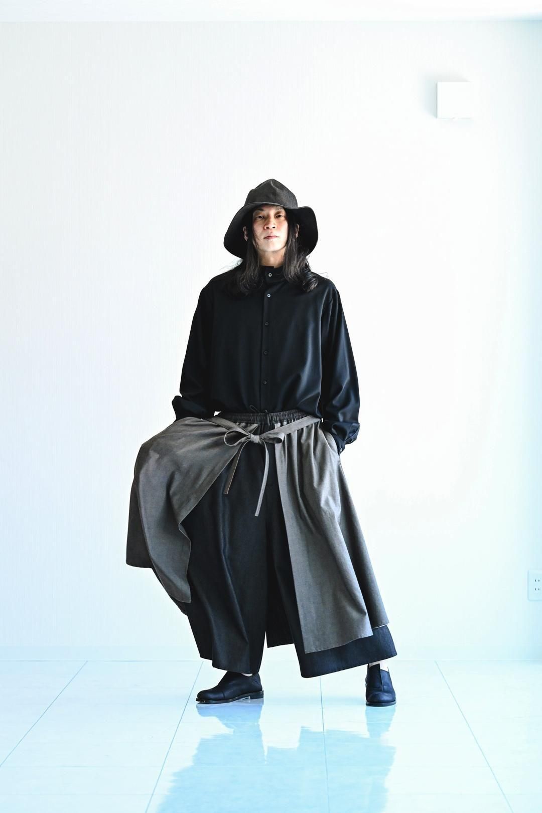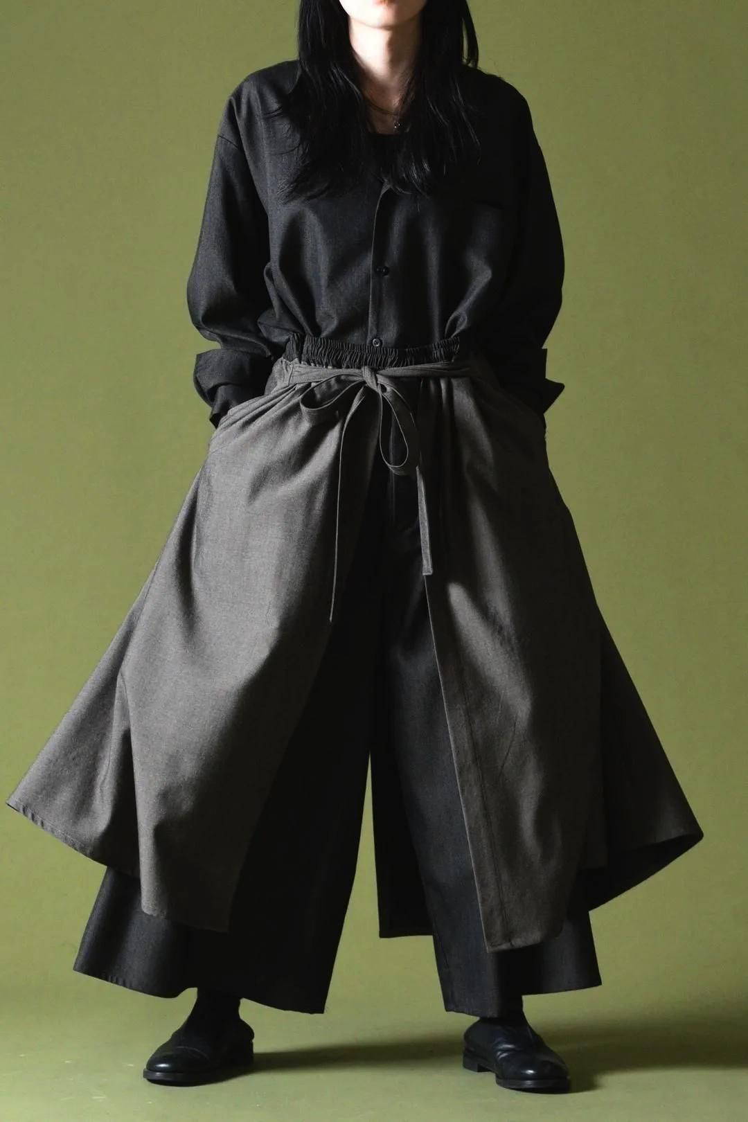2枚の布を重ねて生地の美しい動きとボリューム感を表現したレイヤード「袴」パンツ。