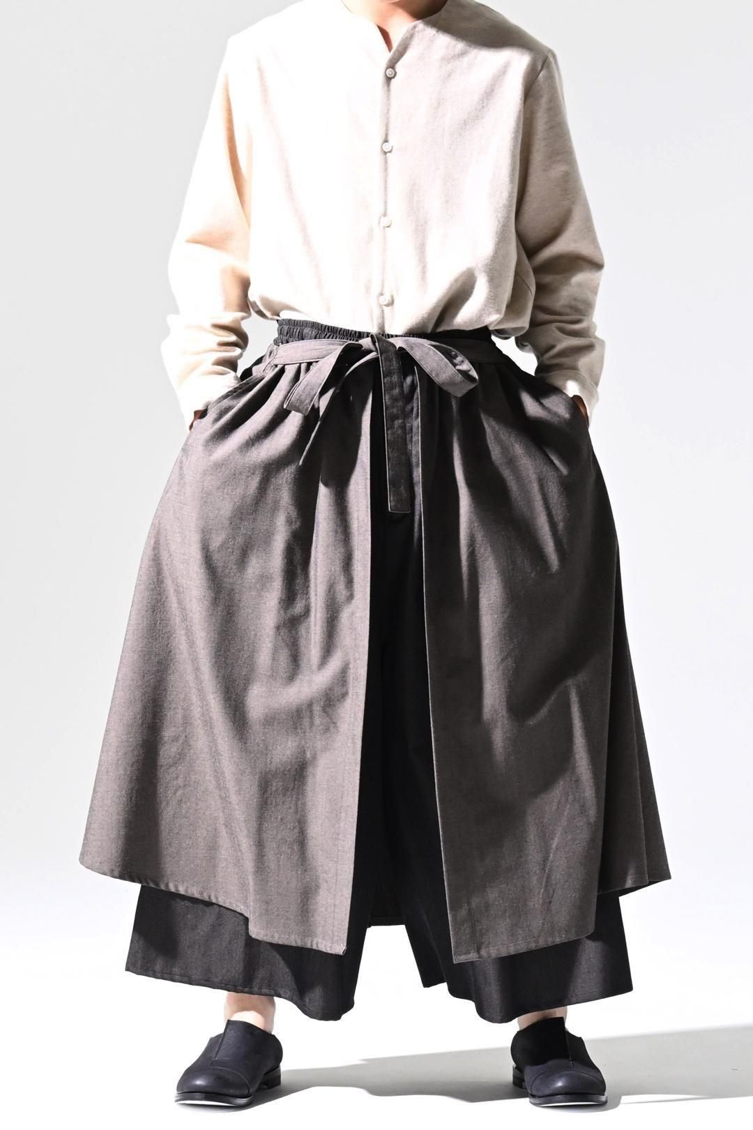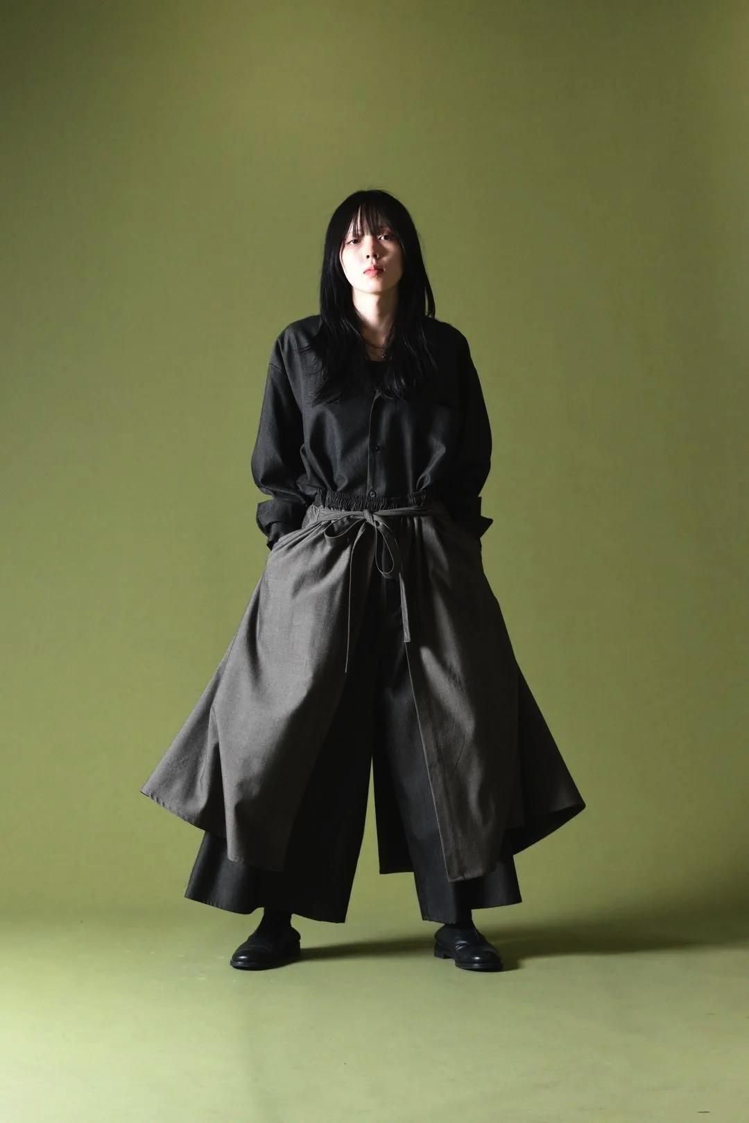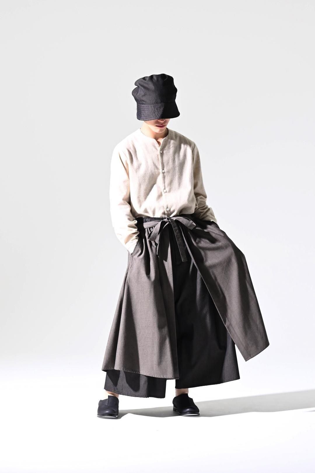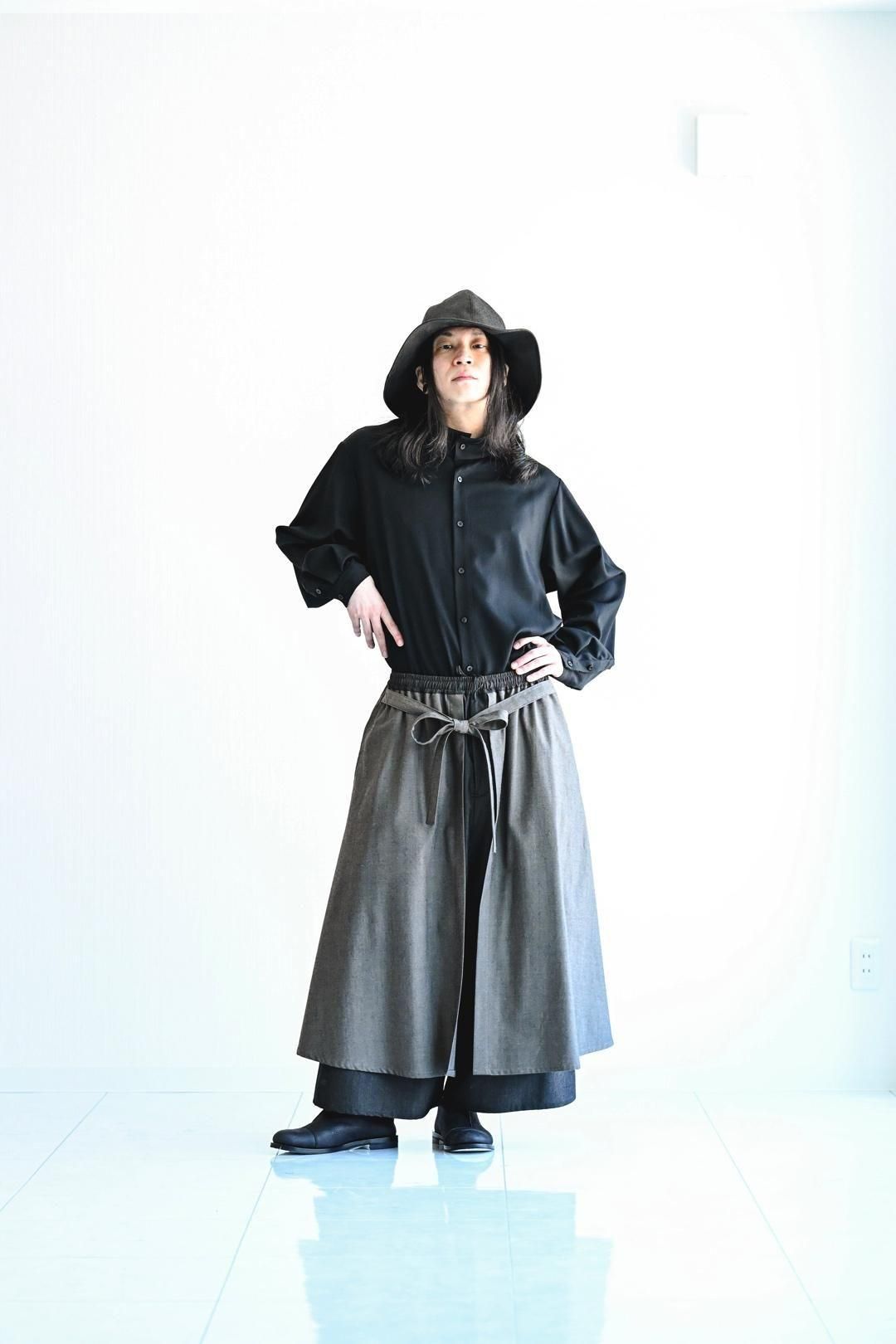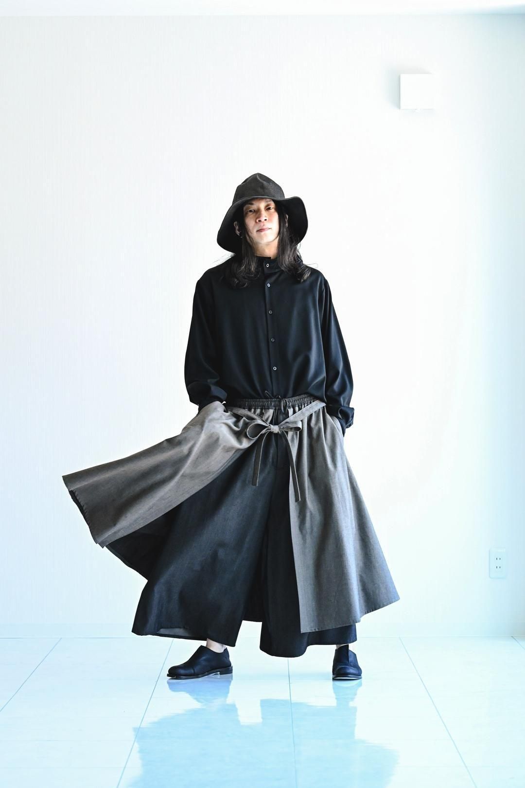 2枚の布を重ねて生地の美しい動きとボリューム感を表現したレイヤード「袴」パンツ。