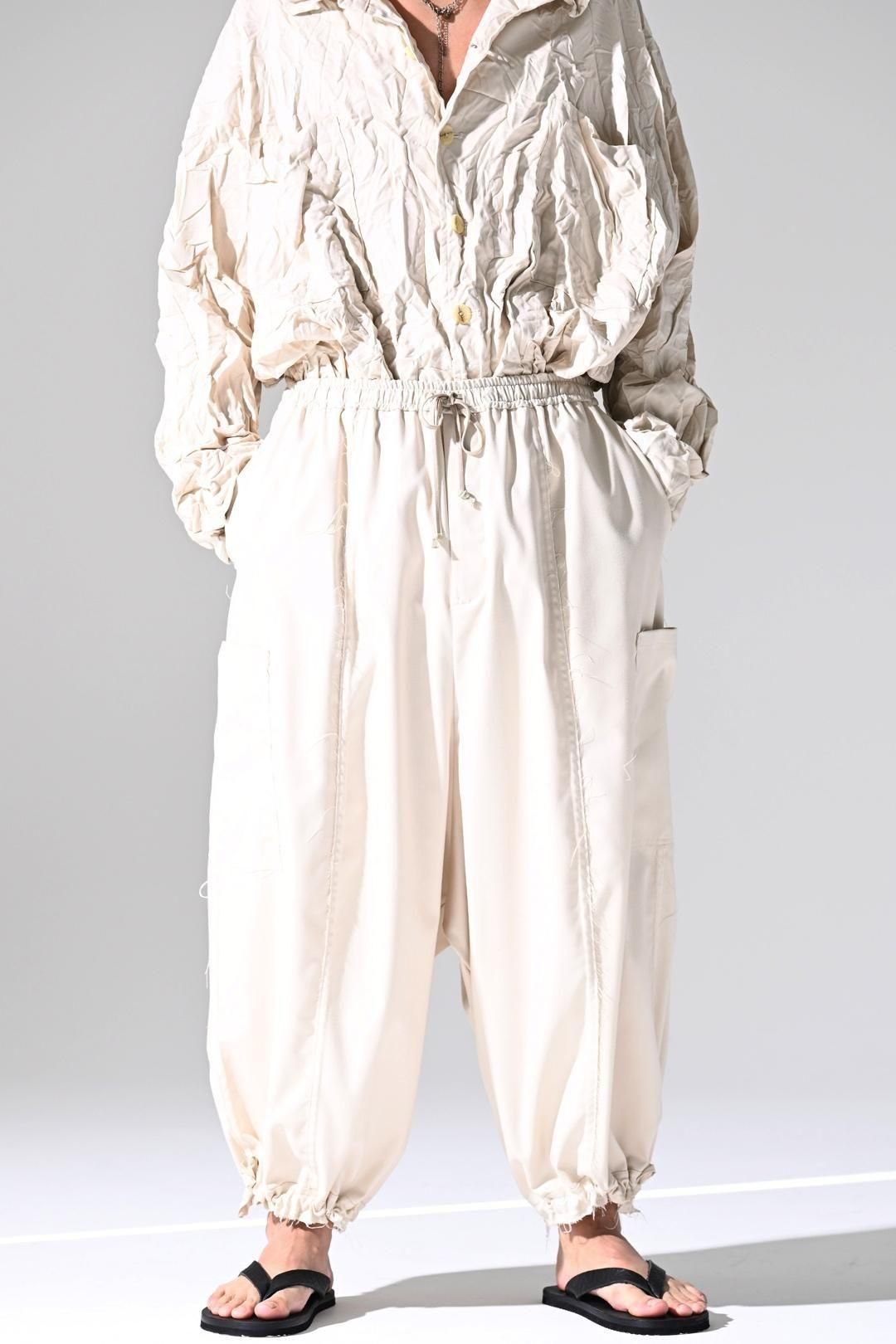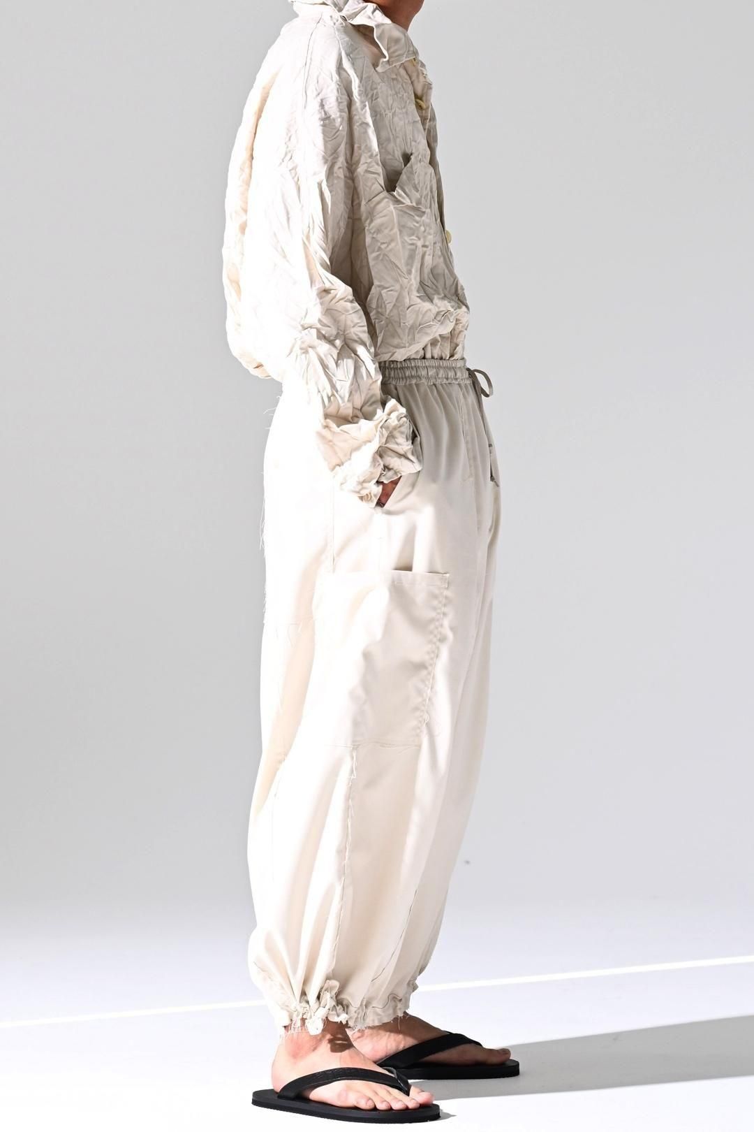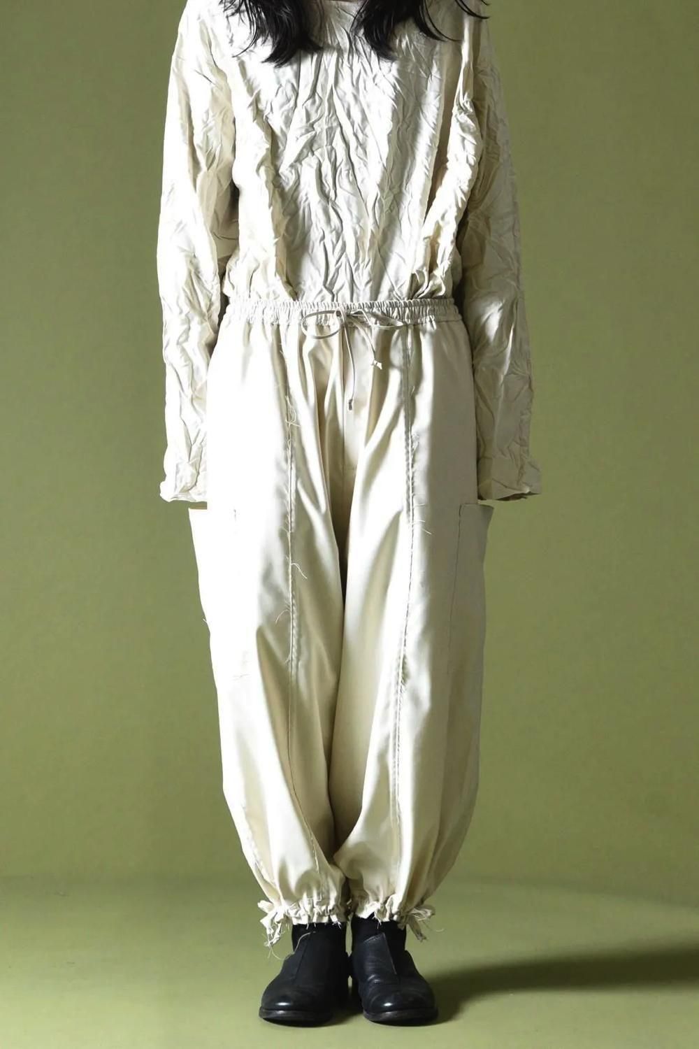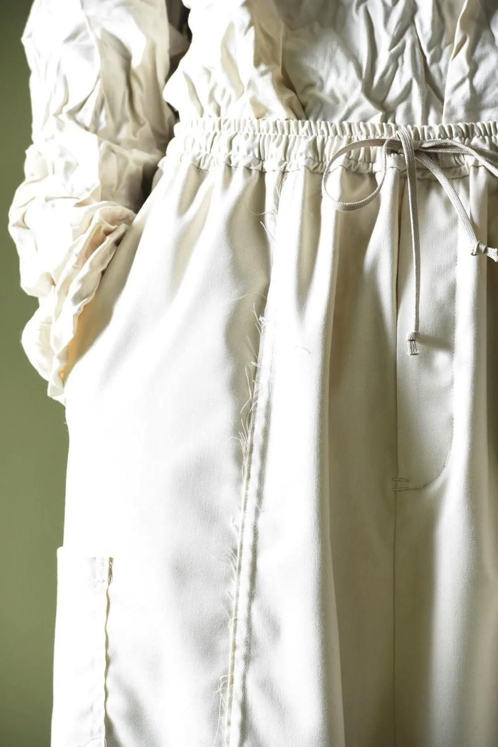 ウエストと裾に紐を施し、随所をカットオフで仕上げたワイドパンツです。