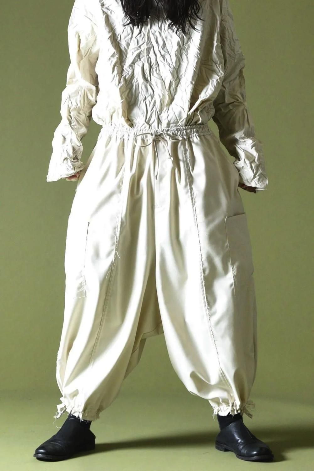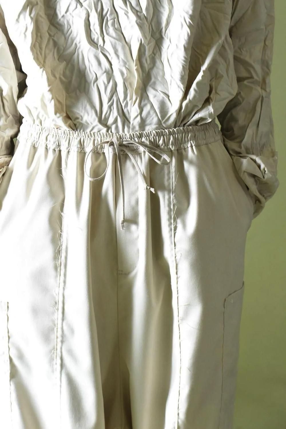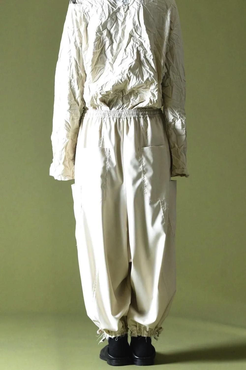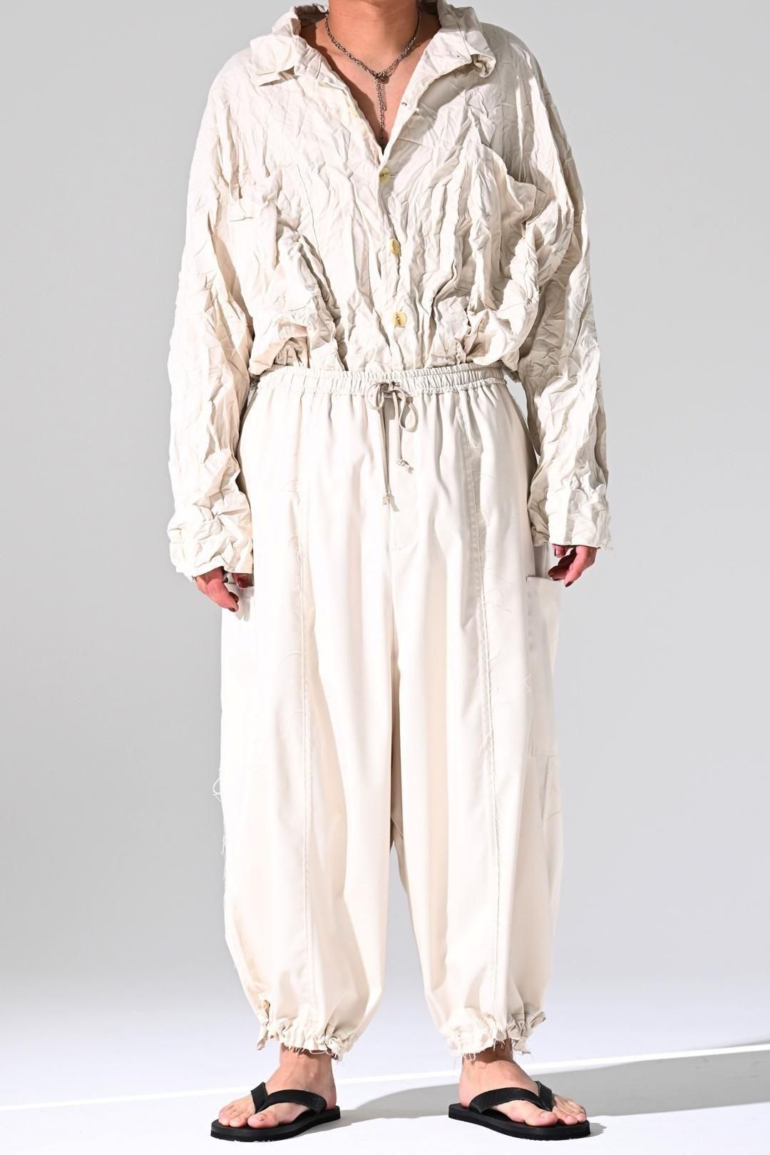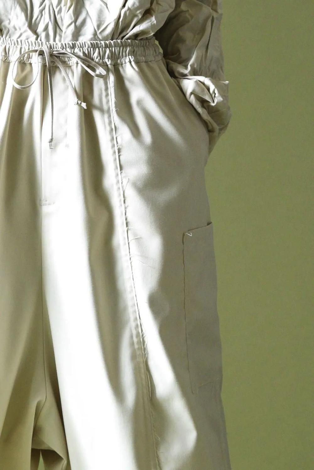 ウエストと裾に紐を施し、随所をカットオフで仕上げたワイドパンツです。