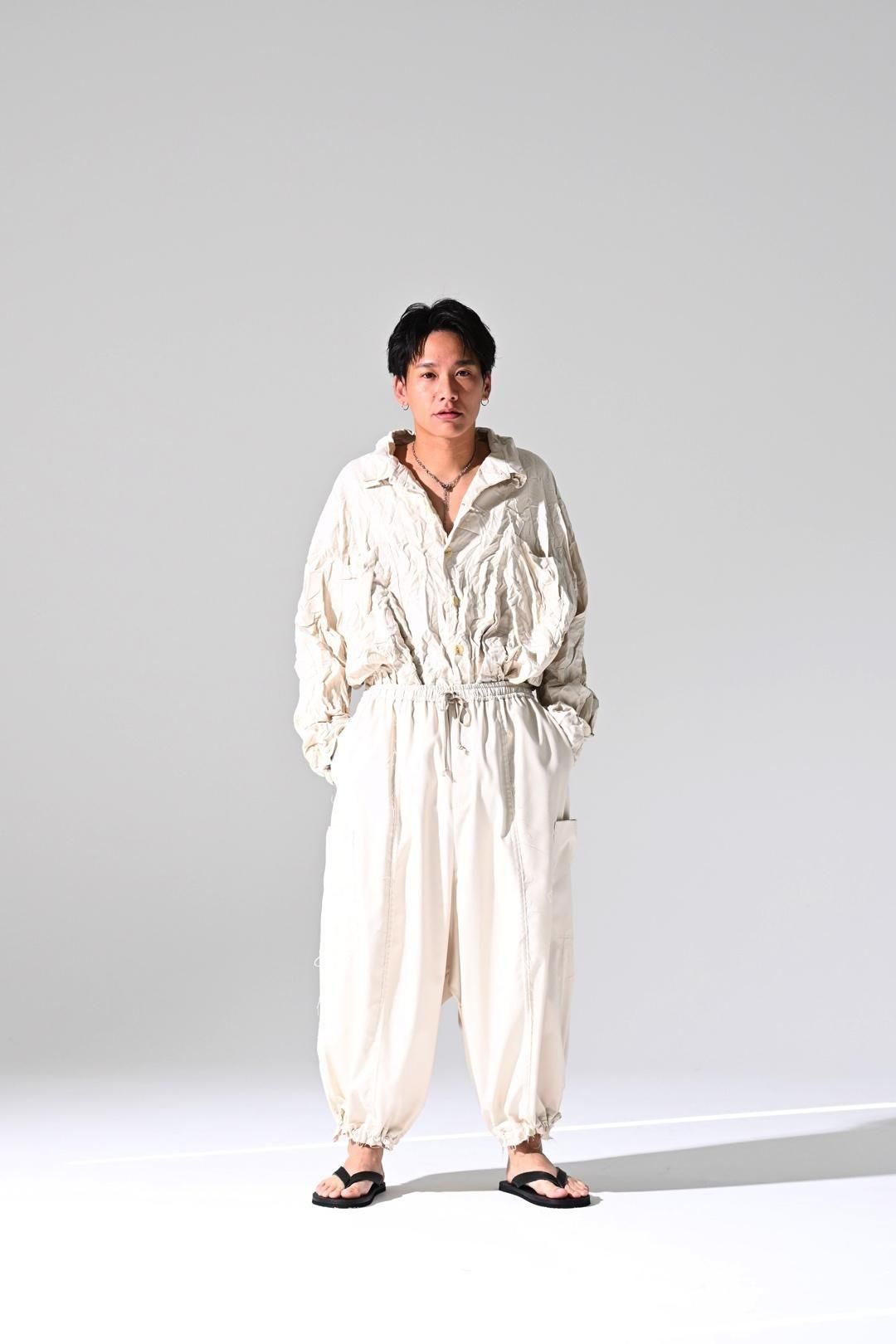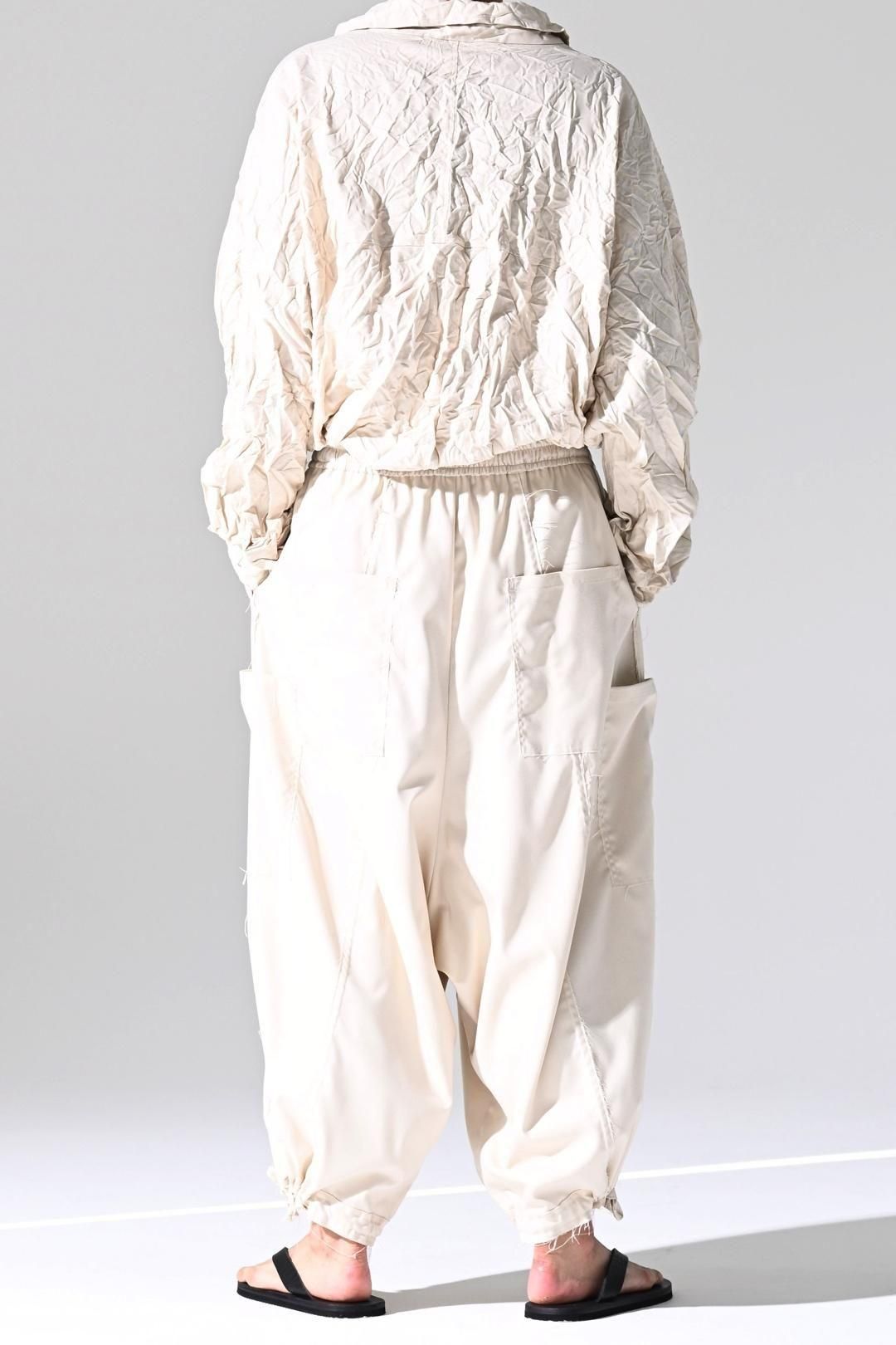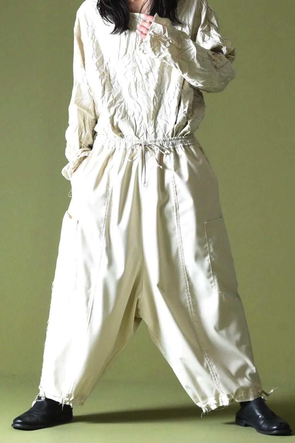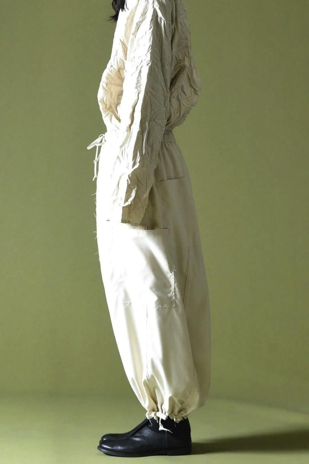 ウエストと裾に紐を施し、随所をカットオフで仕上げたワイドパンツです。