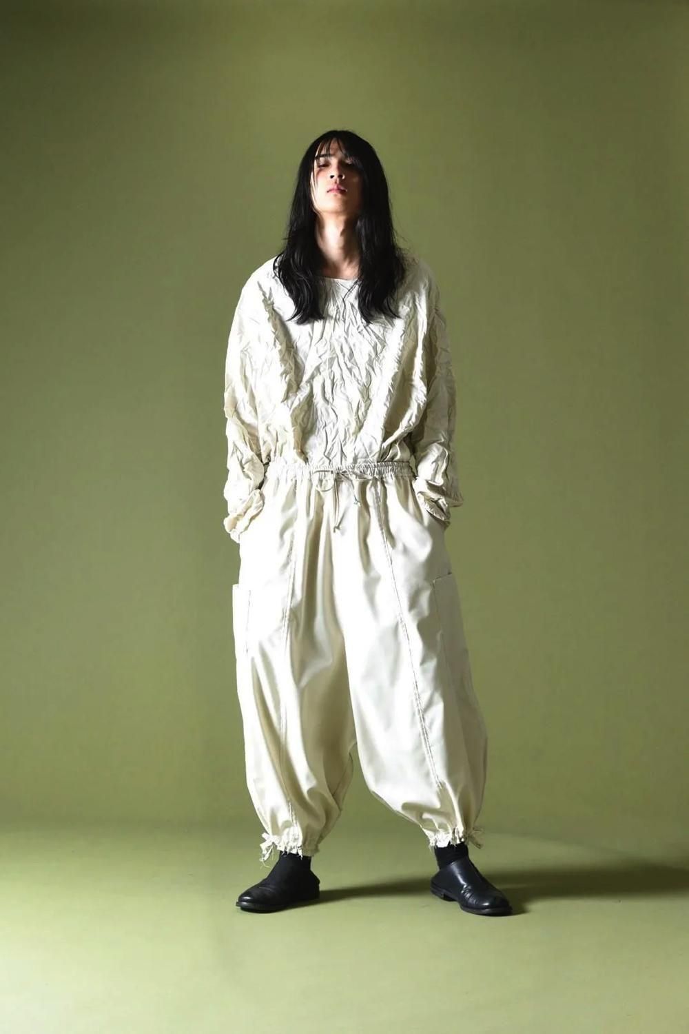紐を絞らず履くことで裾までワイドなシルエットに、
