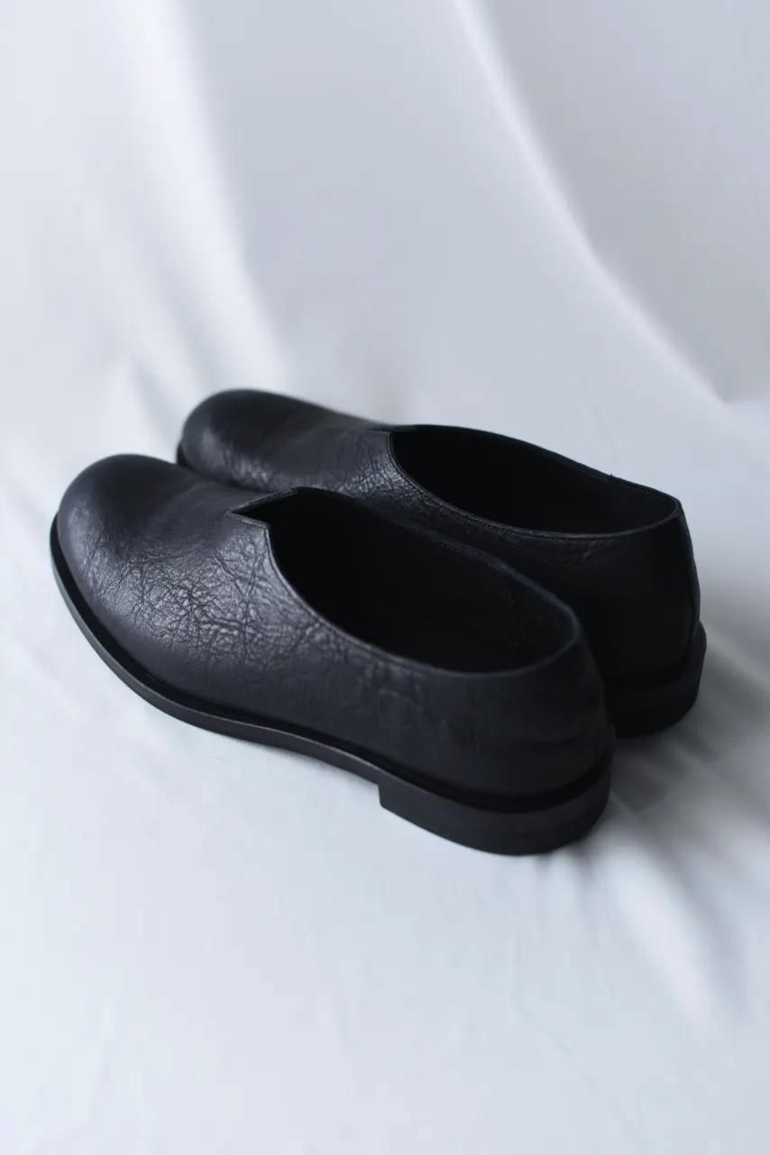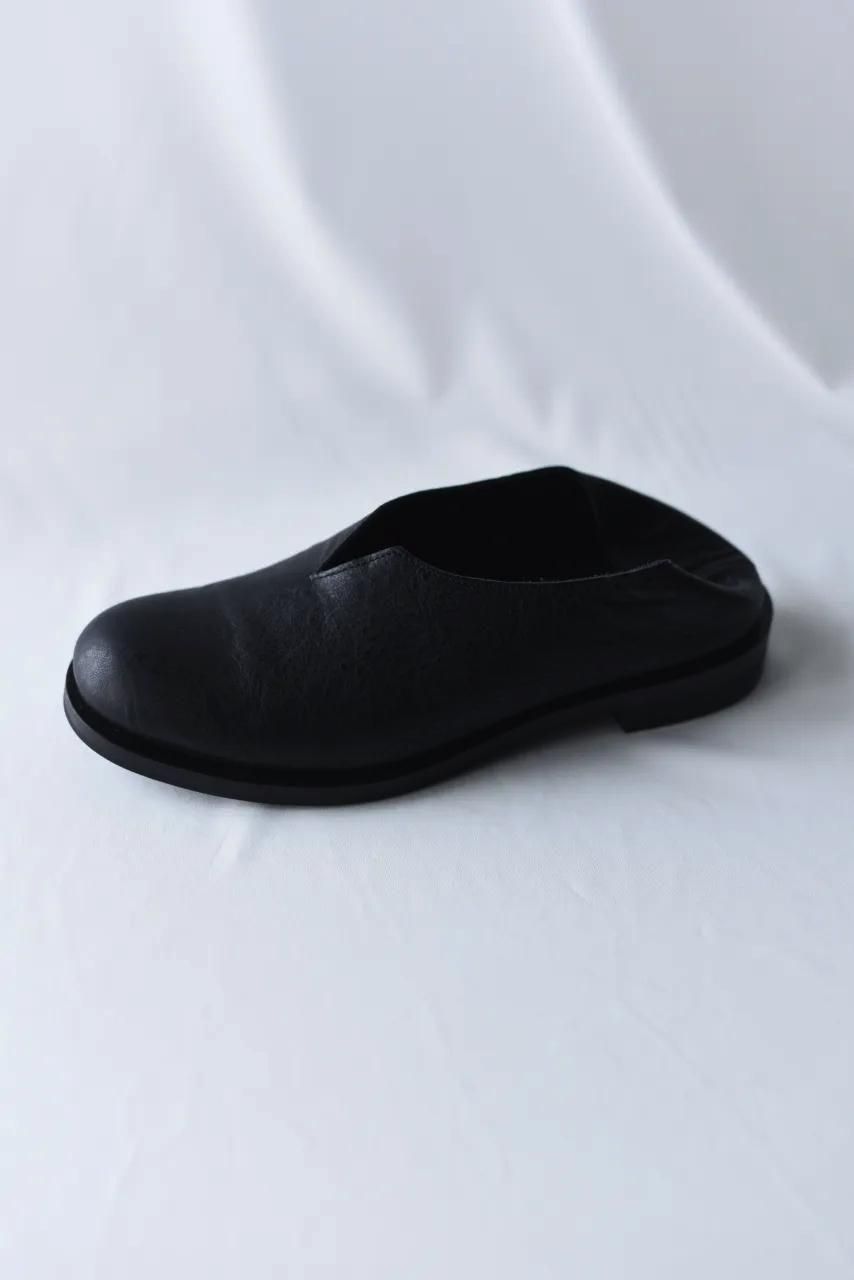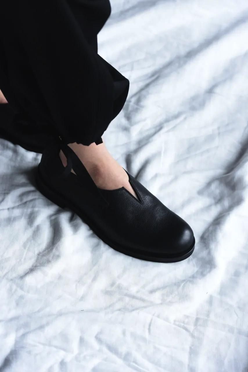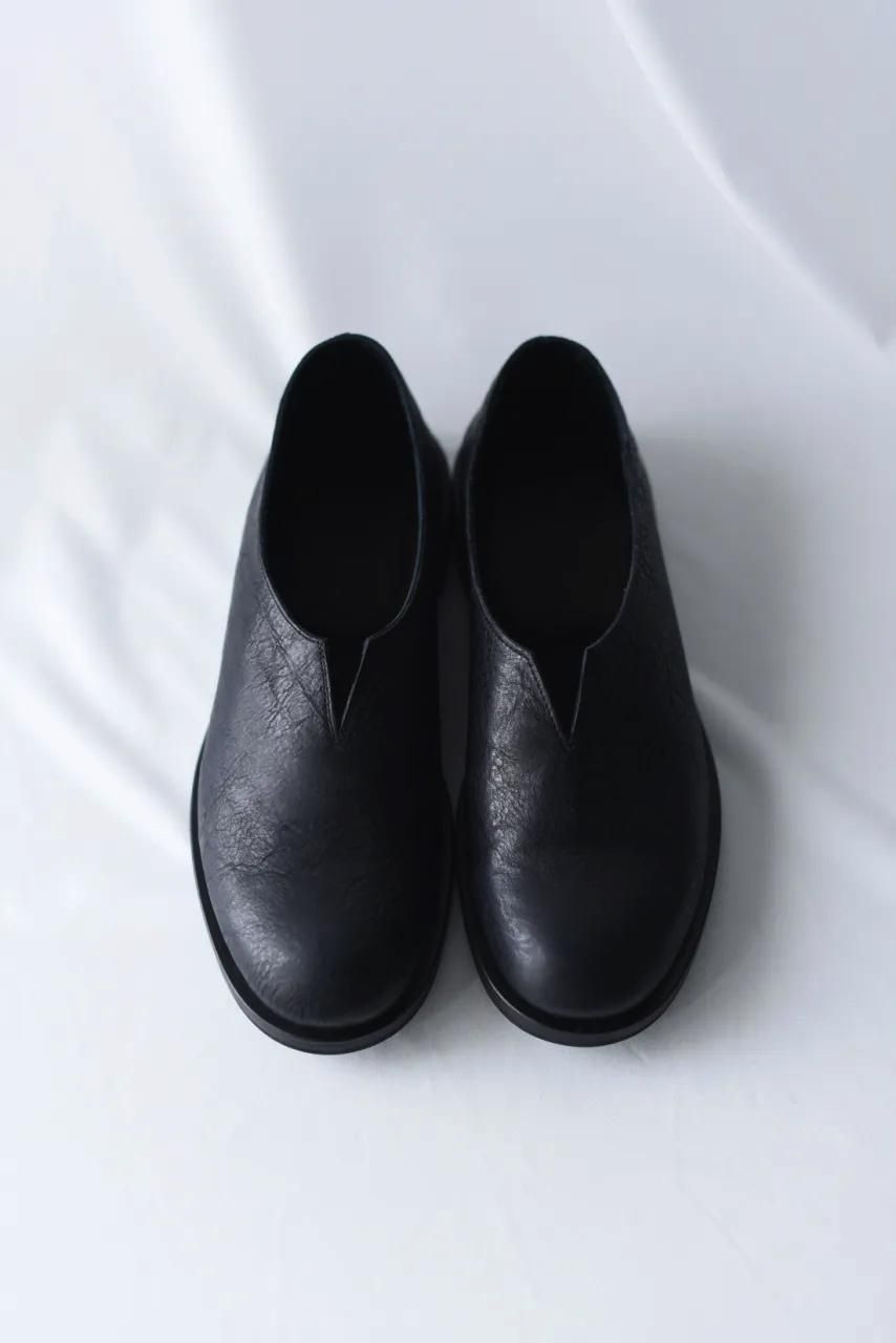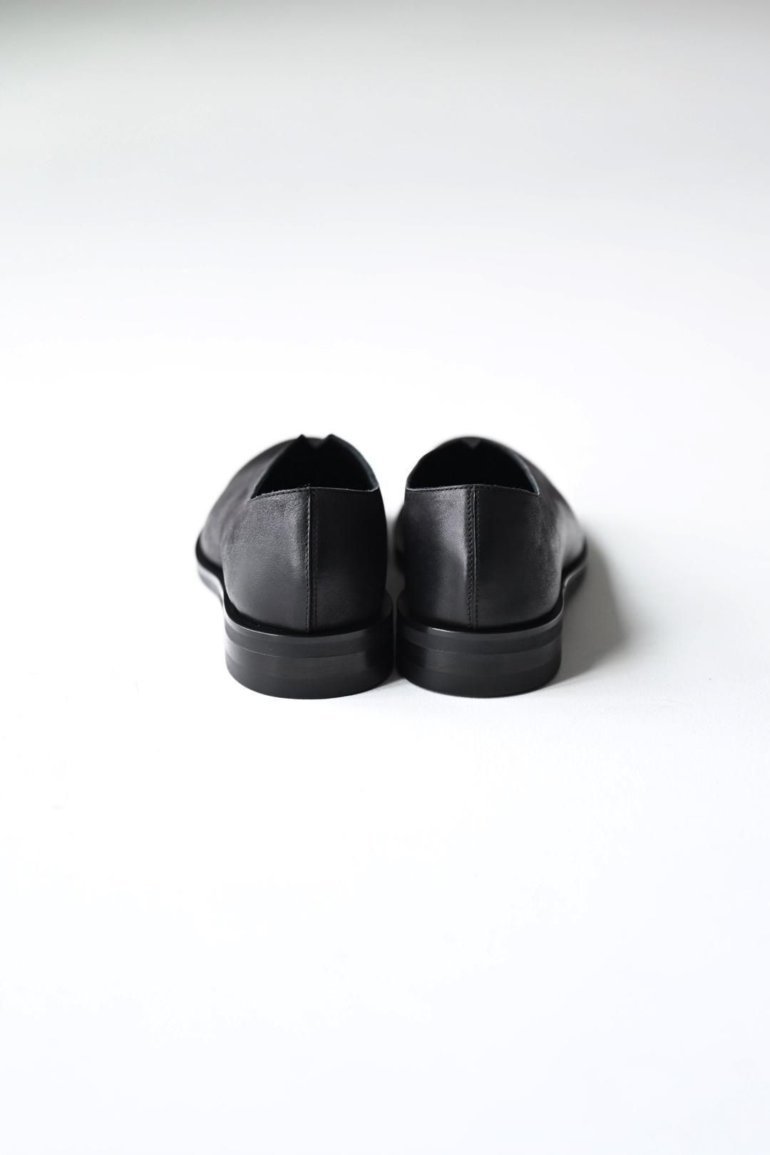 襟のラインに角を取ったディテールを落とし込んだレザーシューズ。