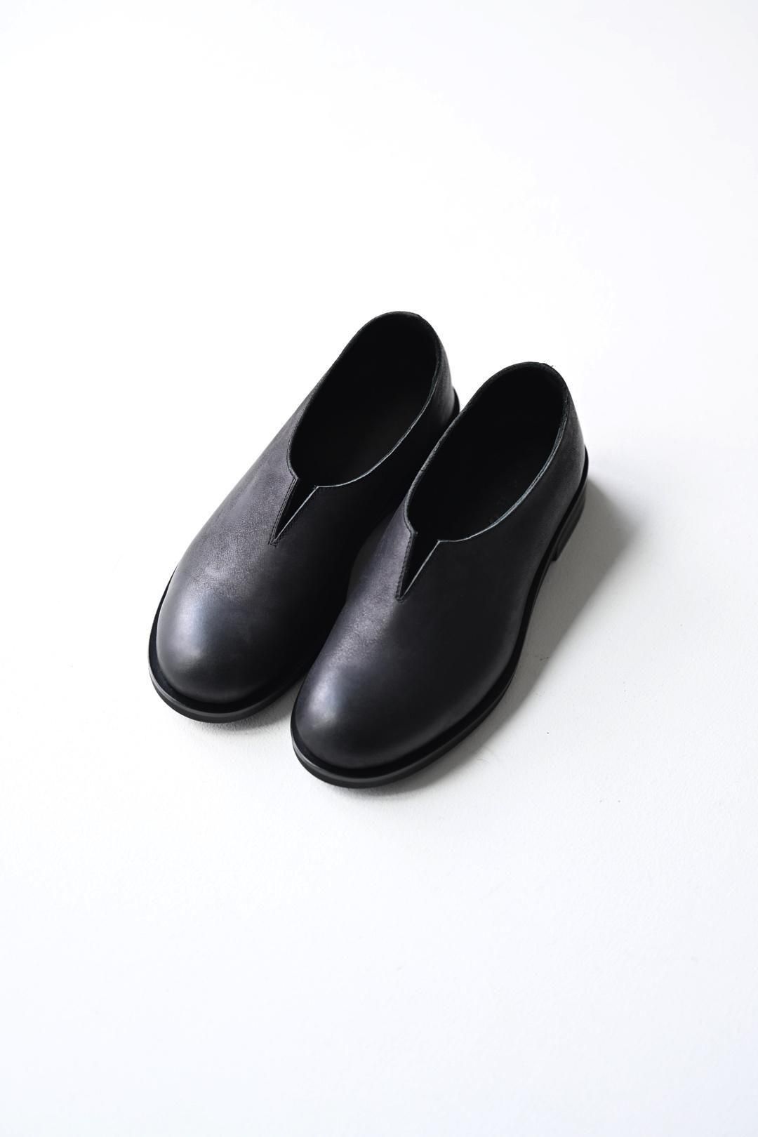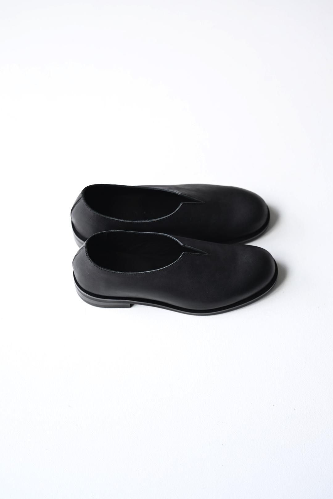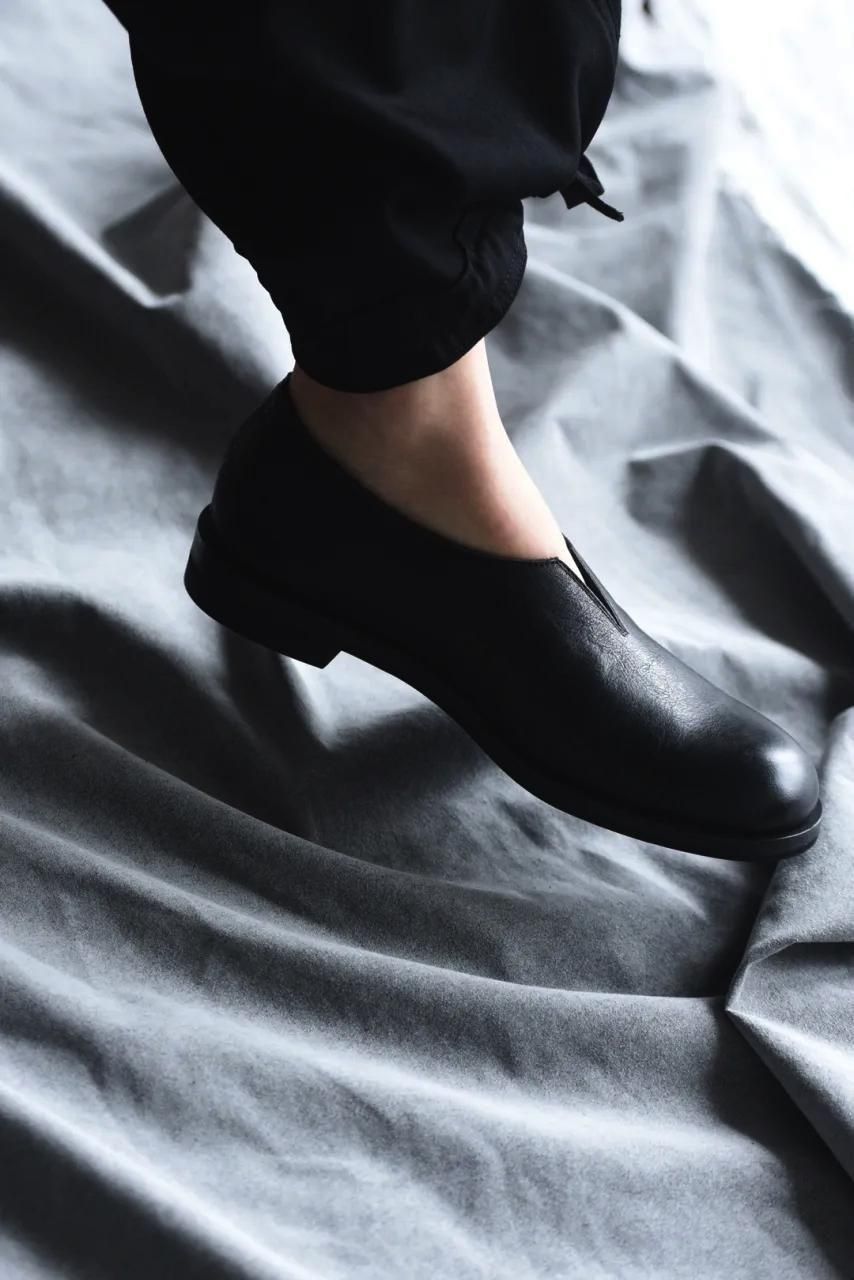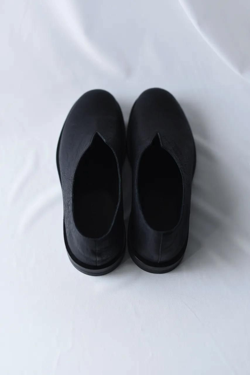 襟のラインに角を取ったディテールを落とし込んだレザーシューズ。