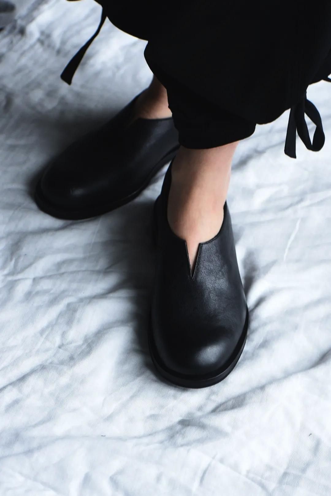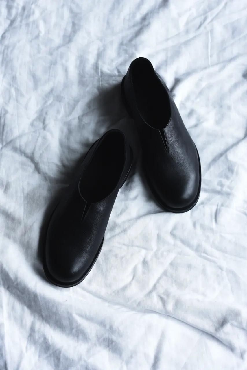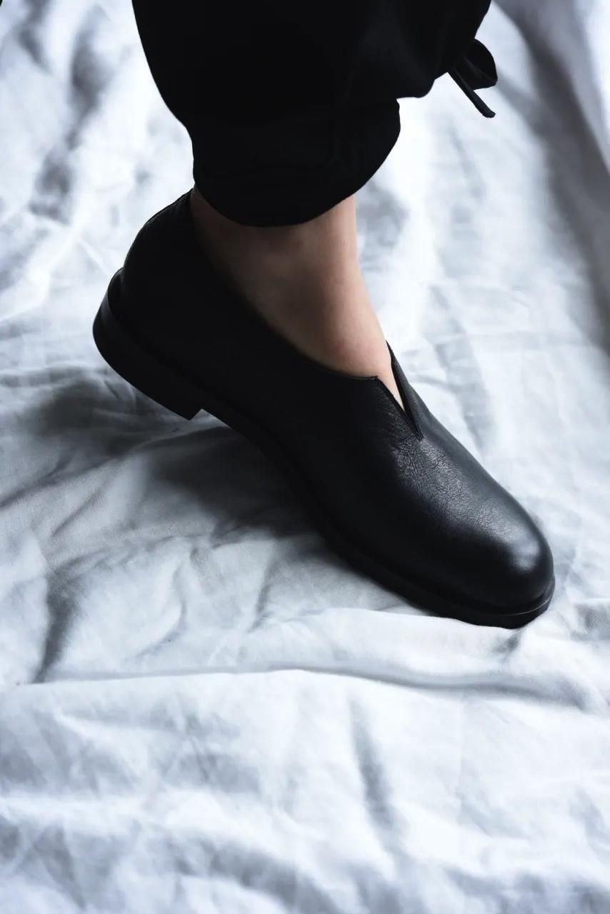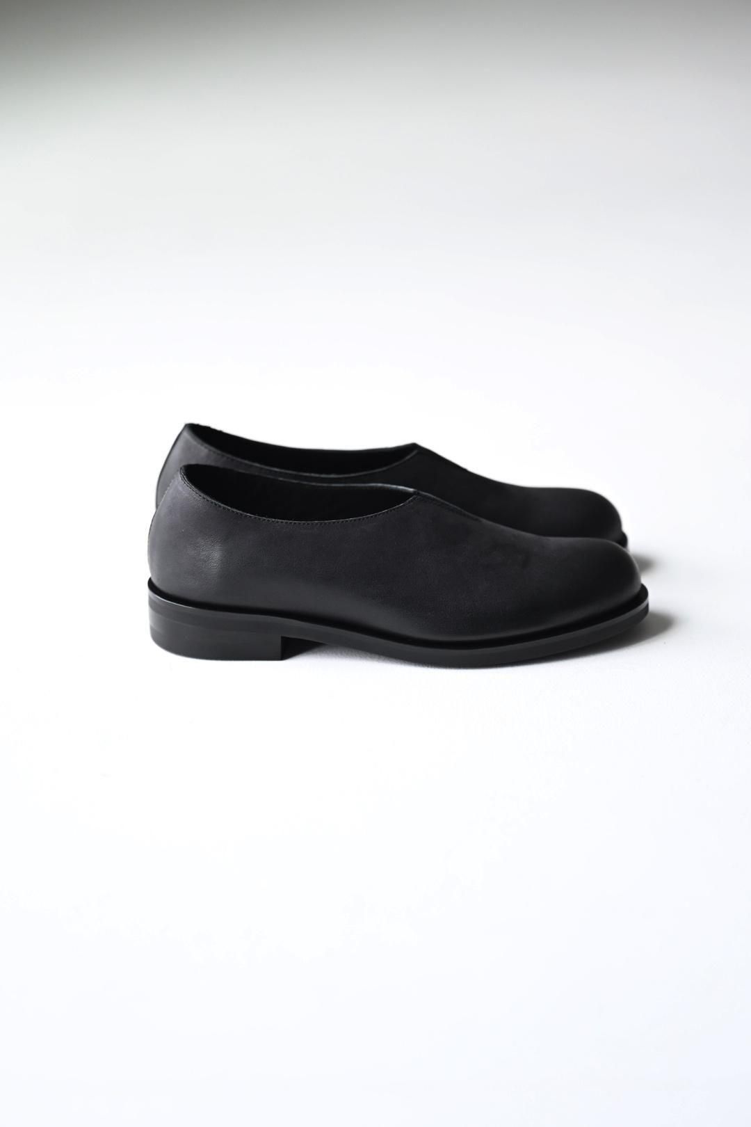 襟のラインに角を取ったディテールを落とし込んだレザーシューズ。
