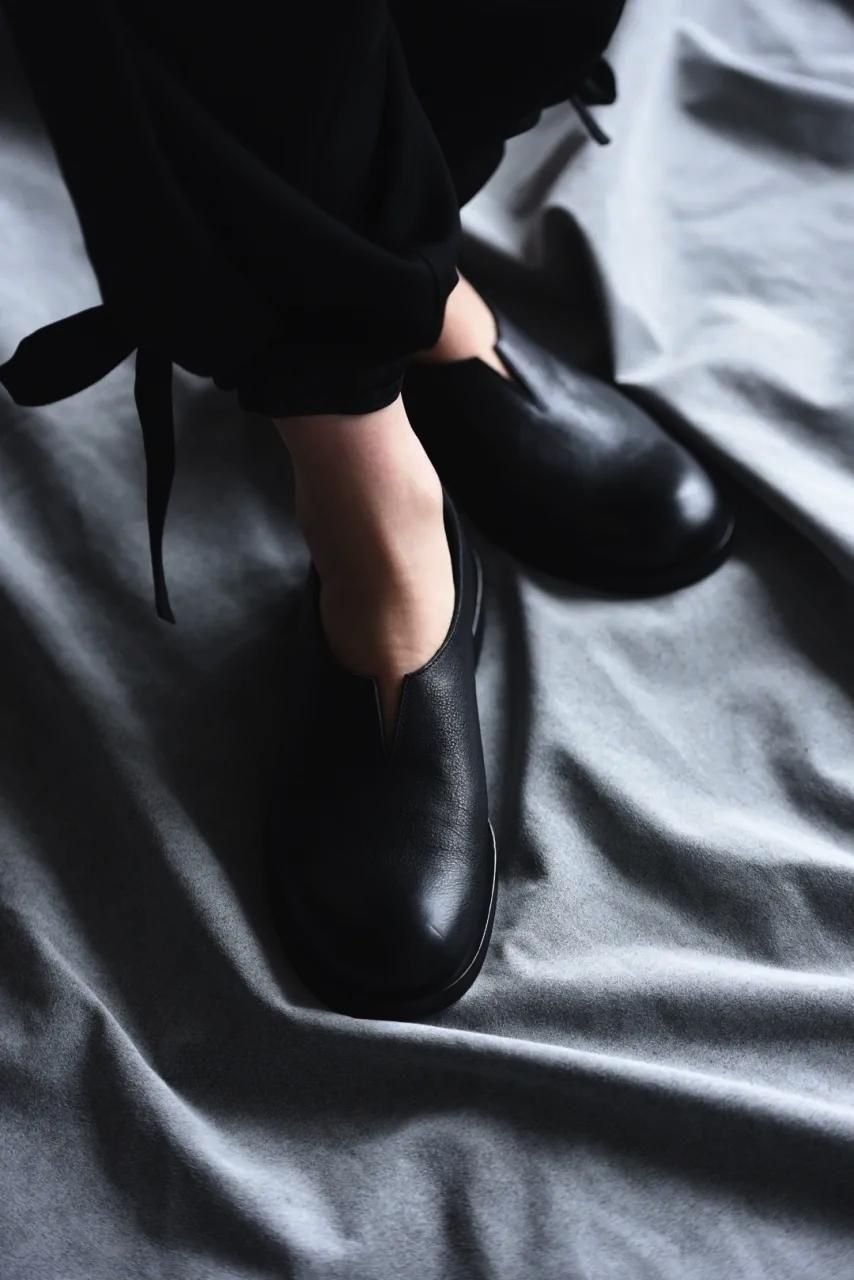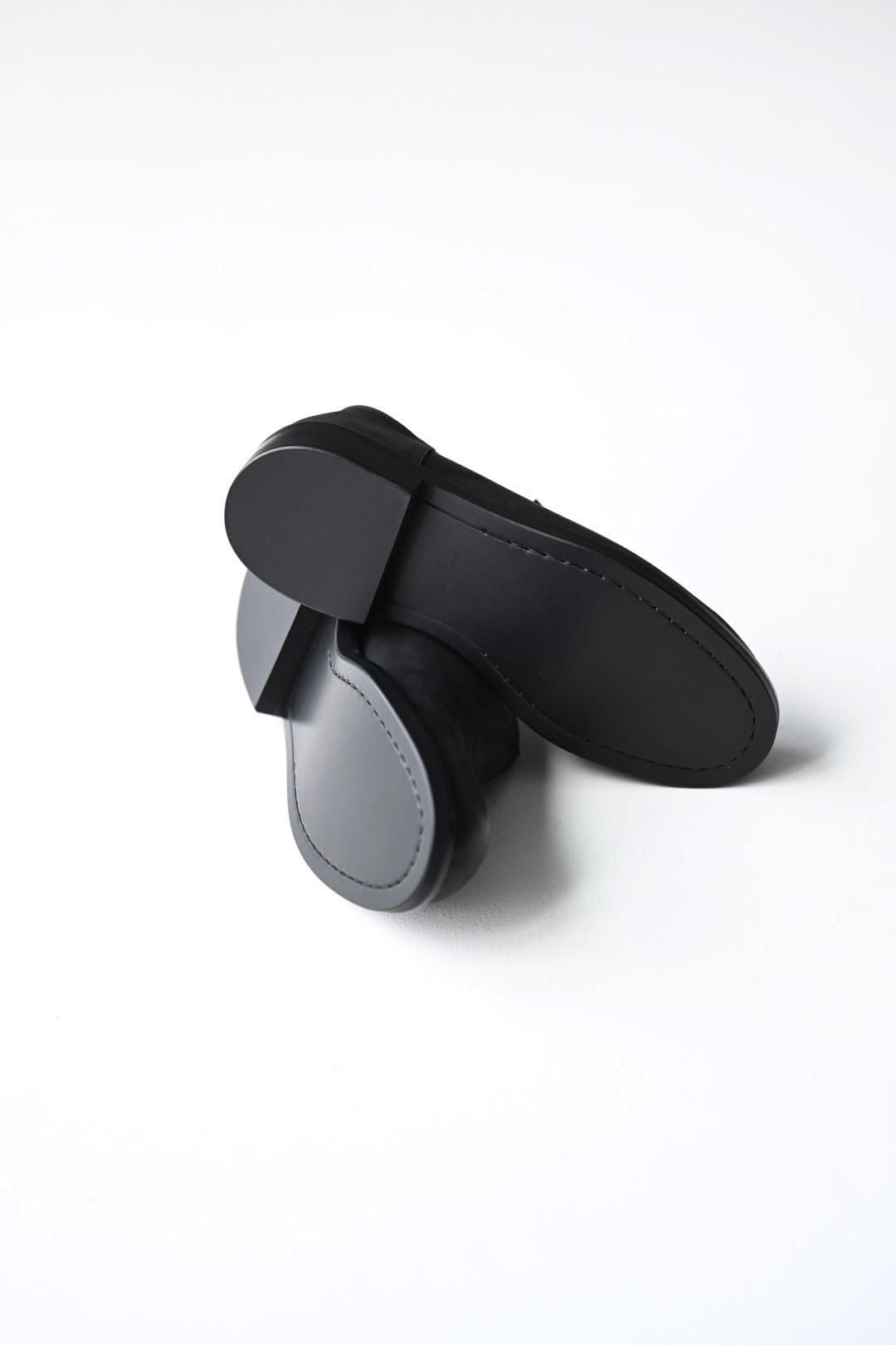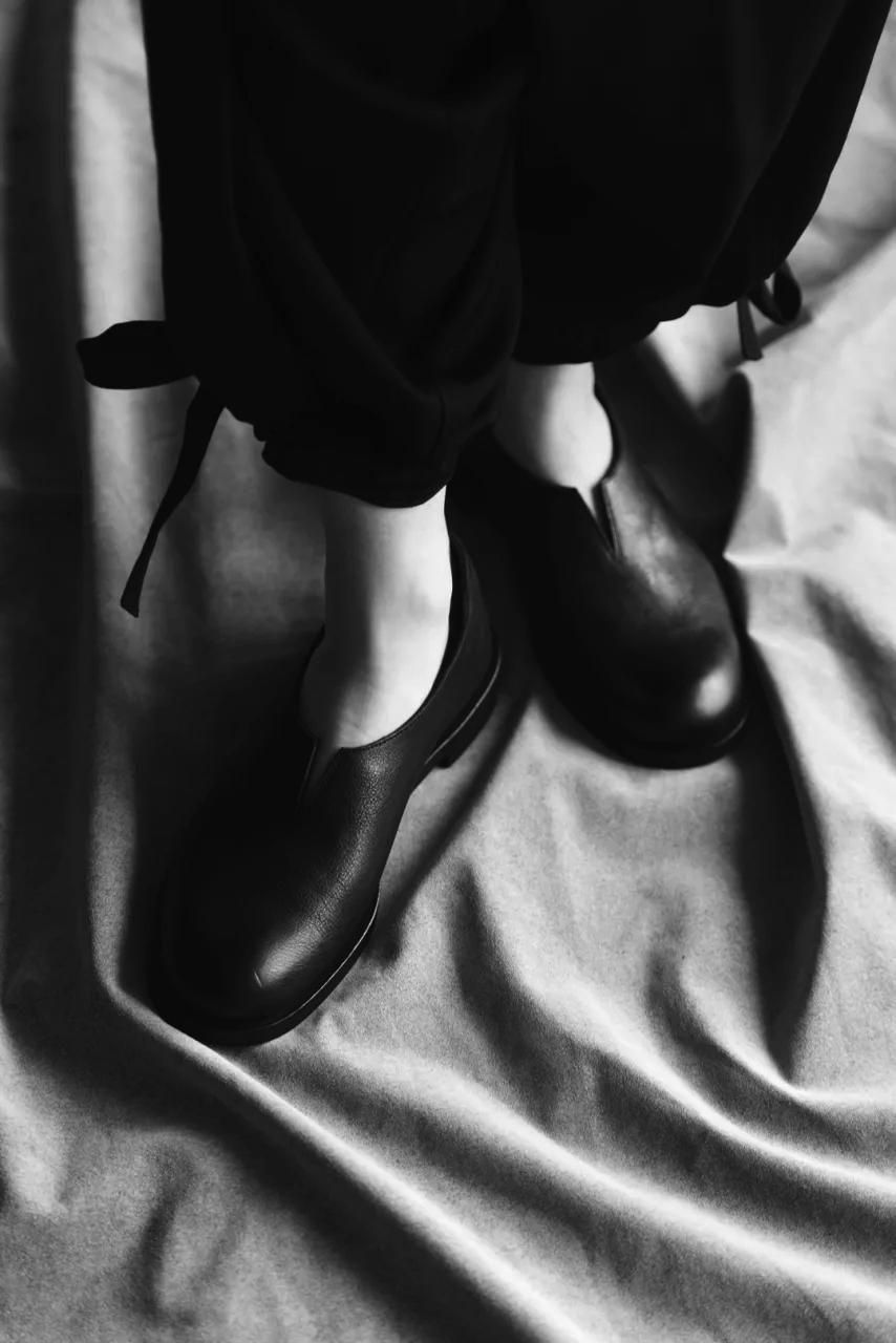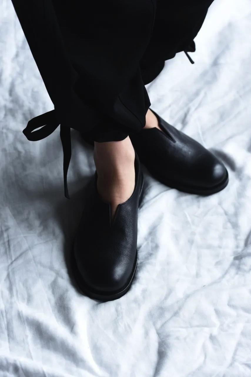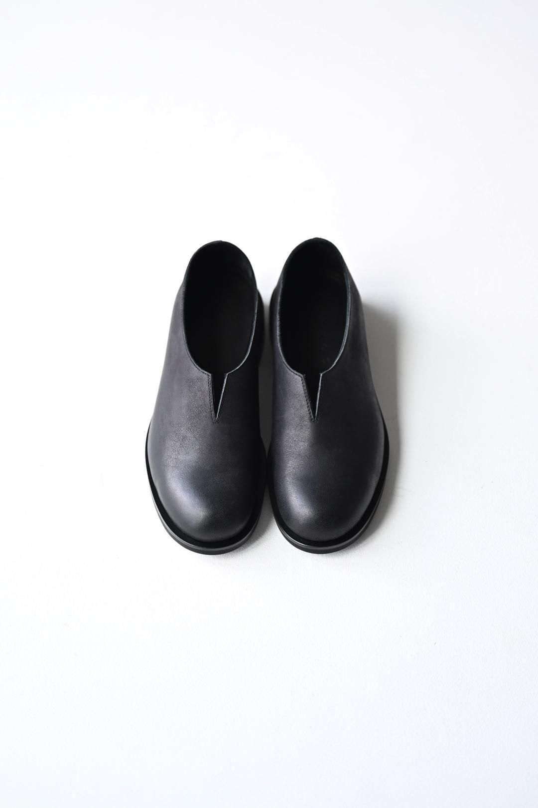襟のラインに角を取ったディテールを落とし込んだレザーシューズ。