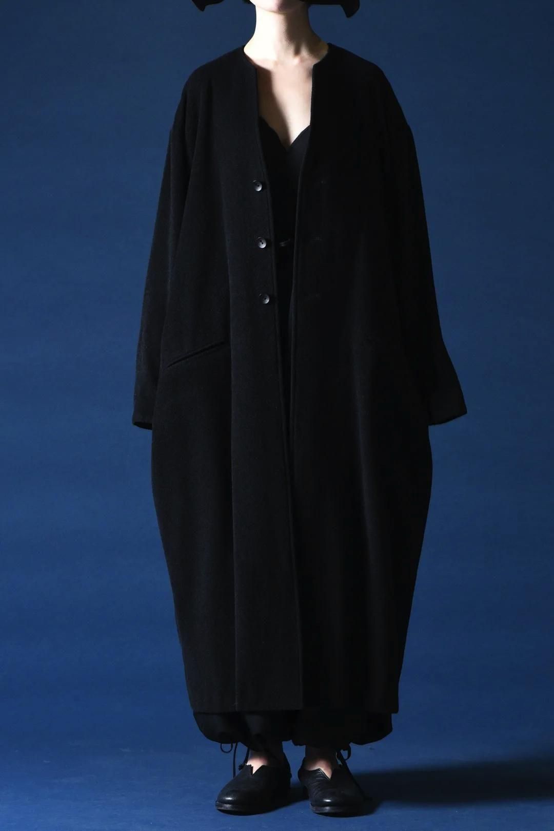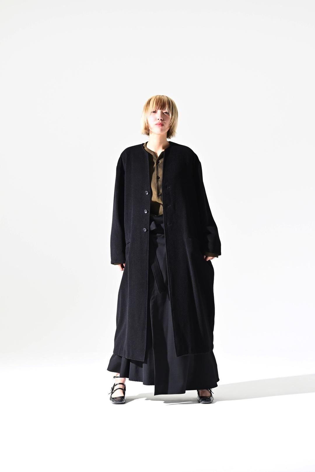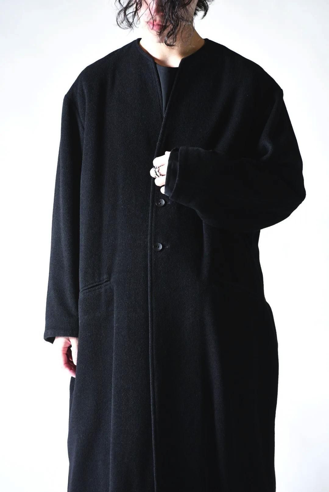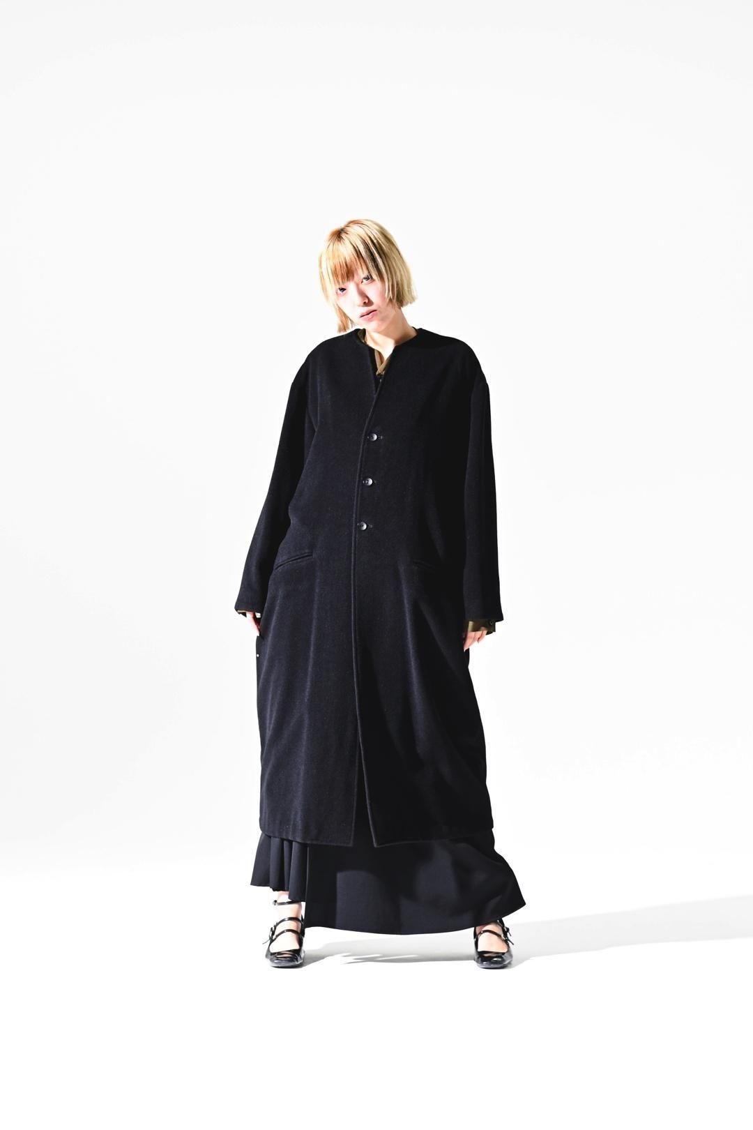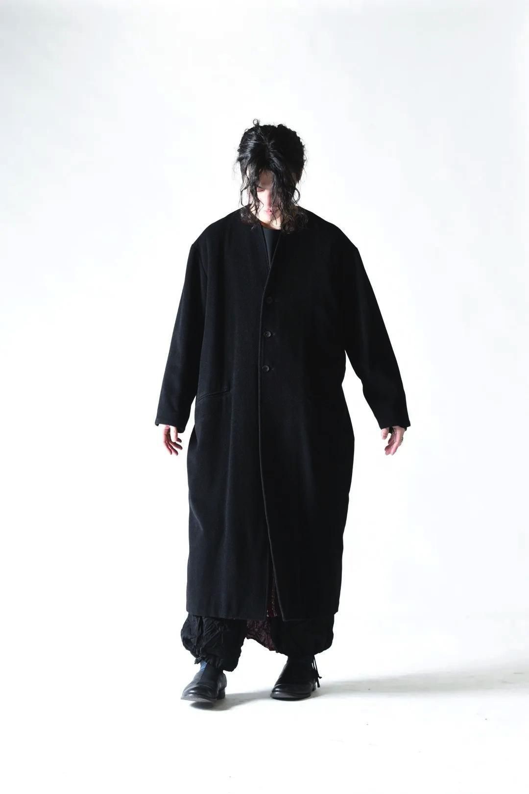 カタチはBISHOOLがシャツやプルオーバー、革靴にも採用する角のついたラペルデザインが印象的なノーカラーコート。