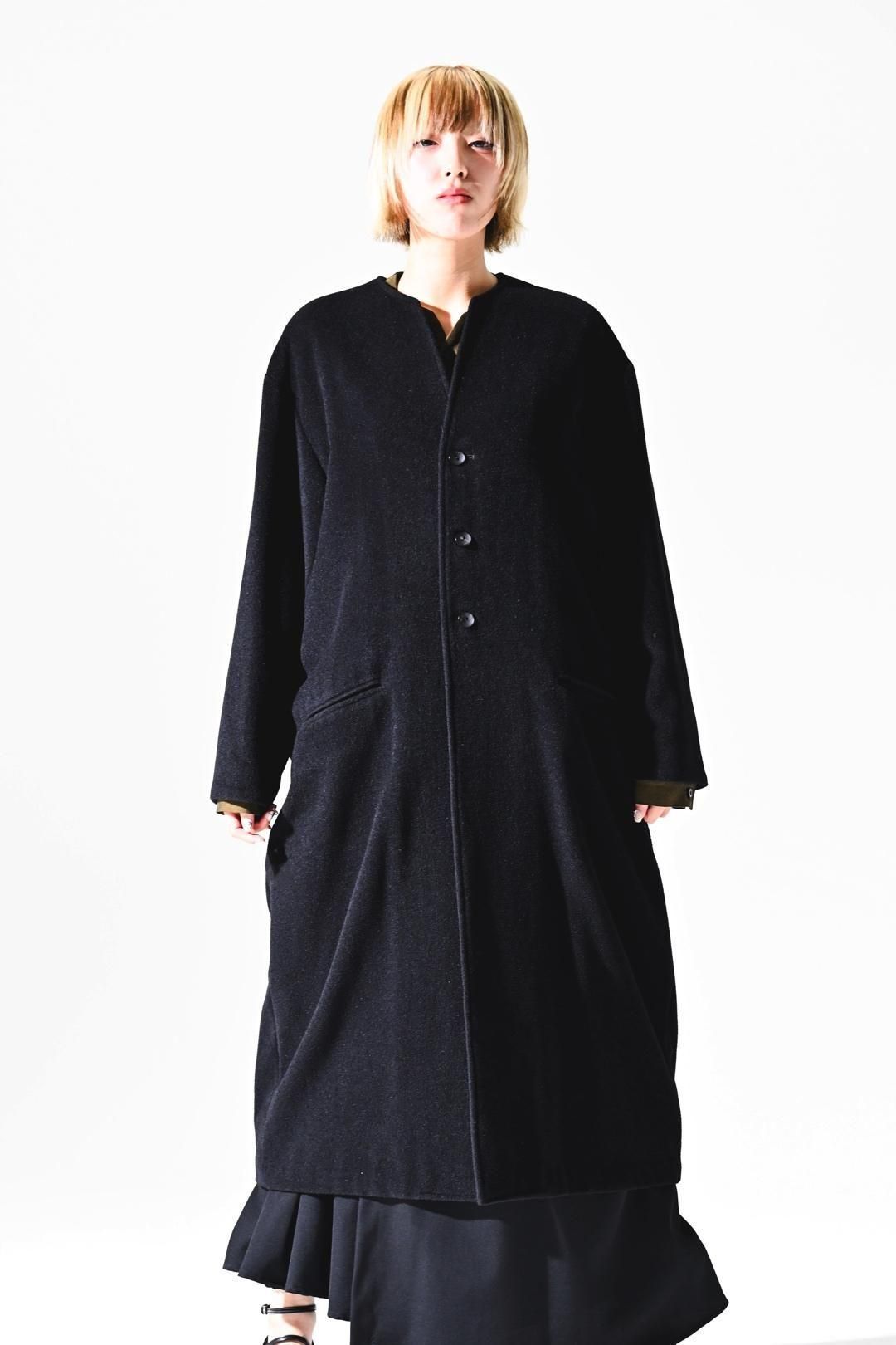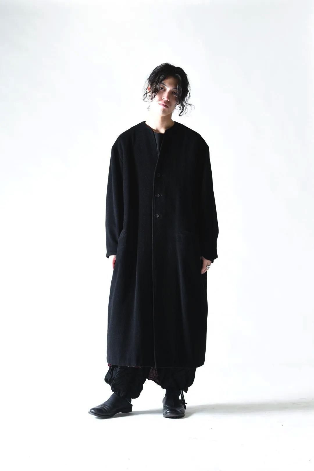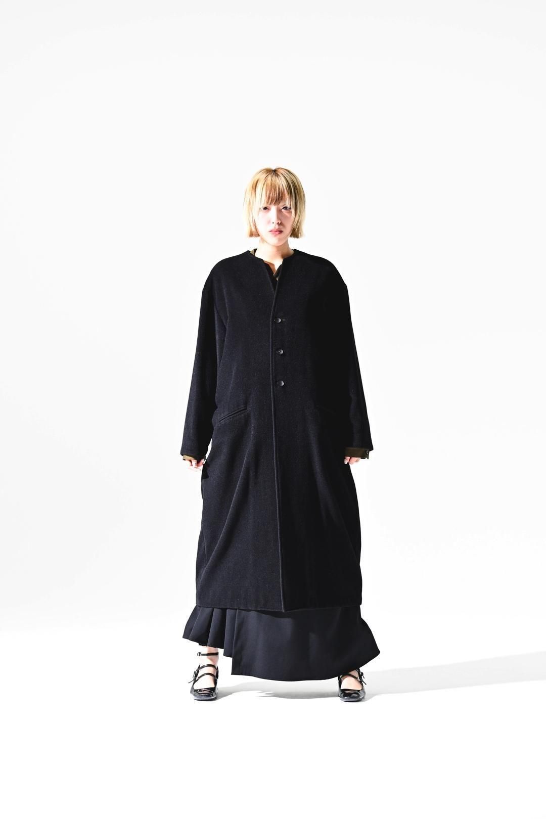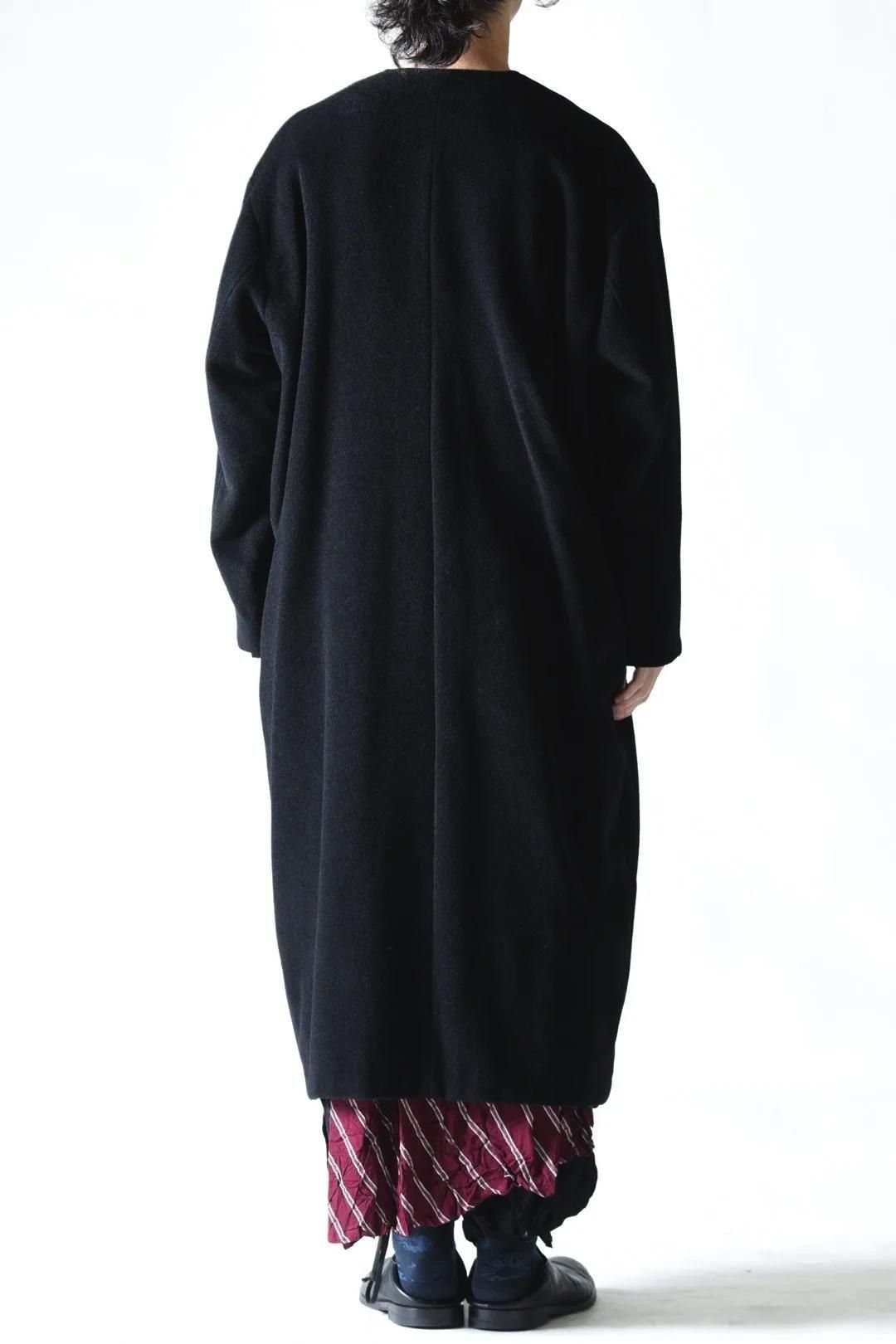 カタチはBISHOOLがシャツやプルオーバー、革靴にも採用する角のついたラペルデザインが印象的なノーカラーコート。
