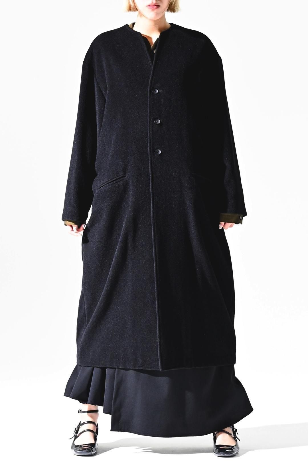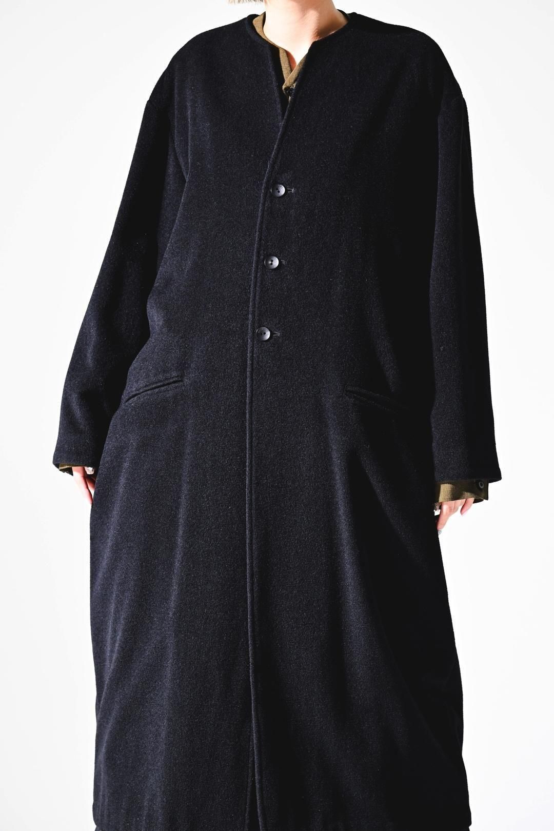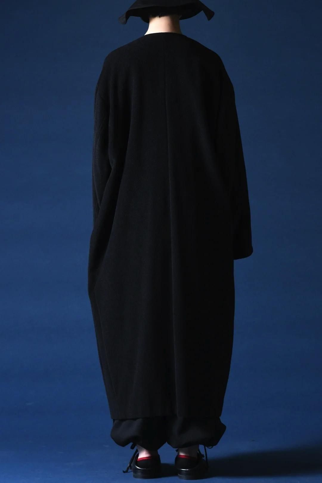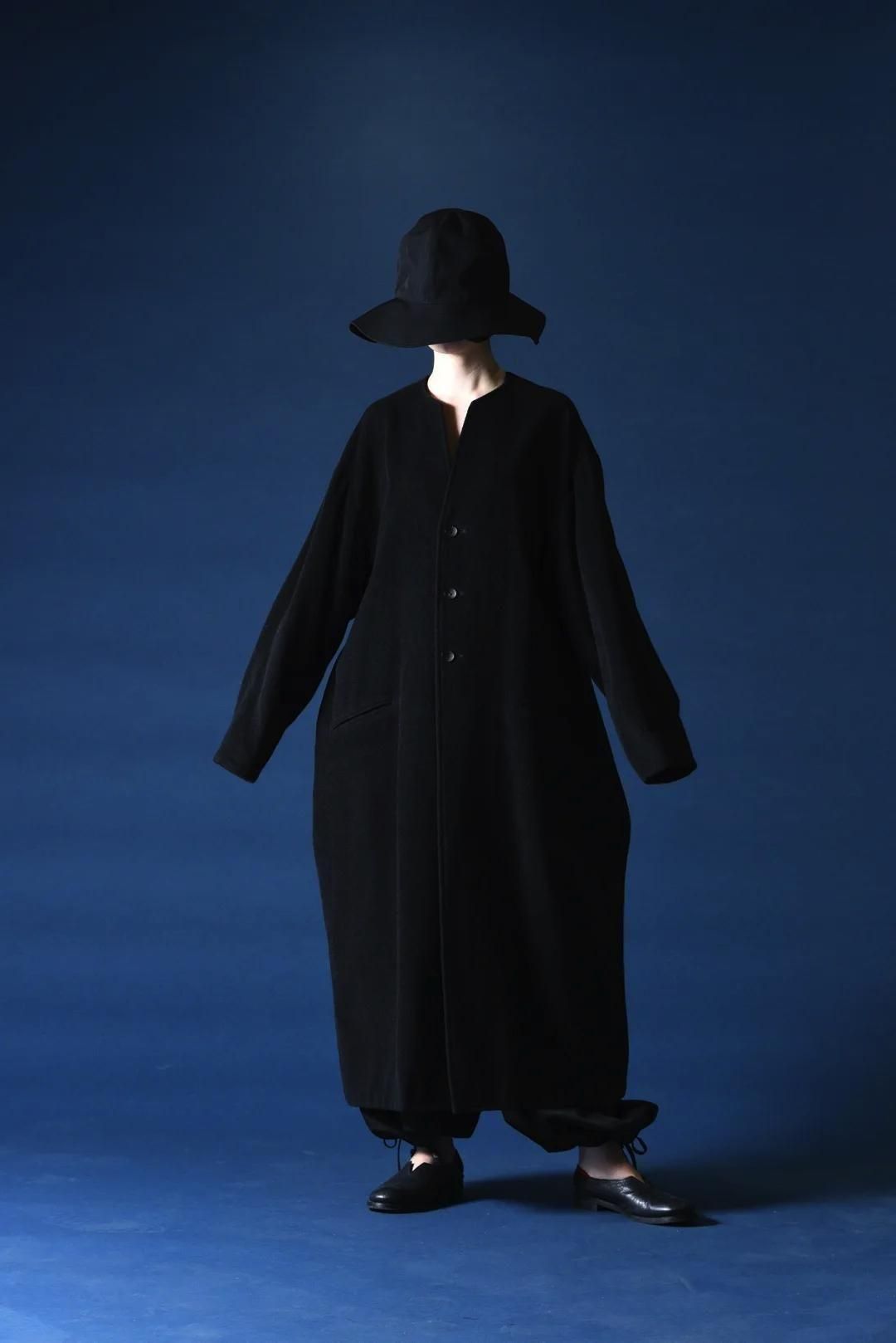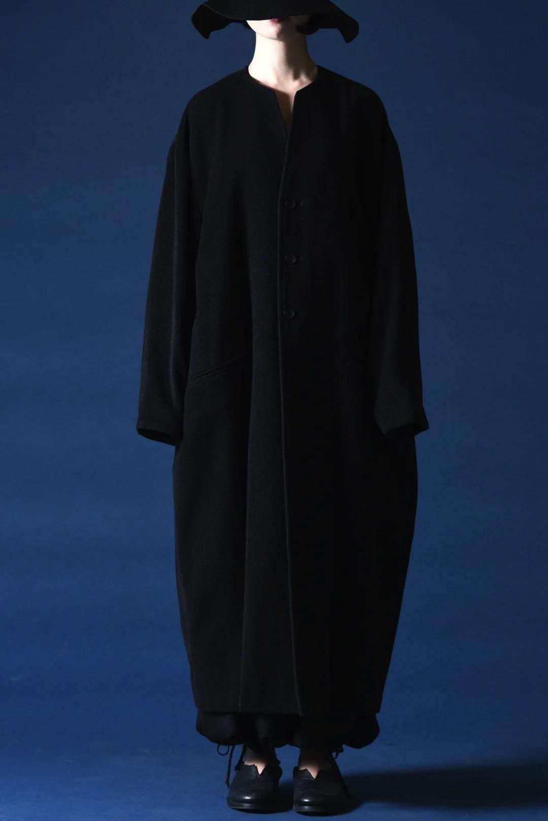 カタチはBISHOOLがシャツやプルオーバー、革靴にも採用する角のついたラペルデザインが印象的なノーカラーコート。