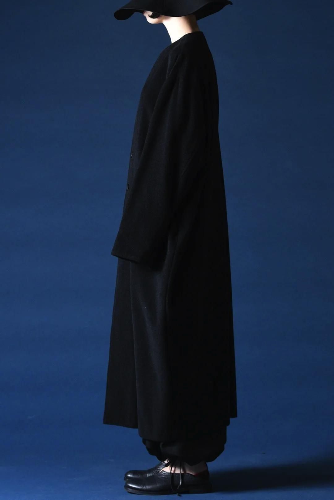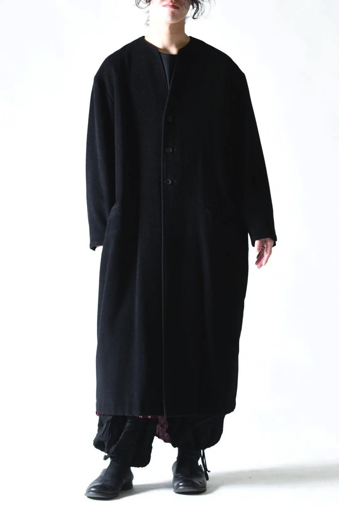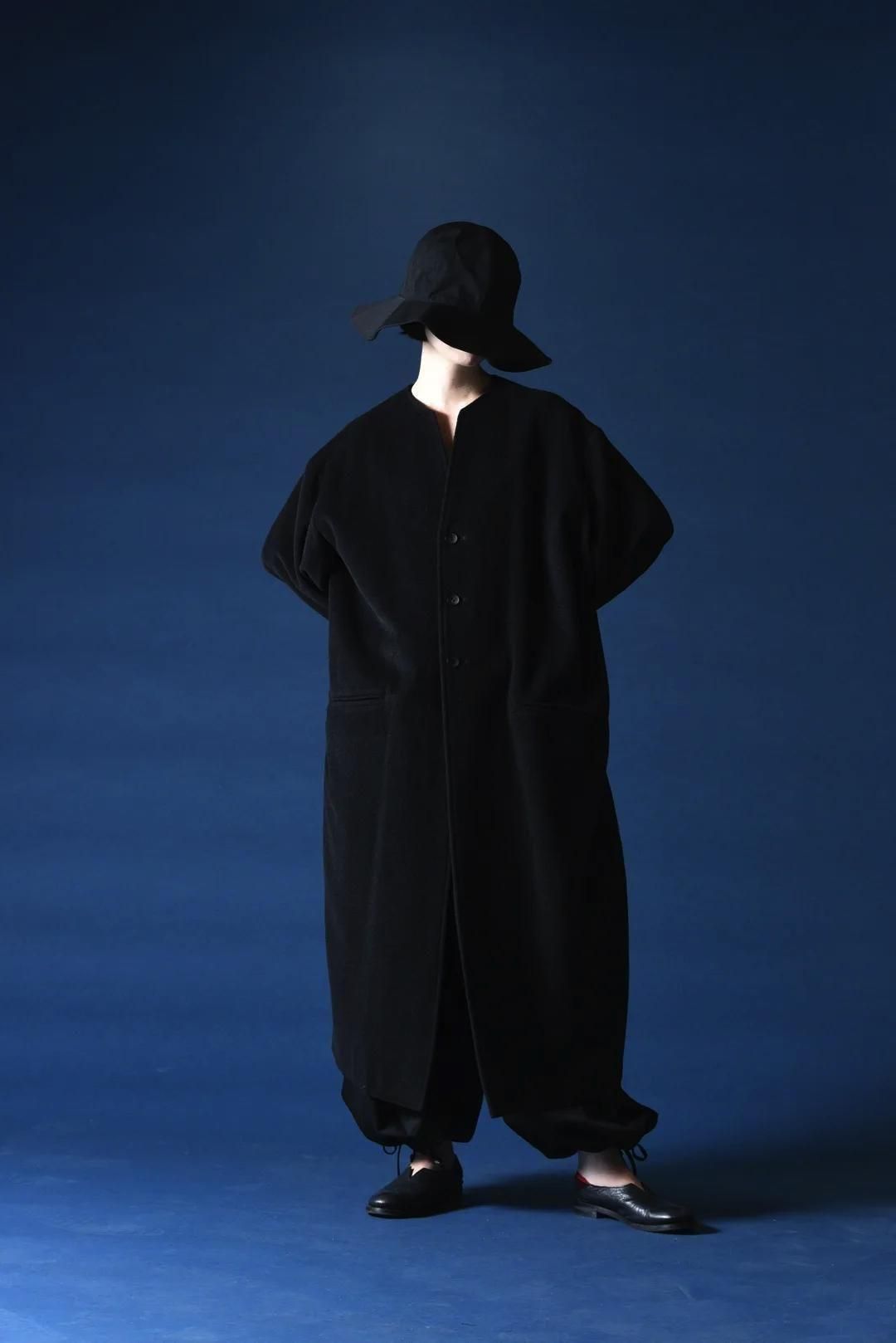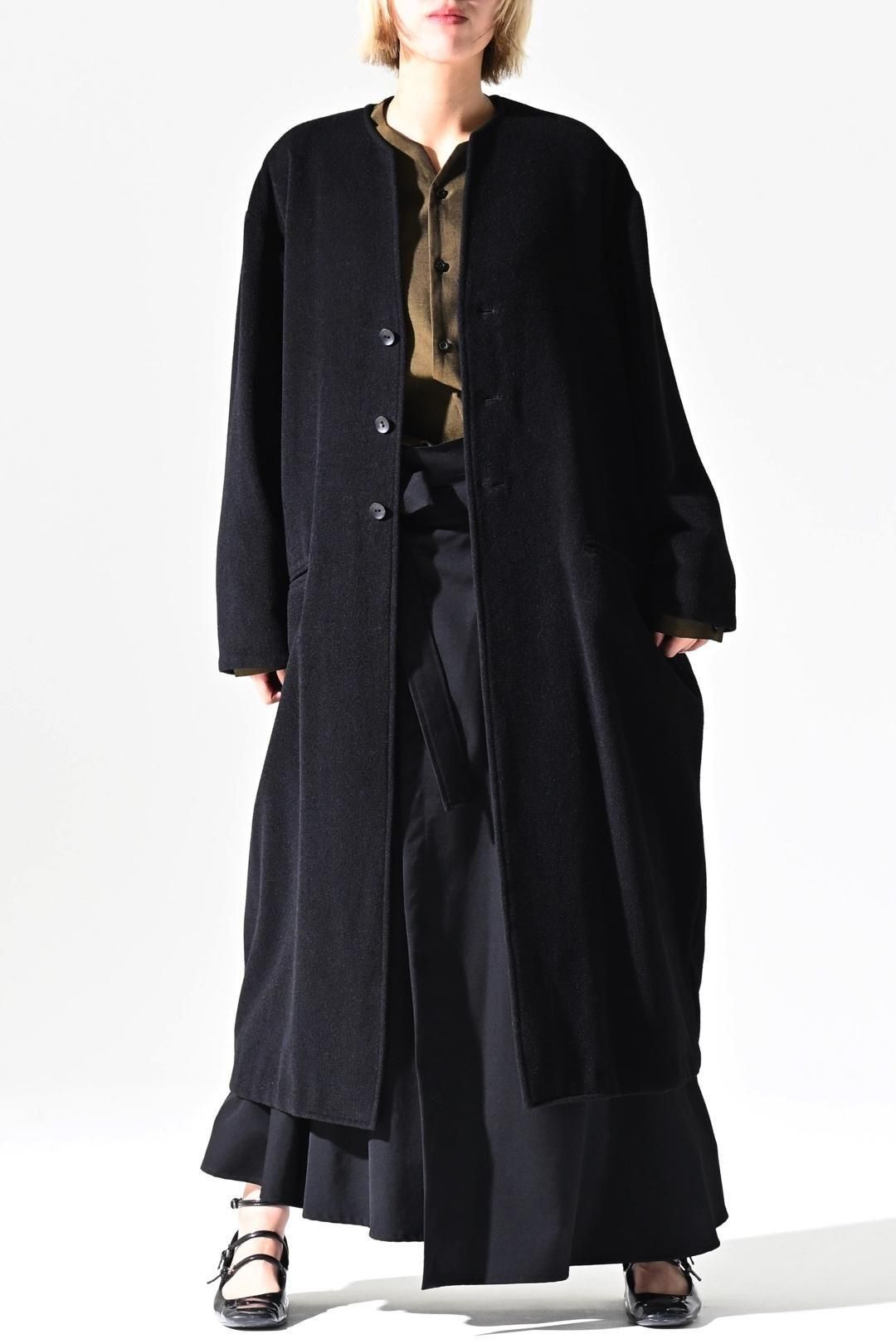 カタチはBISHOOLがシャツやプルオーバー、革靴にも採用する角のついたラペルデザインが印象的なノーカラーコート。