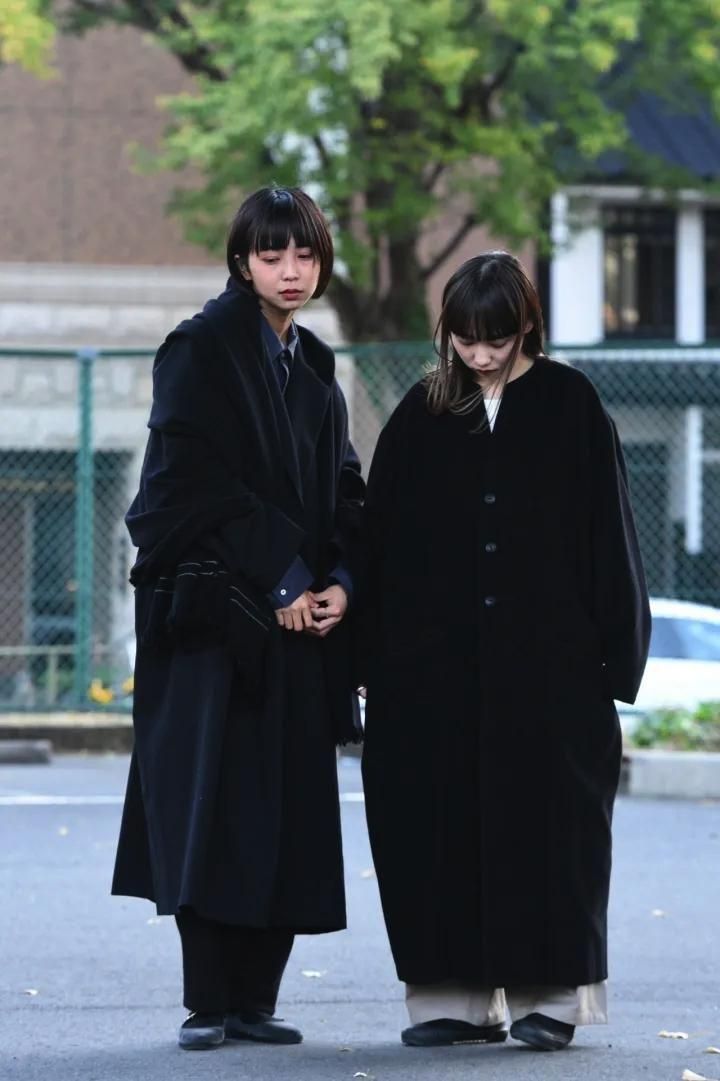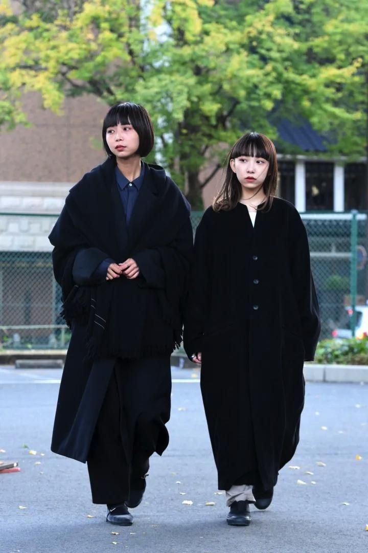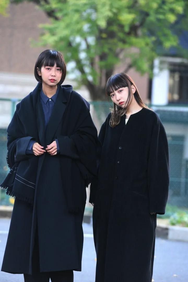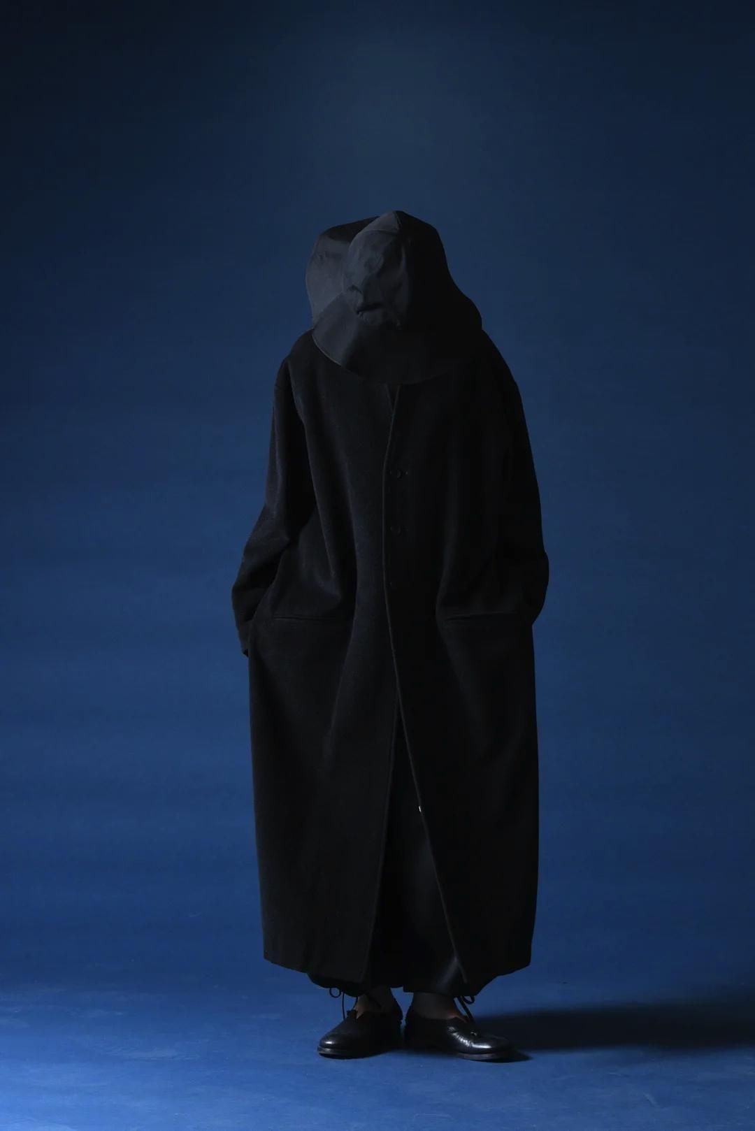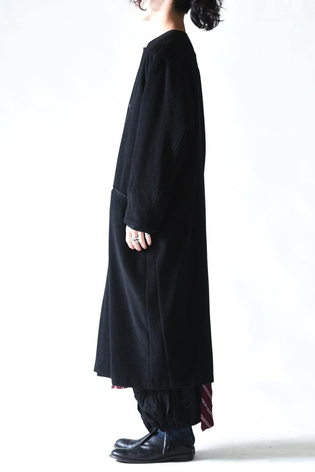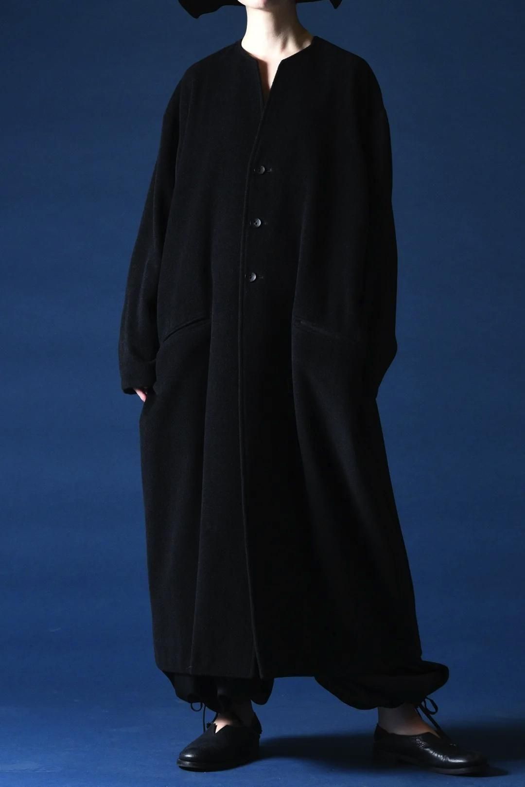カタチはBISHOOLがシャツやプルオーバー、革靴にも採用する角のついたラペルデザインが印象的なノーカラーコート。
